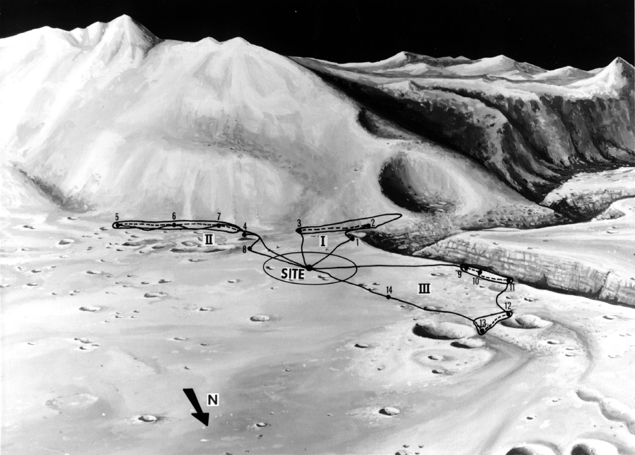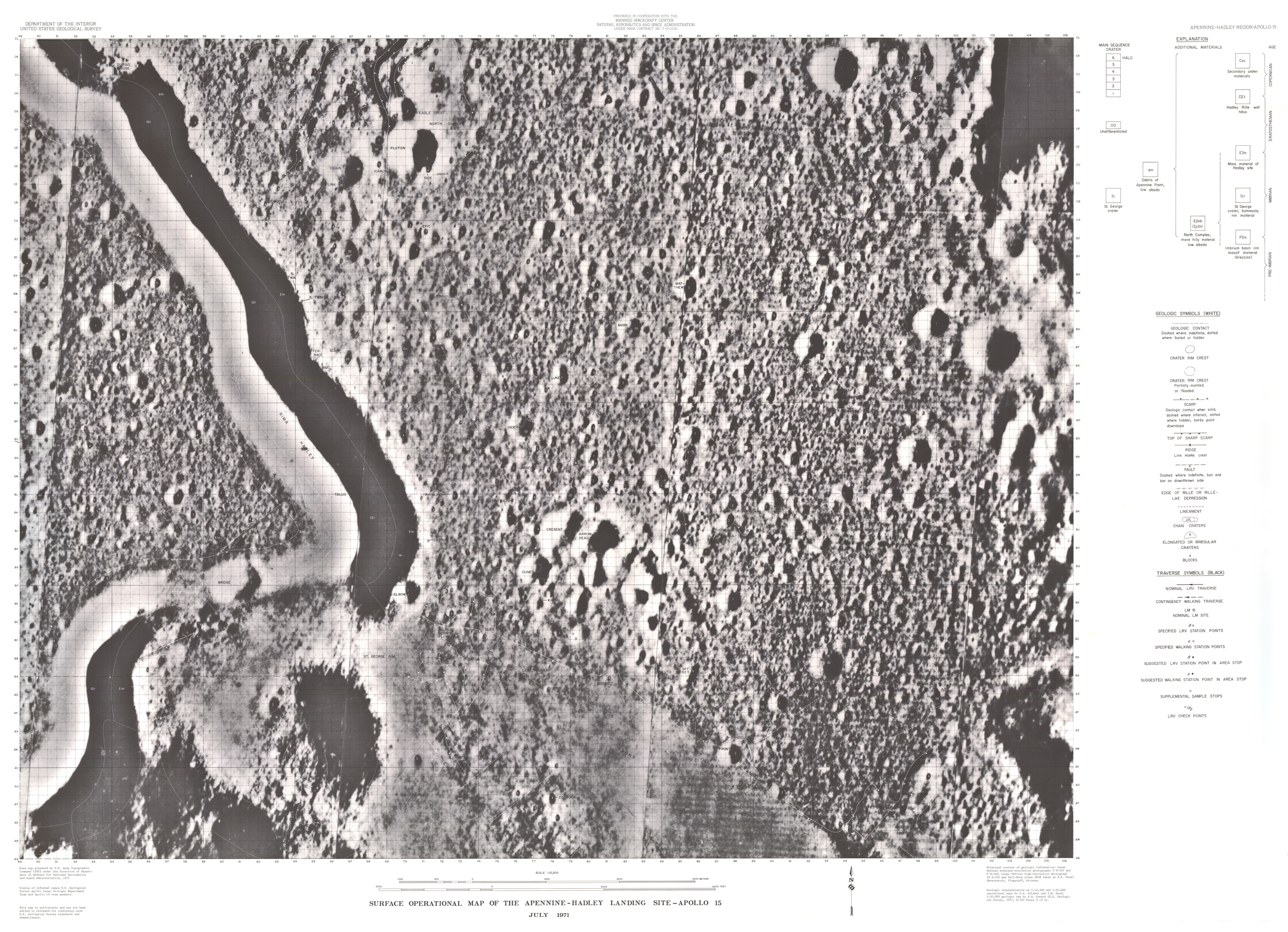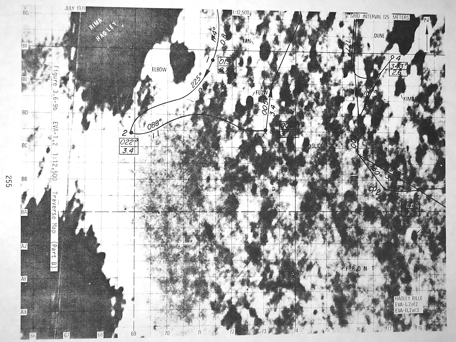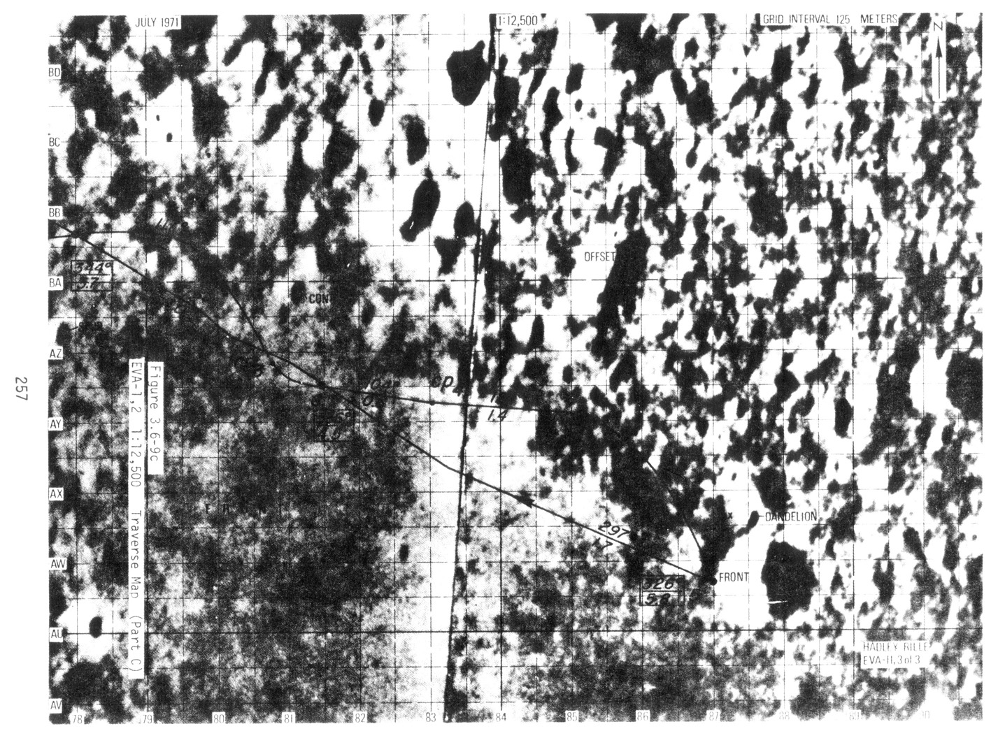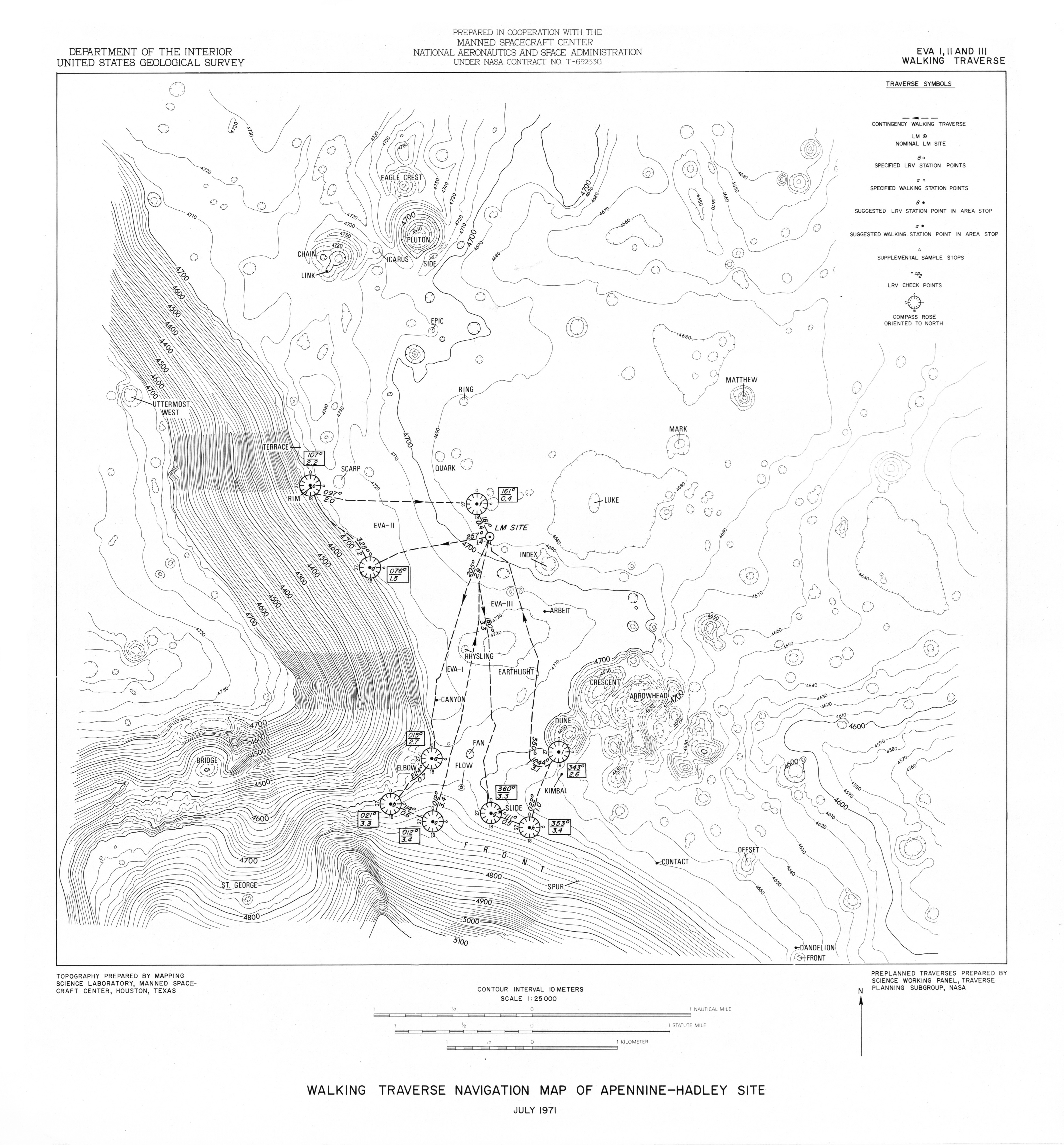 Scans organized by Ken Glover from a chart provided by David Portree, USGS FlagstaffWalking Traverse Navigation Map of Apennine-Hadley Site, July 1971 ( 1.3 Mb PDF or 2.6 Mb JPEG )