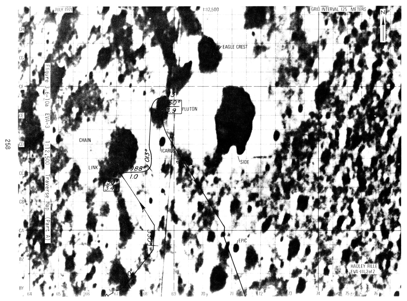 Page 258 from the Apollo 15 Lunar Surface Procedures volume, showing the North Complex.Post-Flight Apollo 15 Traverse Map ( 1.1Mb )
