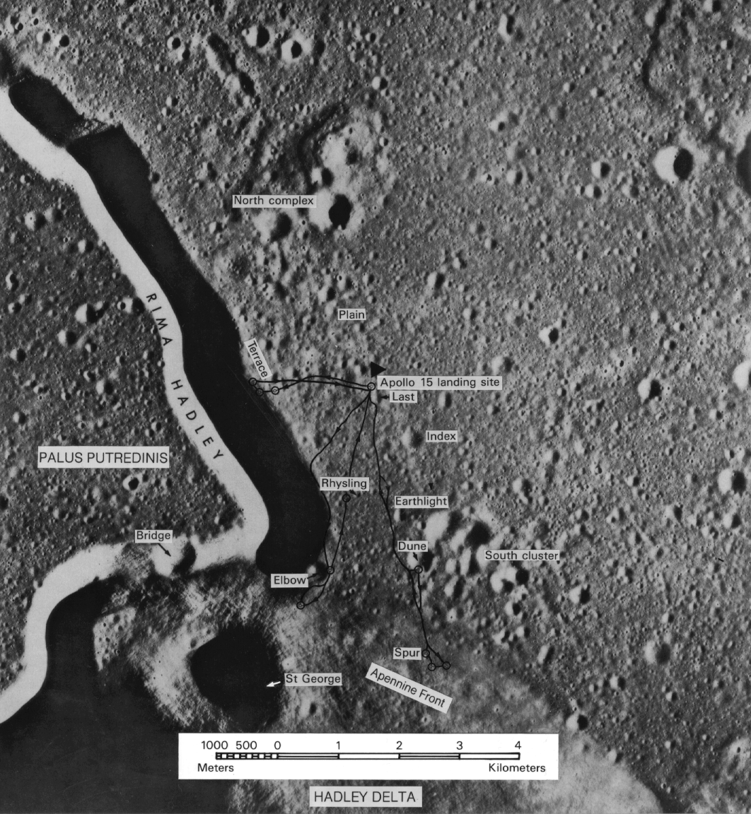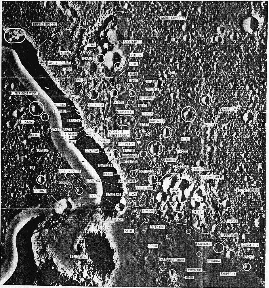 This labeled, pre-flight photo shows all the feature names chosen by Joe Allen and the crew.Surface Operational Map of the Apennine-Hadley Landing Site - Apollo 15, July 1971 ( 6 Mb PDF or 9 Mb JPEG or 1.7 Mb JPEG )