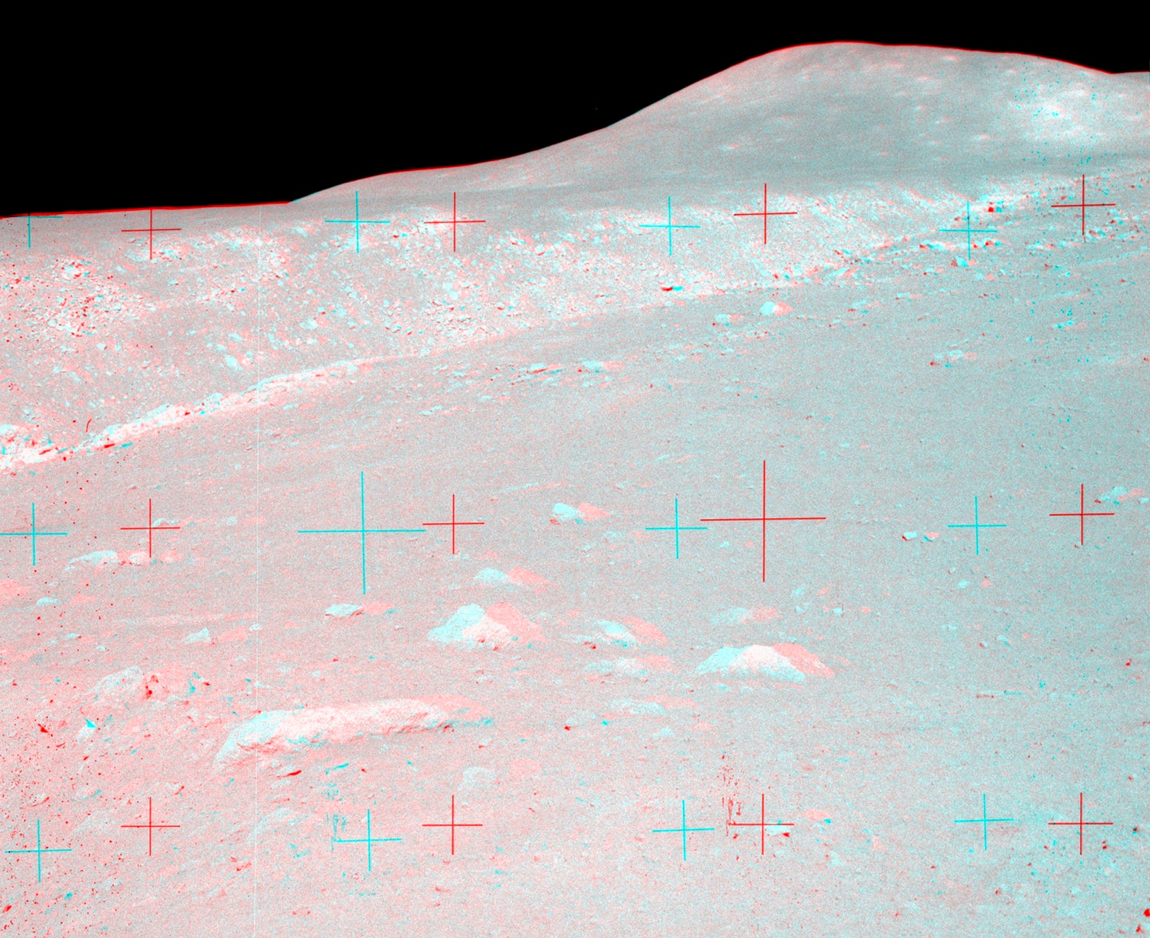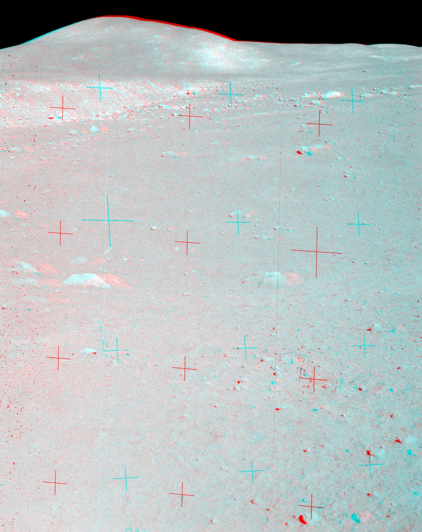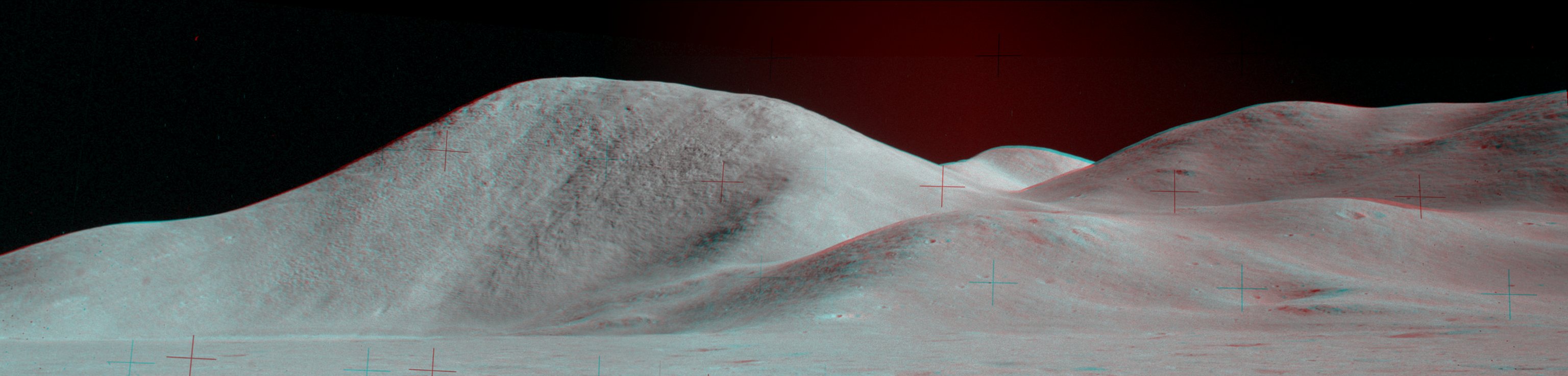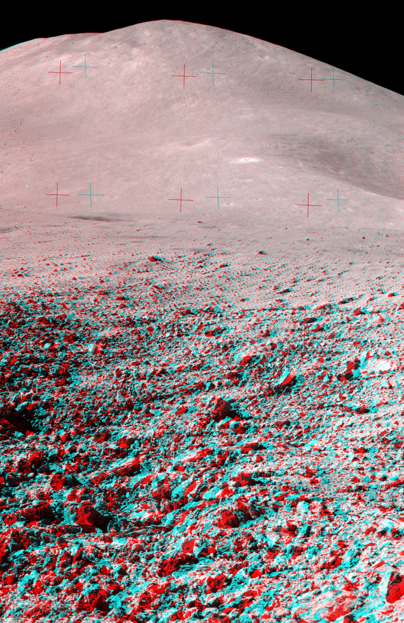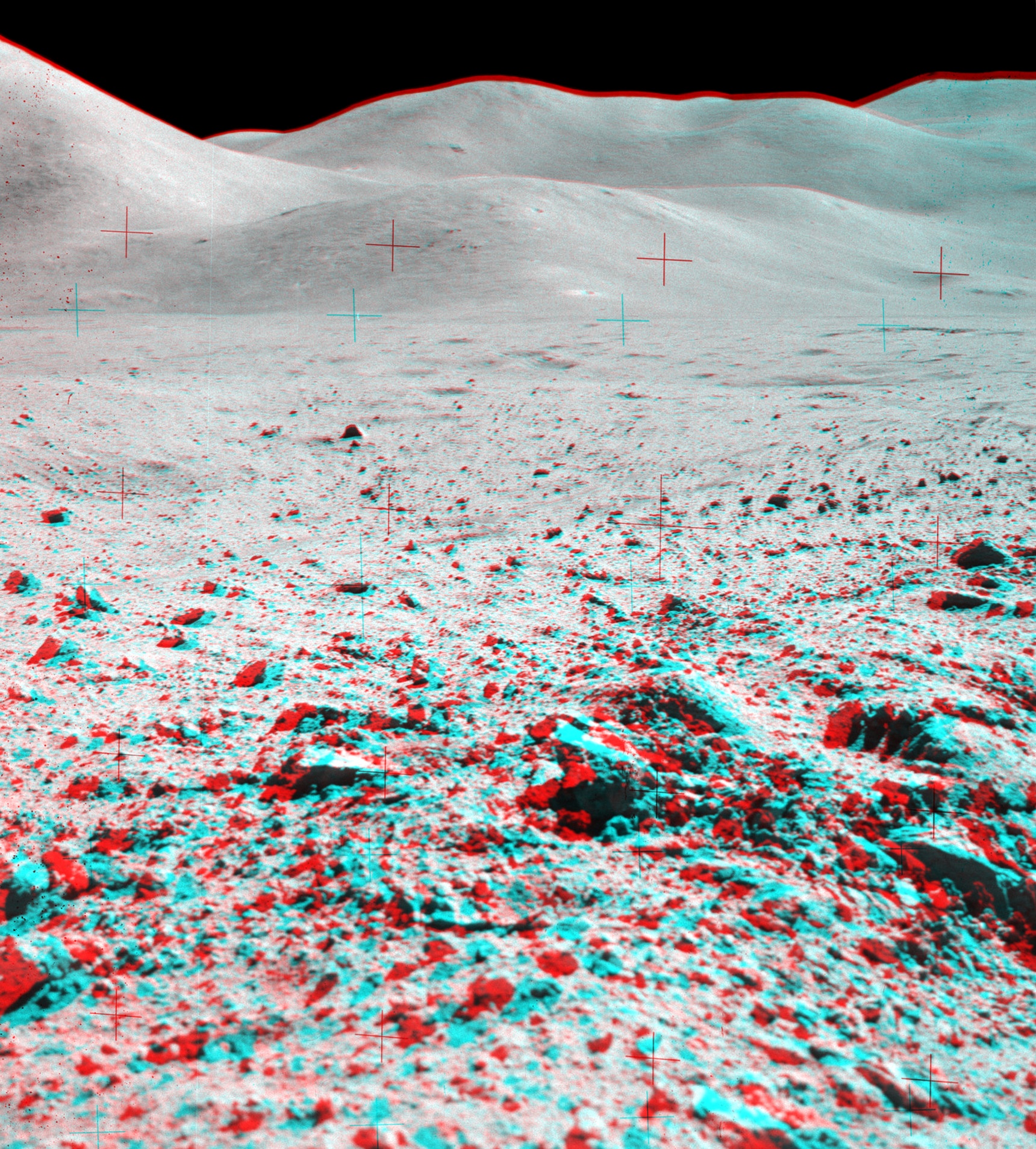 Anaglyphs in the image libraries created from sequential panorama frames by the ALSJ editor exist only because of Yuri Krasilnikov's willingness to teach me the art. Whatever value the anaglyphs have is due to Yuri's insights and guidance. Flaws are my doing. Briefly, panorama stitching software Hugin is used to create both non-stereo pan assemblies and remapped versions of the images. The latter are then made into anaglyphs using GIMP. The individual remapped images are linked from the corresponding Library entries for the original frames. The remapped images can be used to create stereo views using other methods.