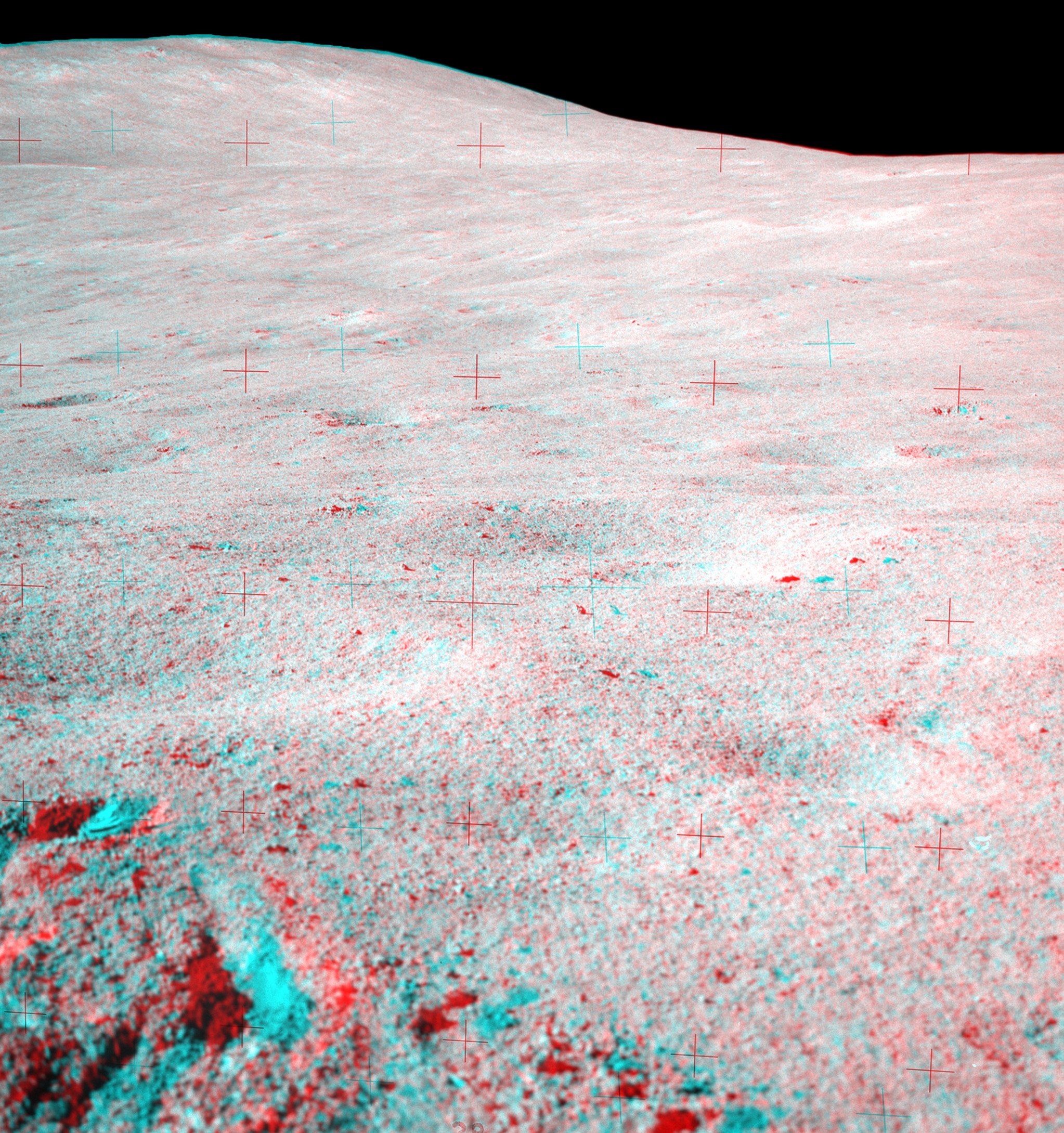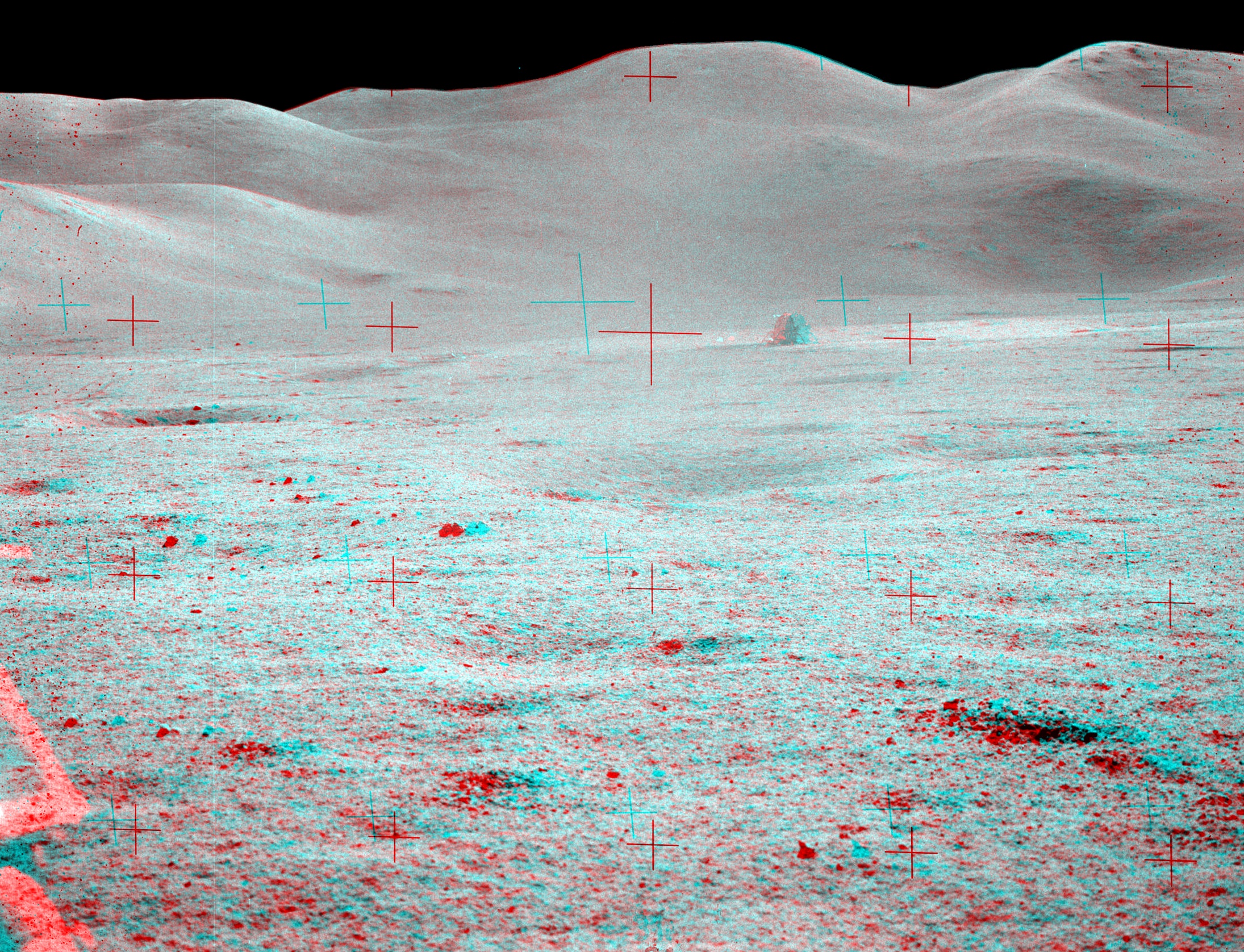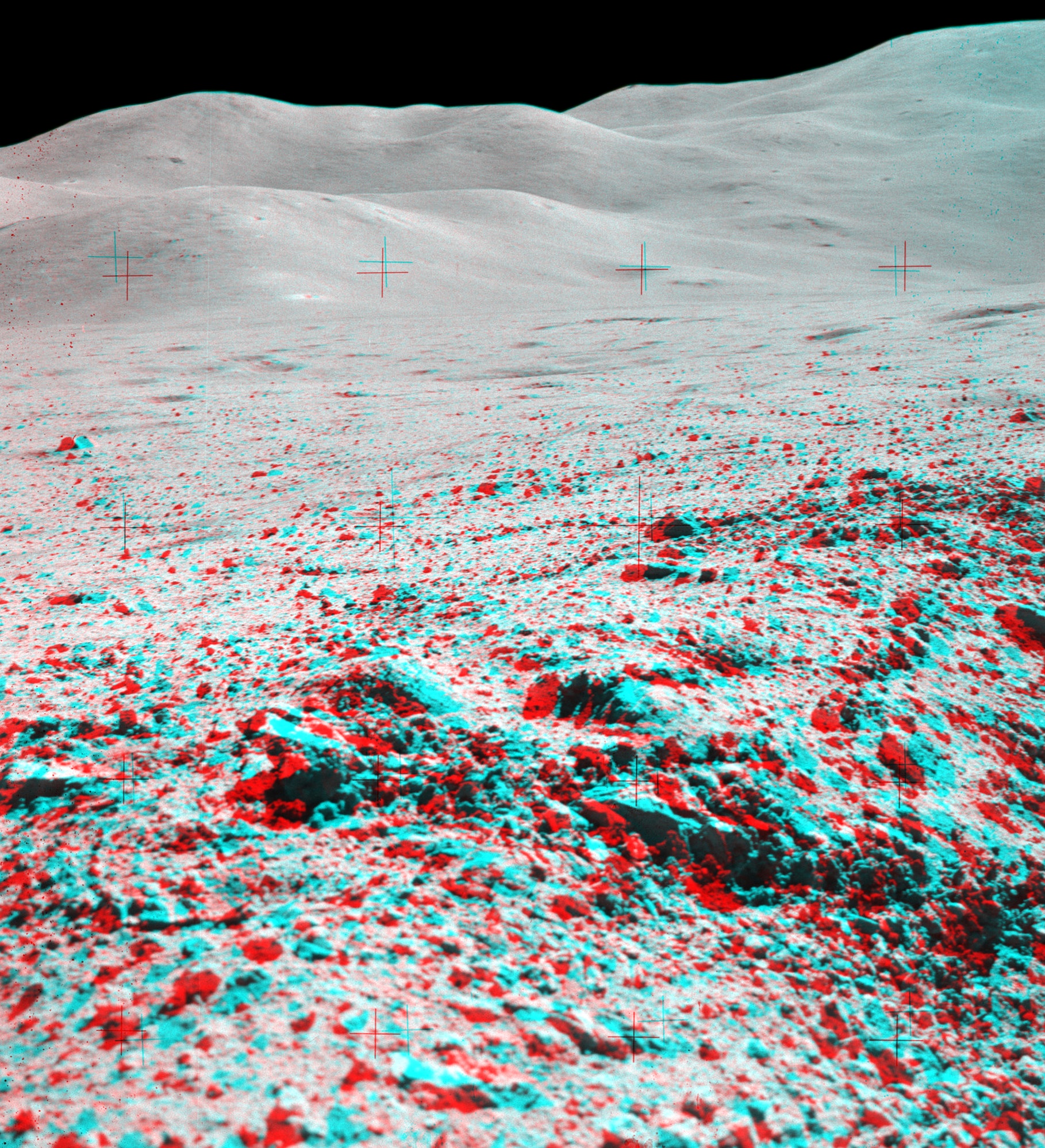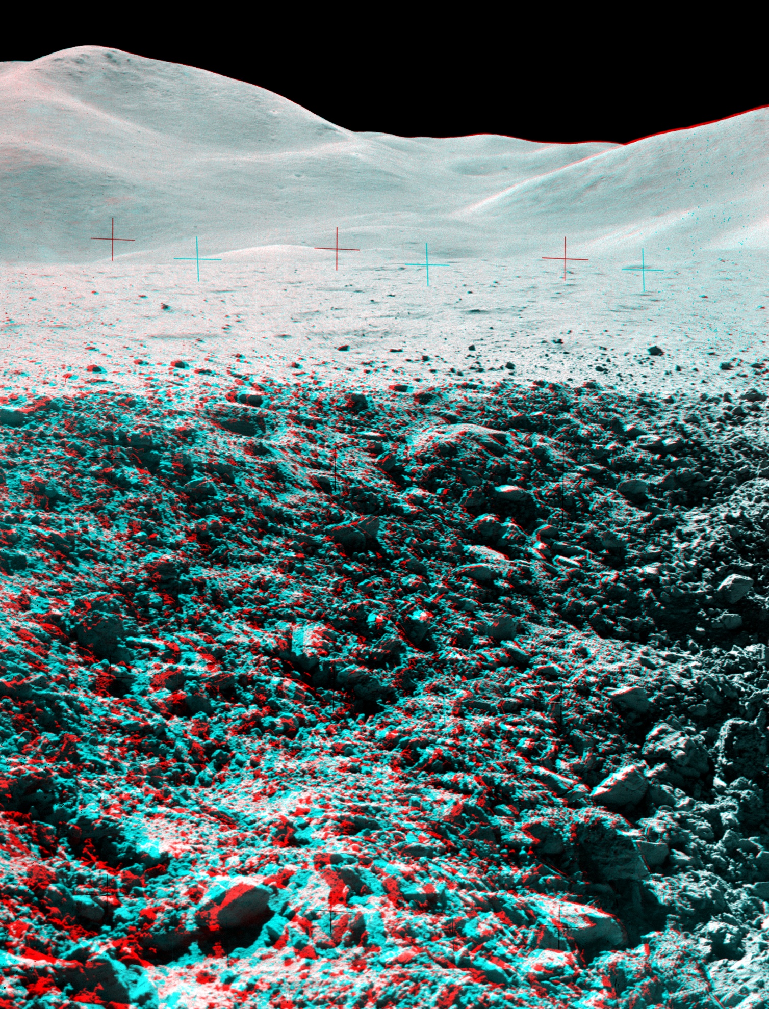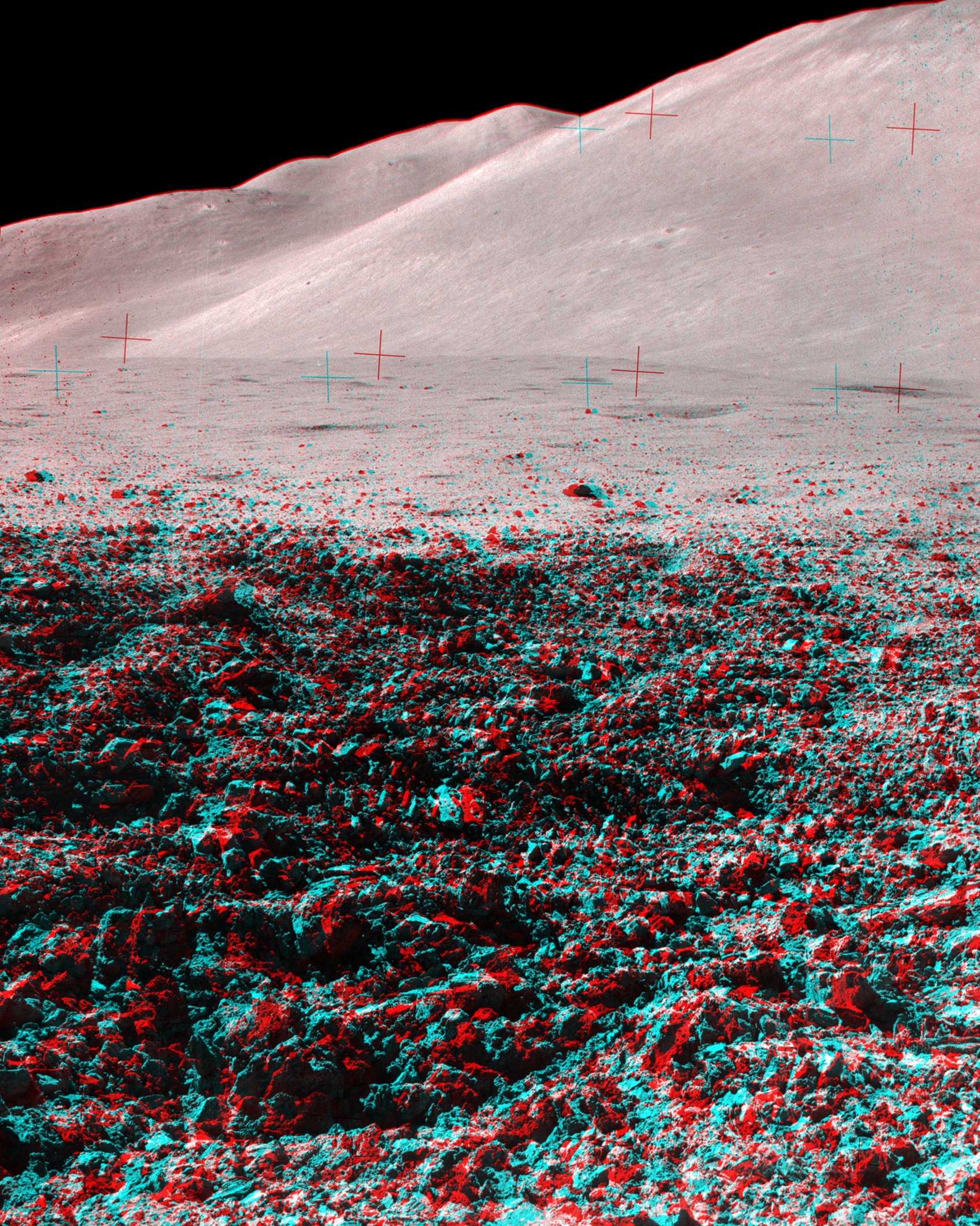 Anaglyphs in the image libraries created from sequential panorama frames by the ALSJ editor exist only because of Yuri Krasilnikov's willingness to teach me the art. Whatever value the anaglyphs have is due to Yuri's insights and guidance. Flaws are my doing. Briefly, panorama stitching software Hugin is used to create both non-stereo pan assemblies and remapped versions of the images. The latter are then made into anaglyphs using GIMP. The individual remapped images are linked from the corresponding Library entries for the original frames. The remapped images can be used to create stereo views using other methods.