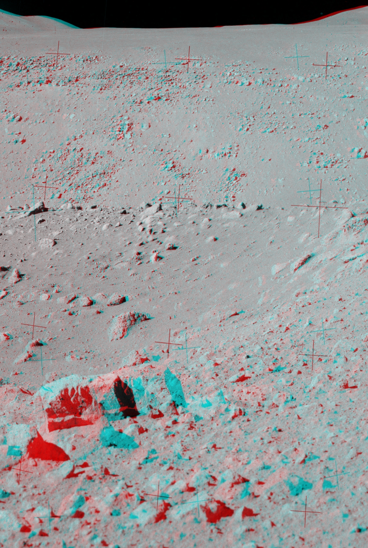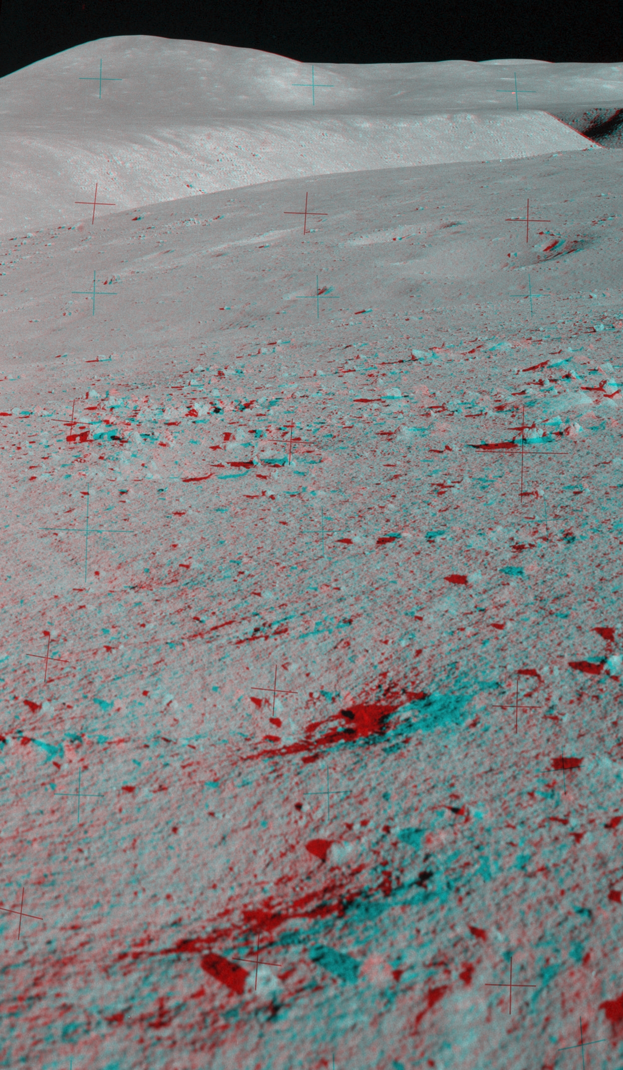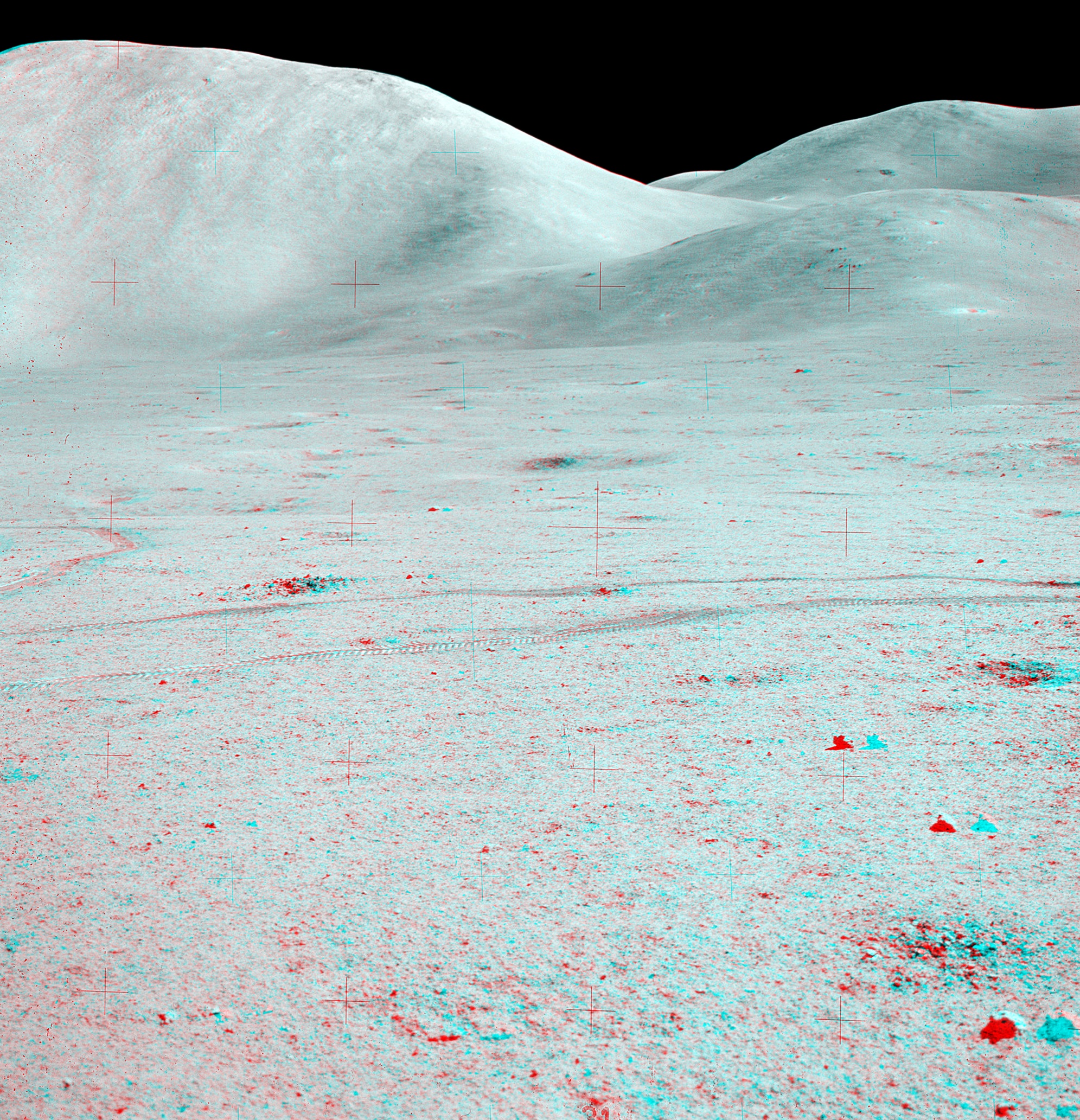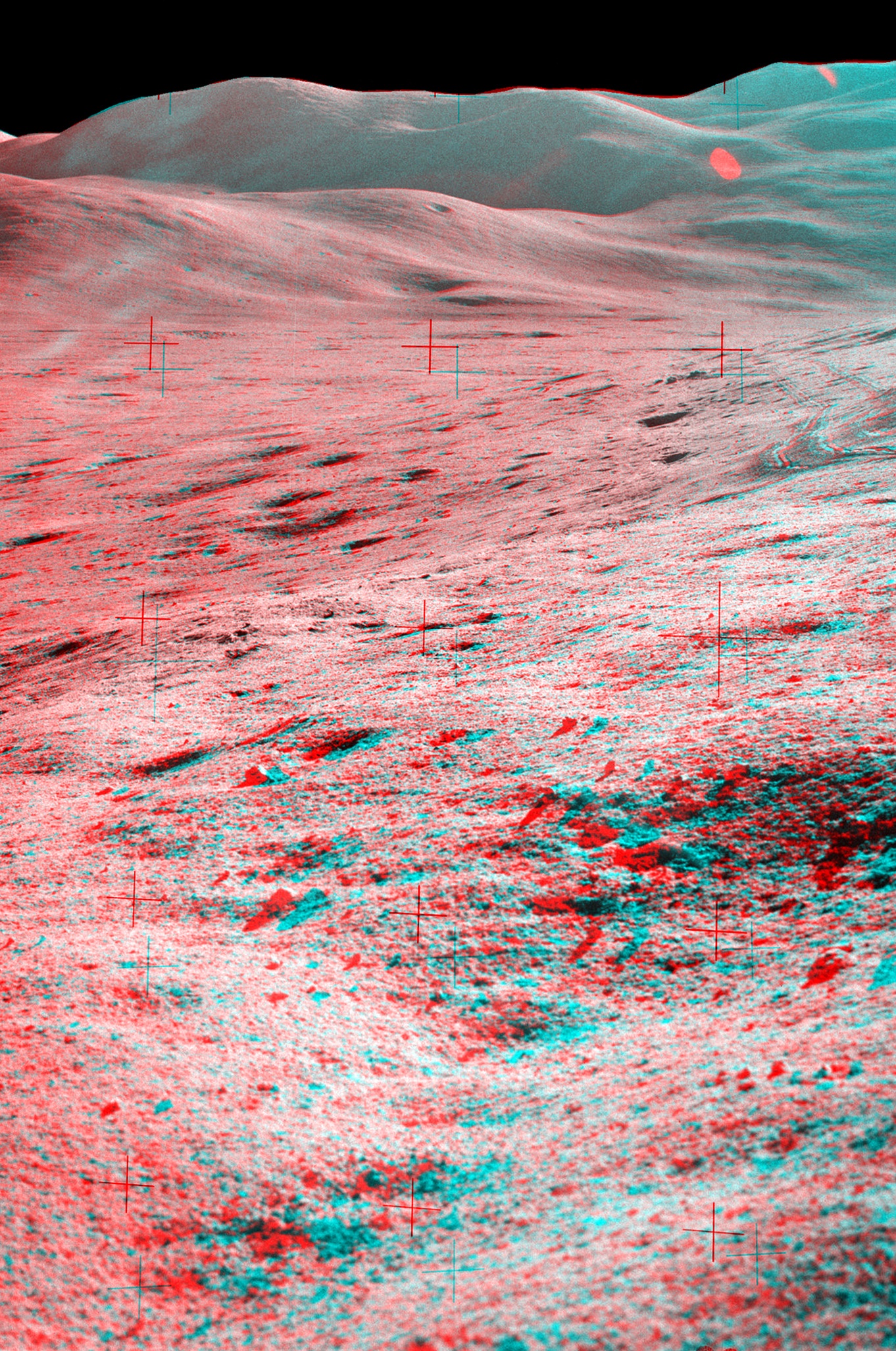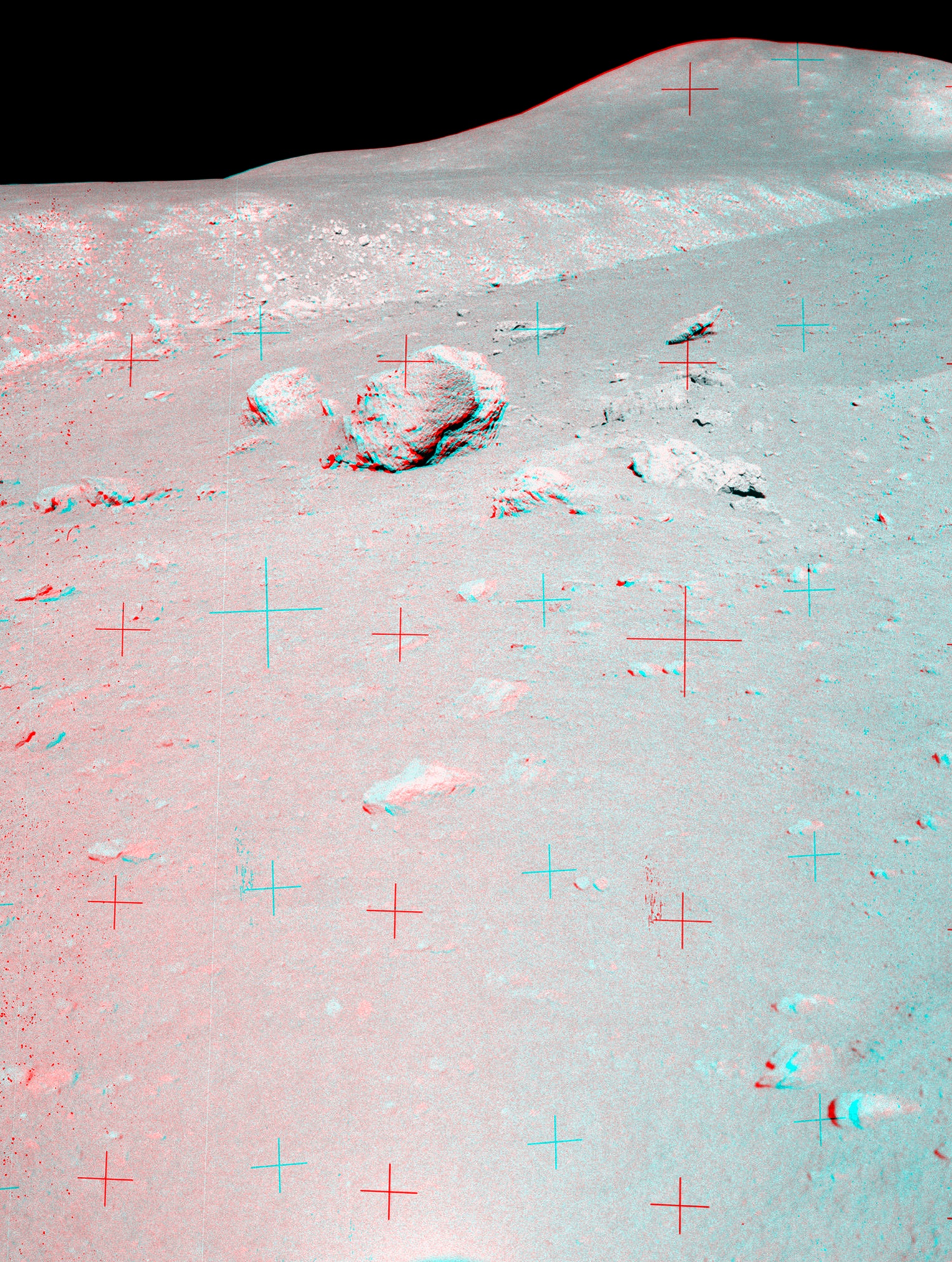 Anaglyphs in the image libraries created from sequential panorama frames by the ALSJ editor exist only because of Yuri Krasilnikov's willingness to teach me the art. Whatever value the anaglyphs have is due to Yuri's insights and guidance. Flaws are my doing. Briefly, panorama stitching software Hugin is used to create both non-stereo pan assemblies and remapped versions of the images. The latter are then made into anaglyphs using GIMP. The individual remapped images are linked from the corresponding Library entries for the original frames. The remapped images can be used to create stereo views using other methods.