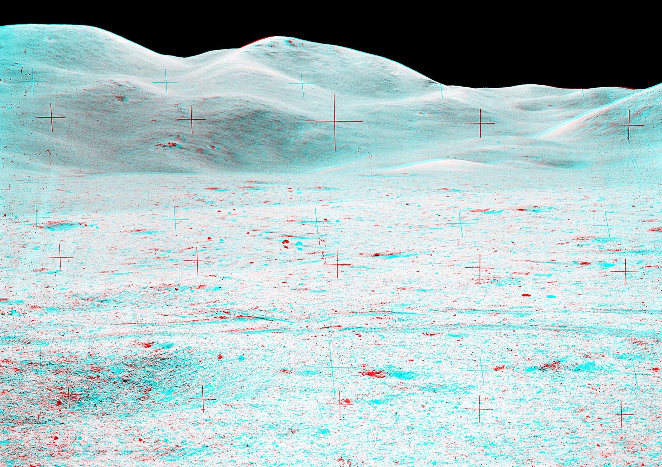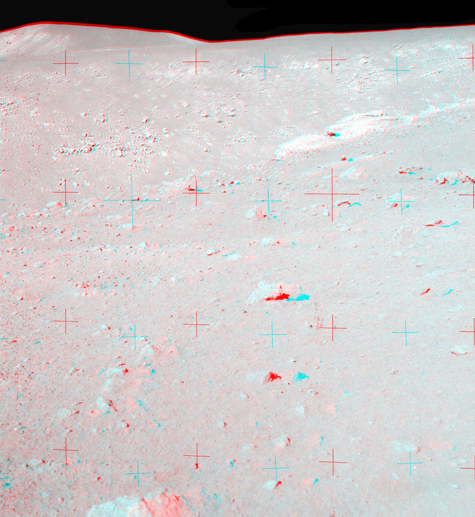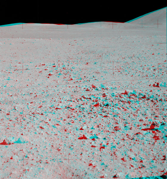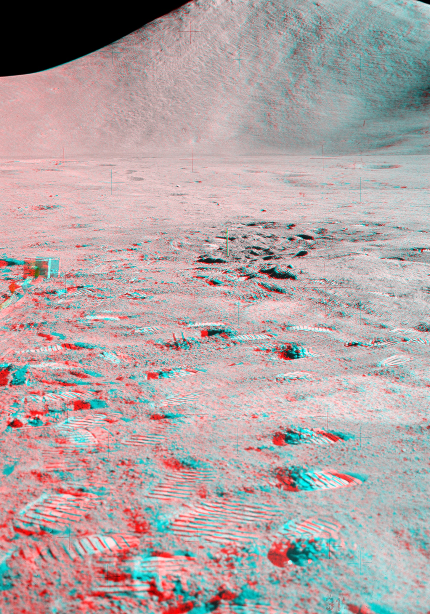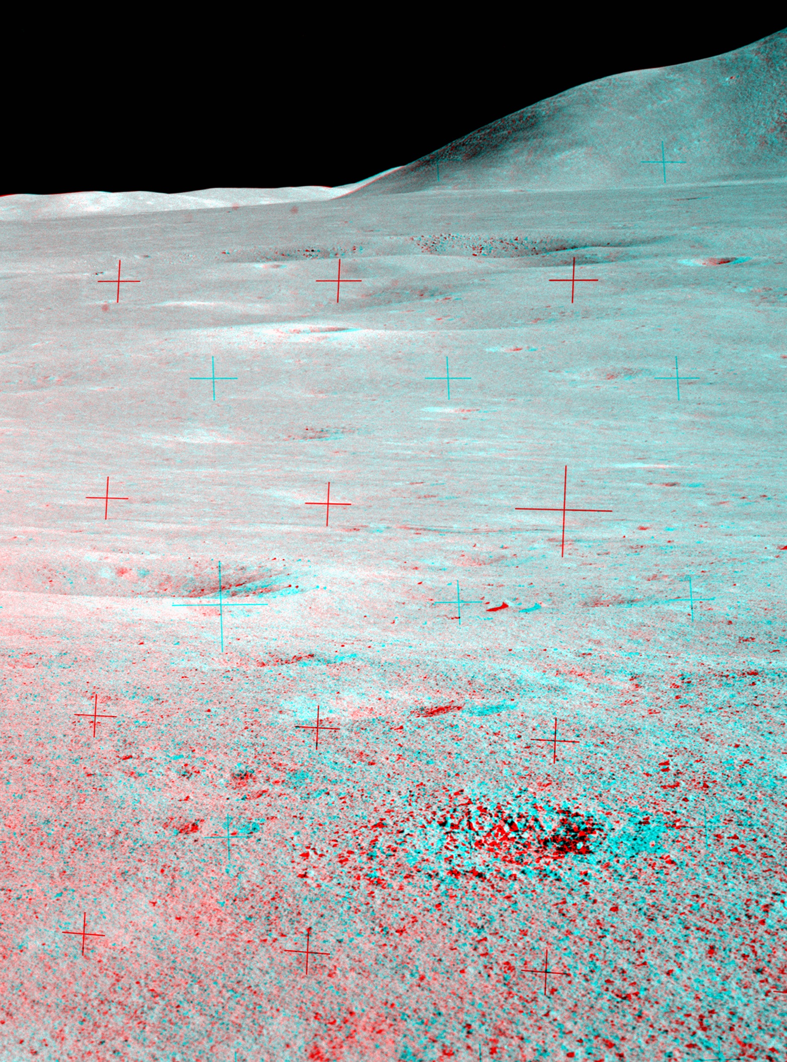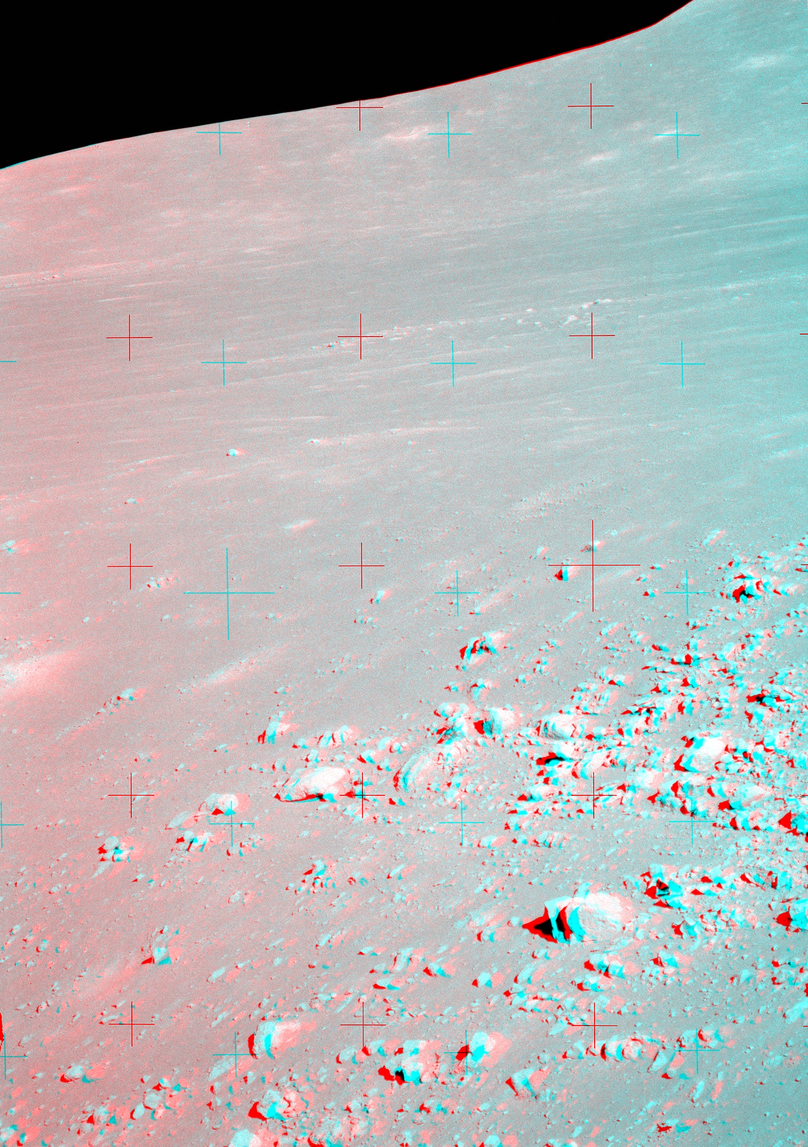 Anaglyphs in the image libraries created from sequential panorama frames by the ALSJ editor exist only because of Yuri Krasilnikov's willingness to teach me the art. Whatever value the anaglyphs have is due to Yuri's insights and guidance. Flaws are my doing. Briefly, panorama stitching software Hugin is used to create both non-stereo pan assemblies and remapped versions of the images. The latter are then made into anaglyphs using GIMP. The individual remapped images are linked from the corresponding Library entries for the original frames. The remapped images can be used to create stereo views using other methods.