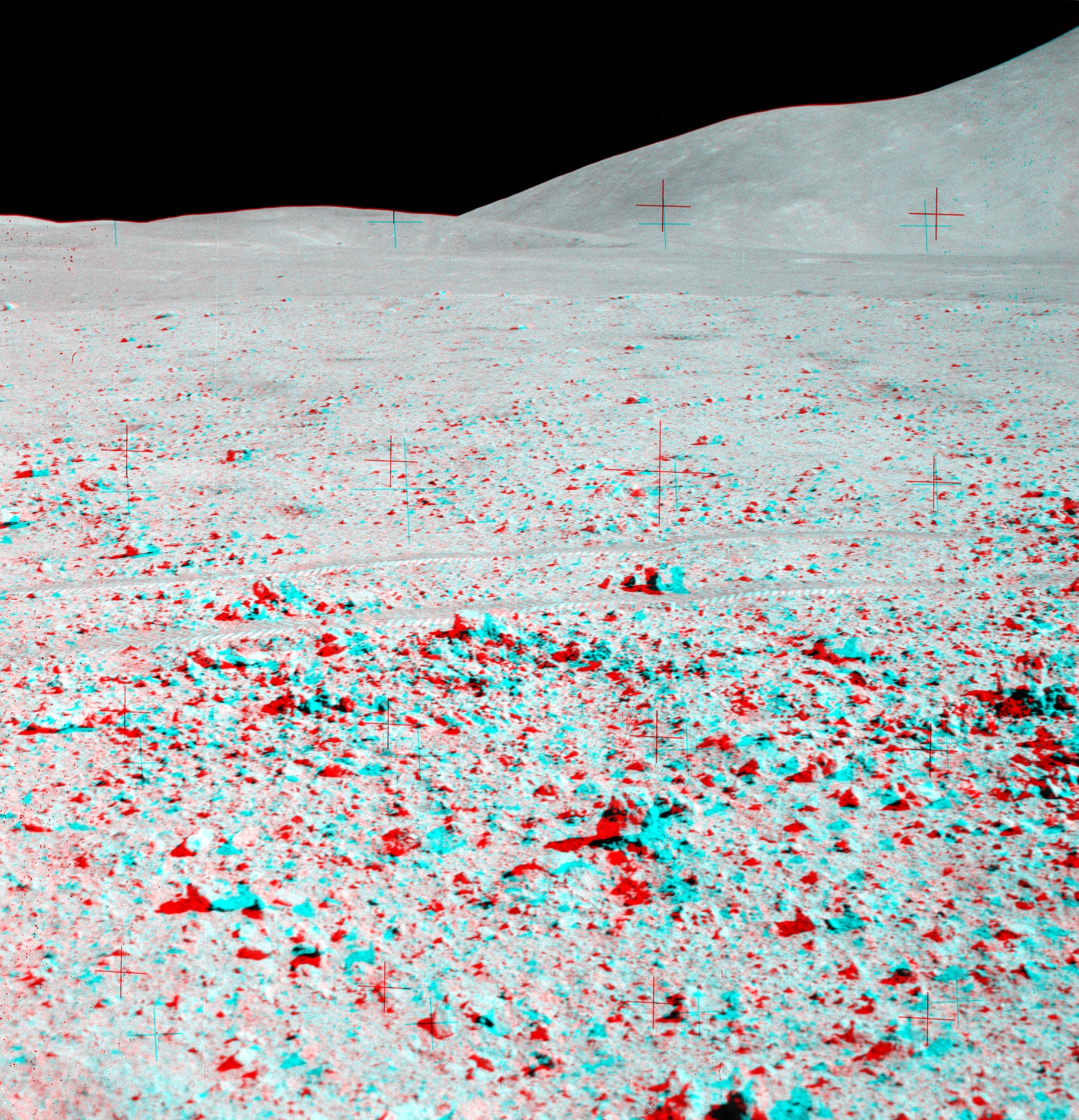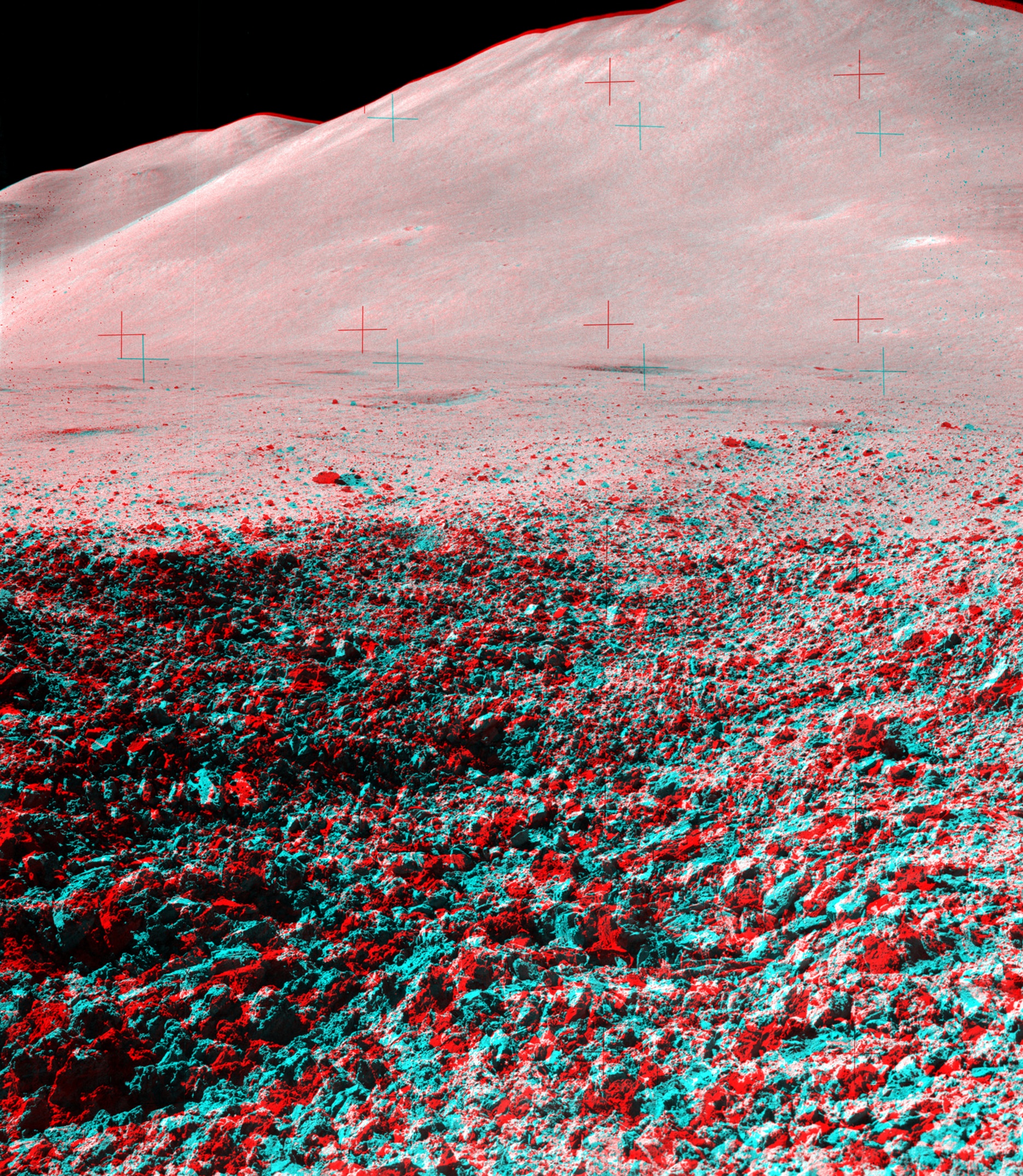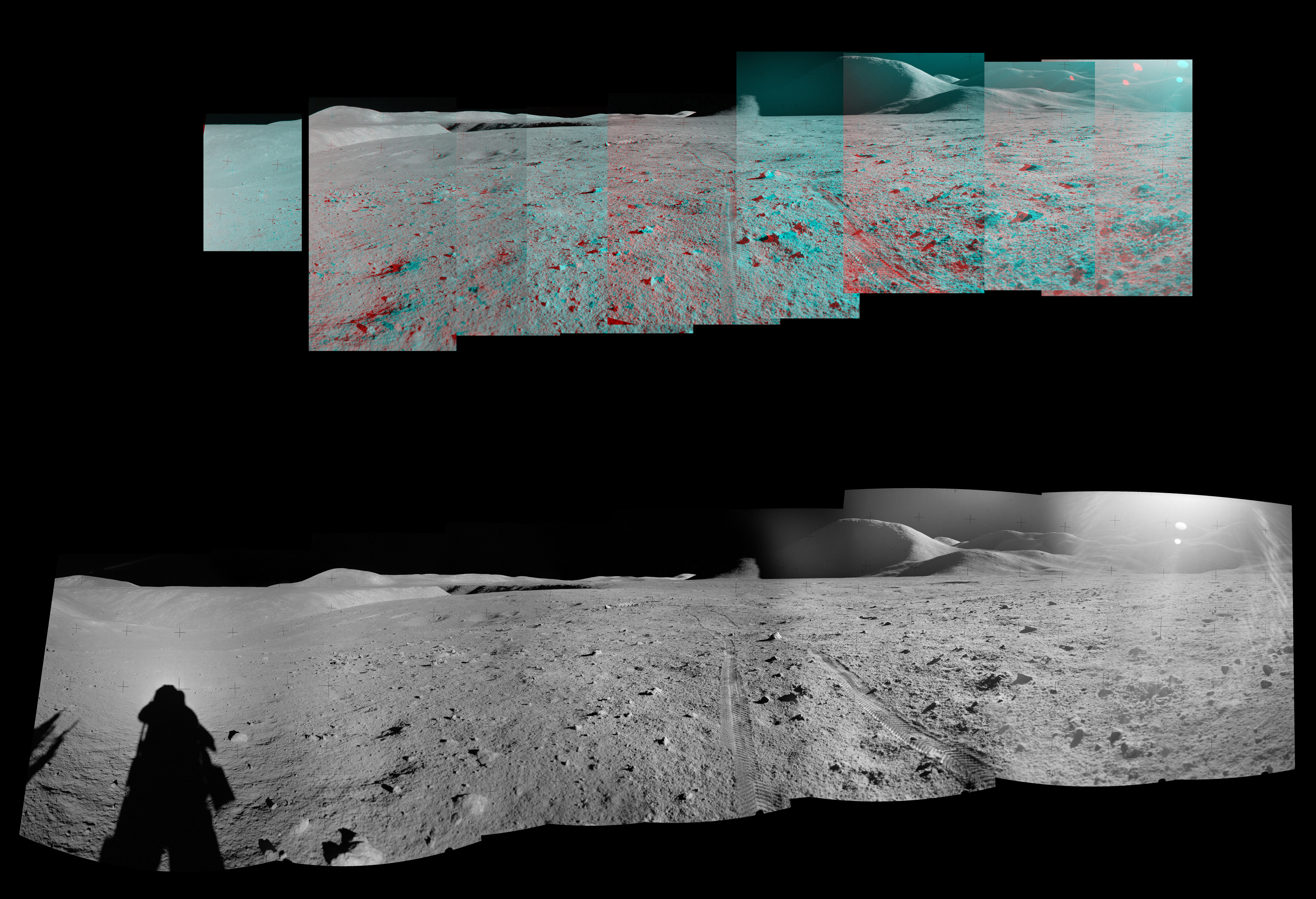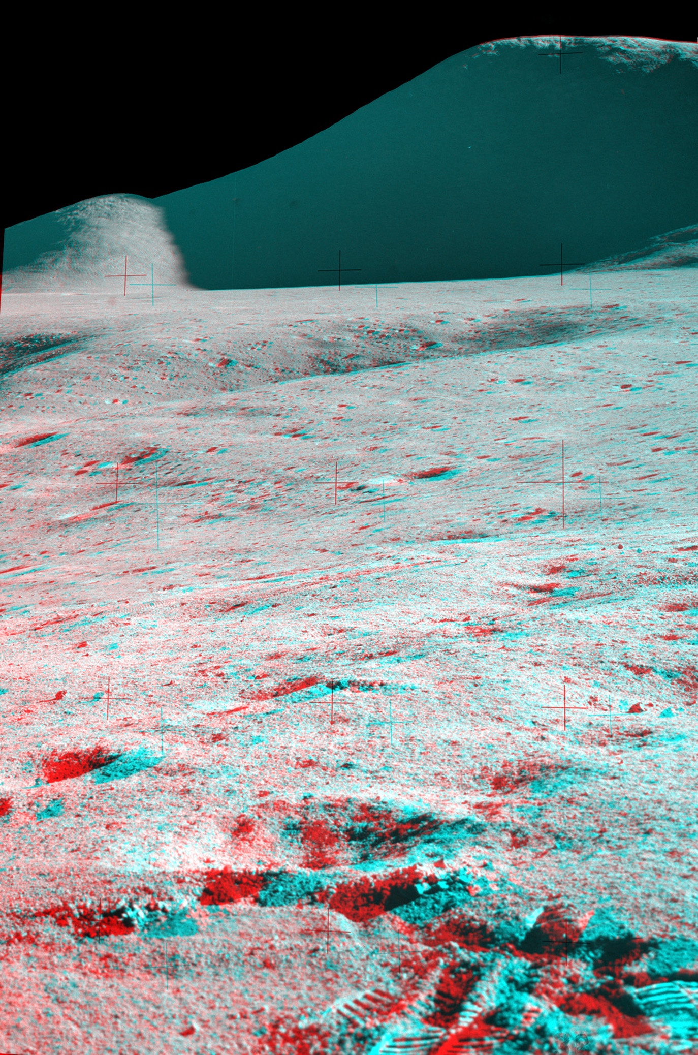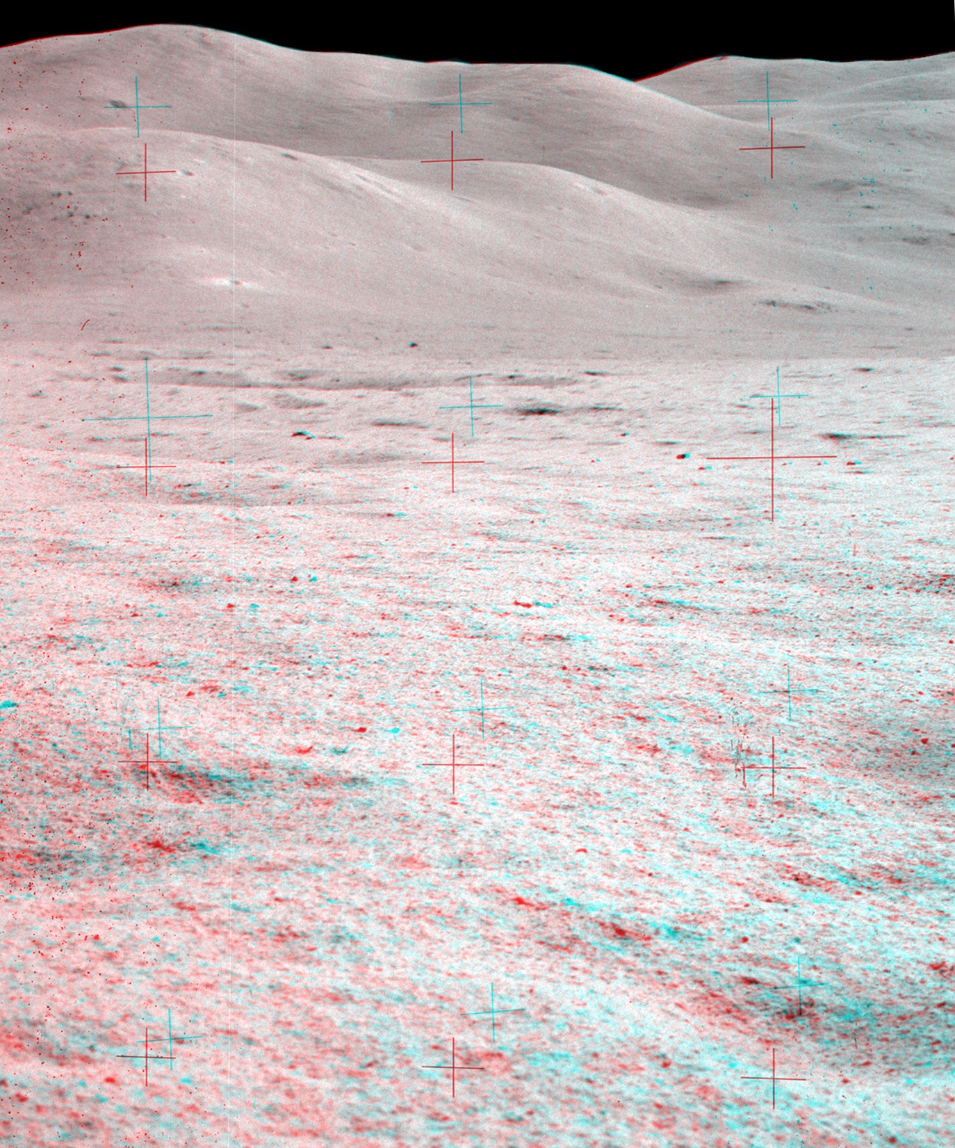 Anaglyphs in the image libraries created from sequential panorama frames by the ALSJ editor exist only because of Yuri Krasilnikov's willingness to teach me the art. Whatever value the anaglyphs have is due to Yuri's insights and guidance. Flaws are my doing. Briefly, panorama stitching software Hugin is used to create both non-stereo pan assemblies and remapped versions of the images. The latter are then made into anaglyphs using GIMP. The individual remapped images are linked from the corresponding Library entries for the original frames. The remapped images can be used to create stereo views using other methods.