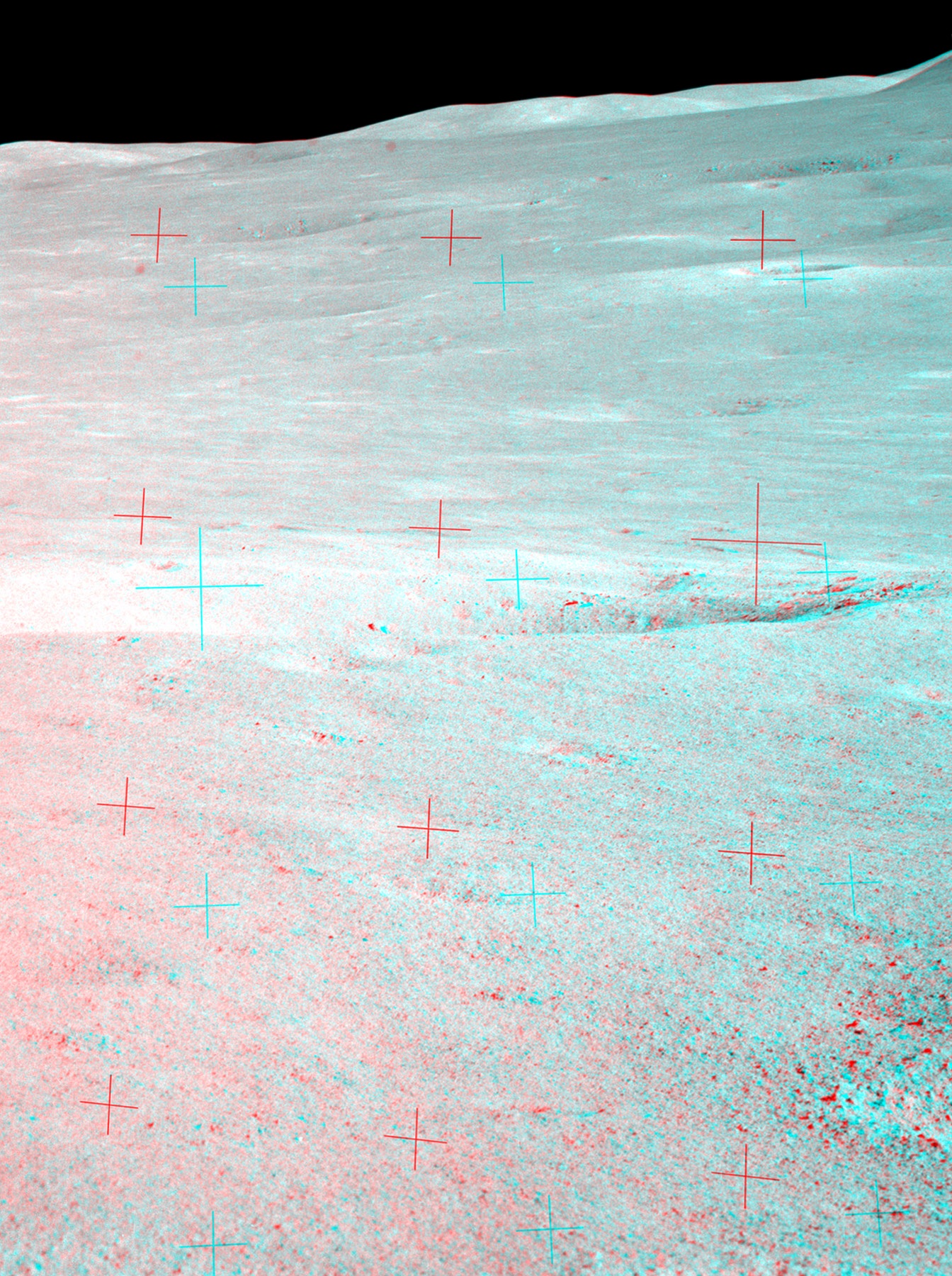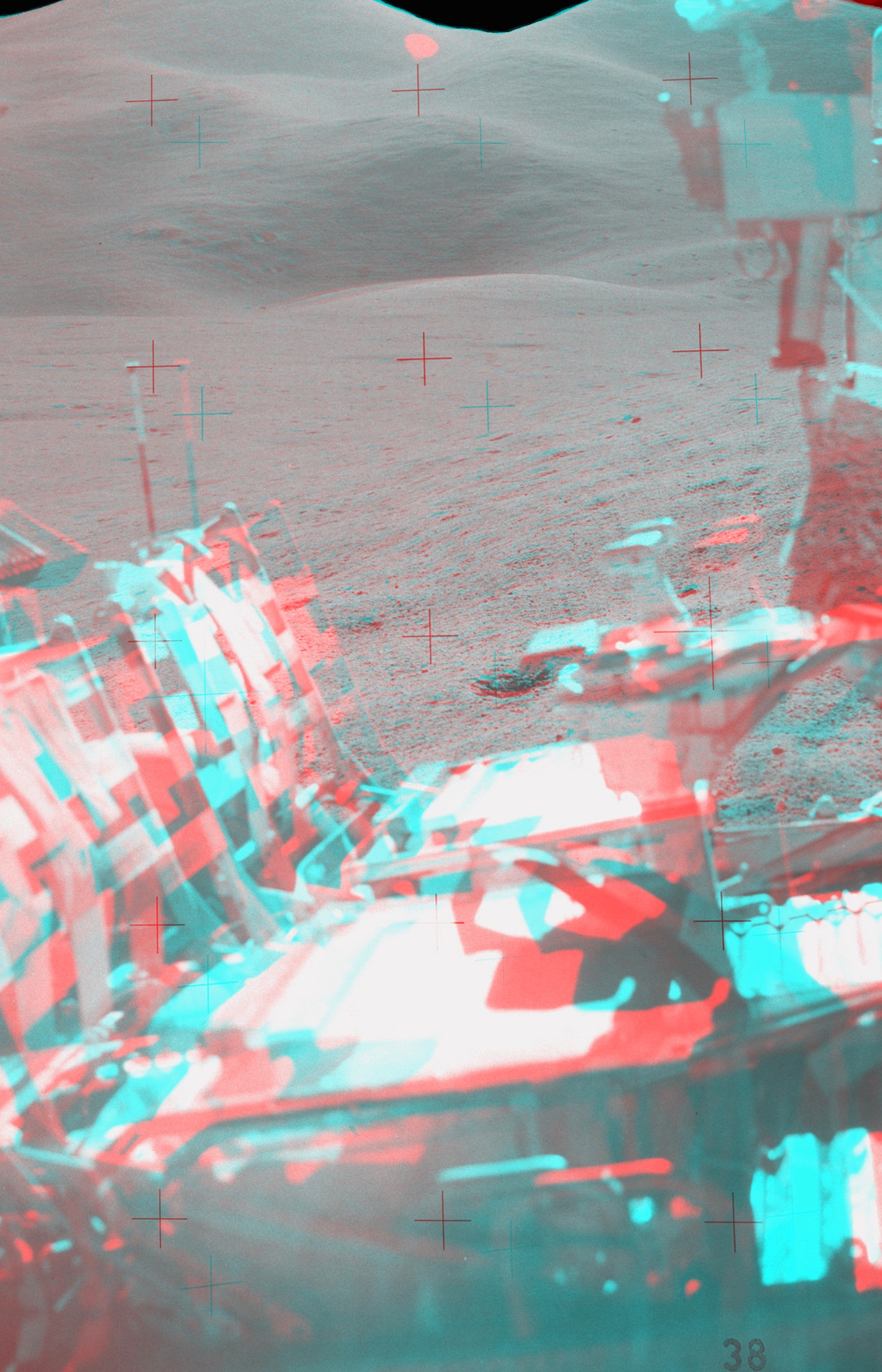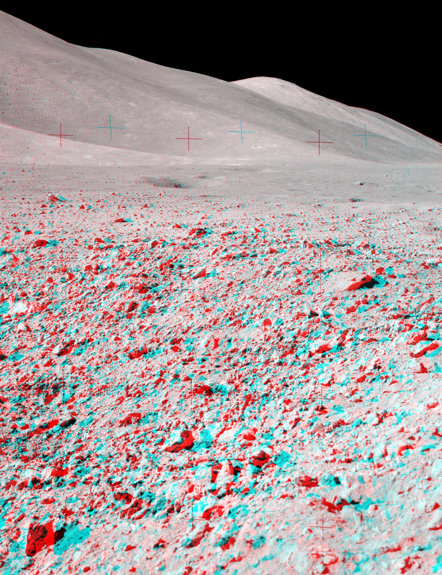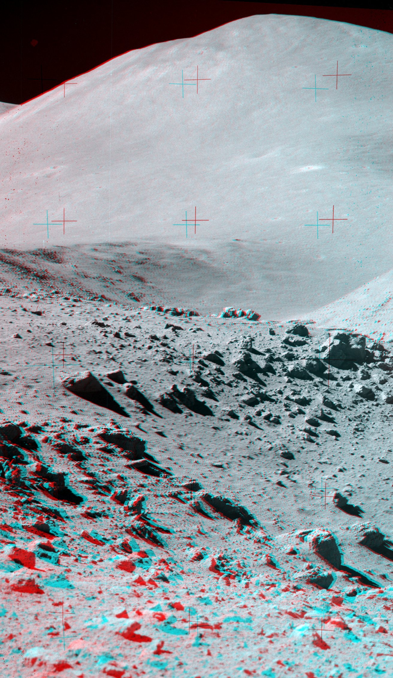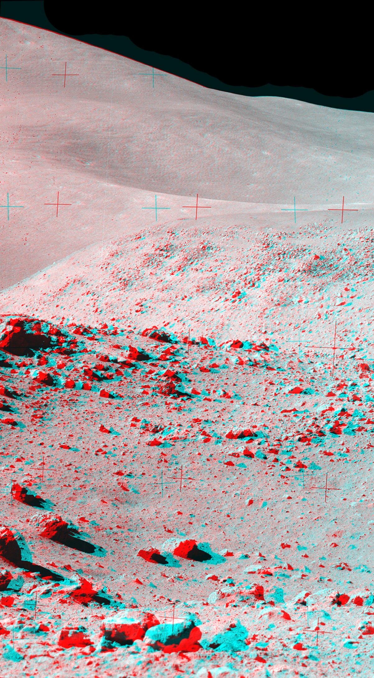 Anaglyphs in the image libraries created from sequential panorama frames by the ALSJ editor exist only because of Yuri Krasilnikov's willingness to teach me the art. Whatever value the anaglyphs have is due to Yuri's insights and guidance. Flaws are my doing. Briefly, panorama stitching software Hugin is used to create both non-stereo pan assemblies and remapped versions of the images. The latter are then made into anaglyphs using GIMP. The individual remapped images are linked from the corresponding Library entries for the original frames. The remapped images can be used to create stereo views using other methods.