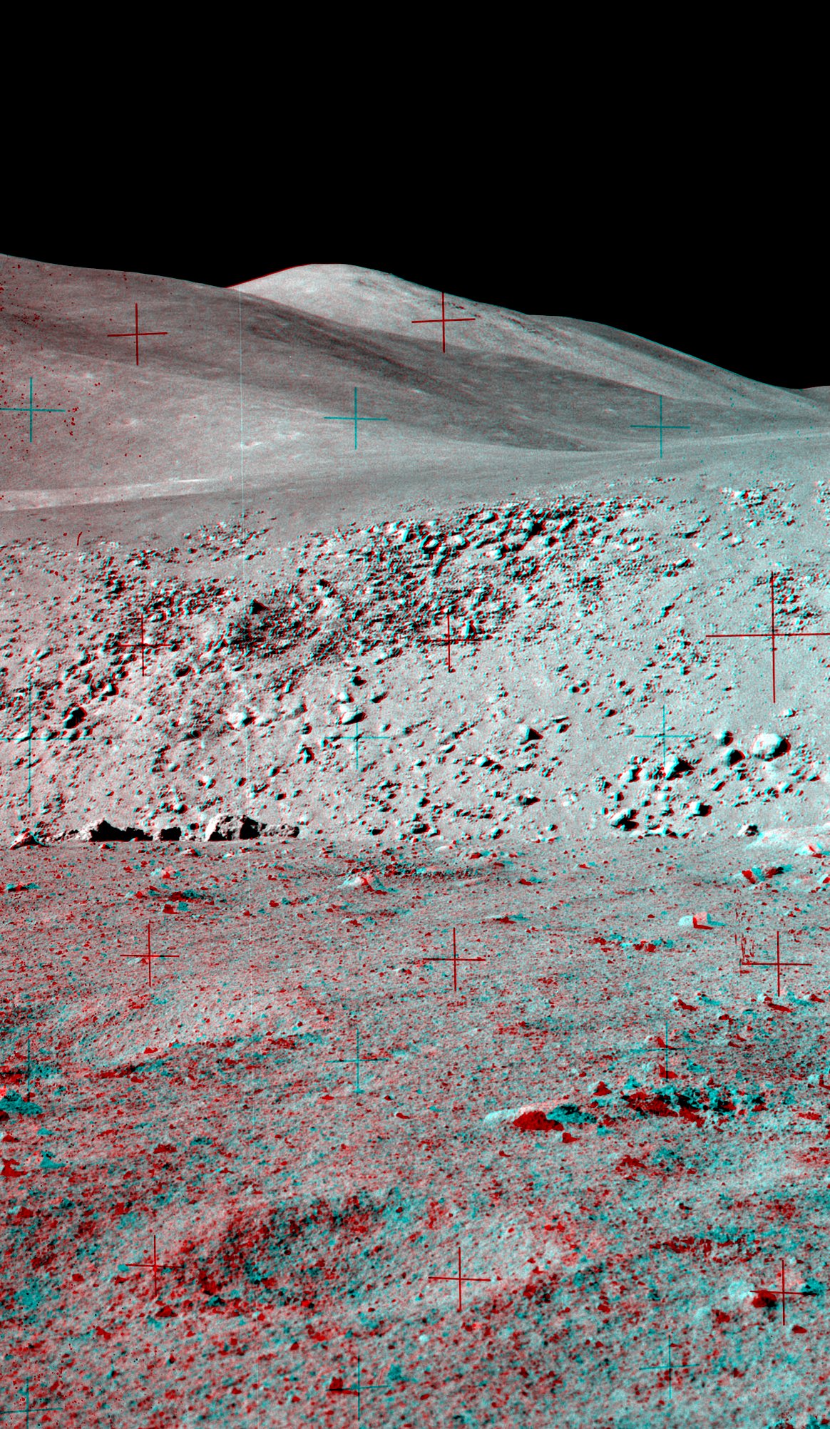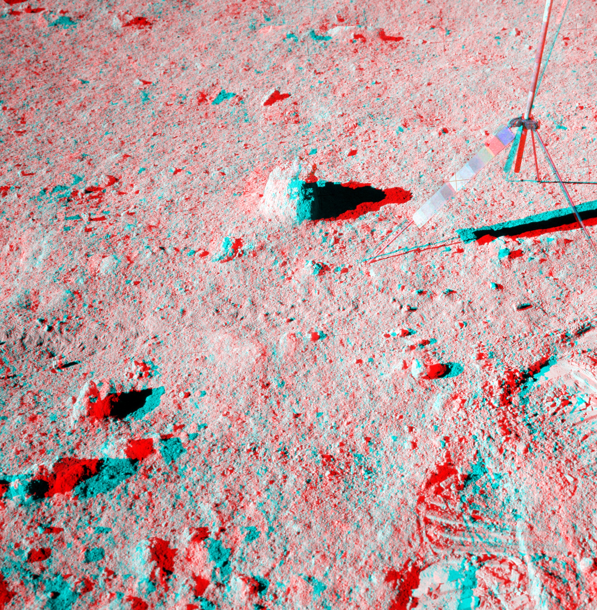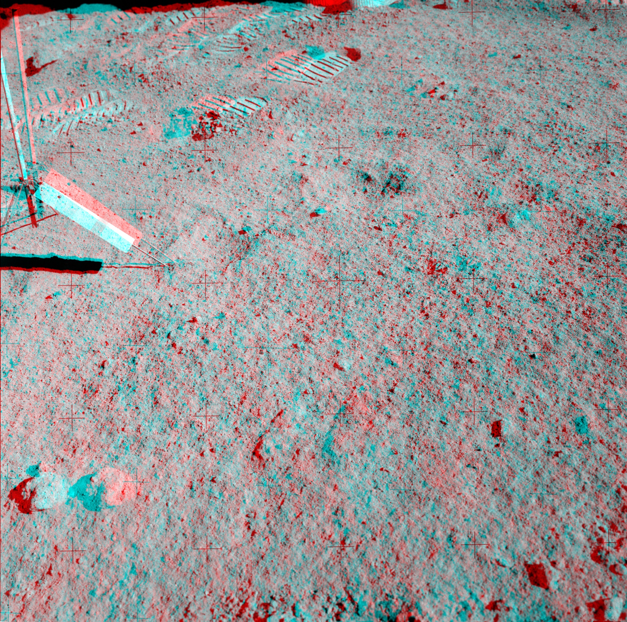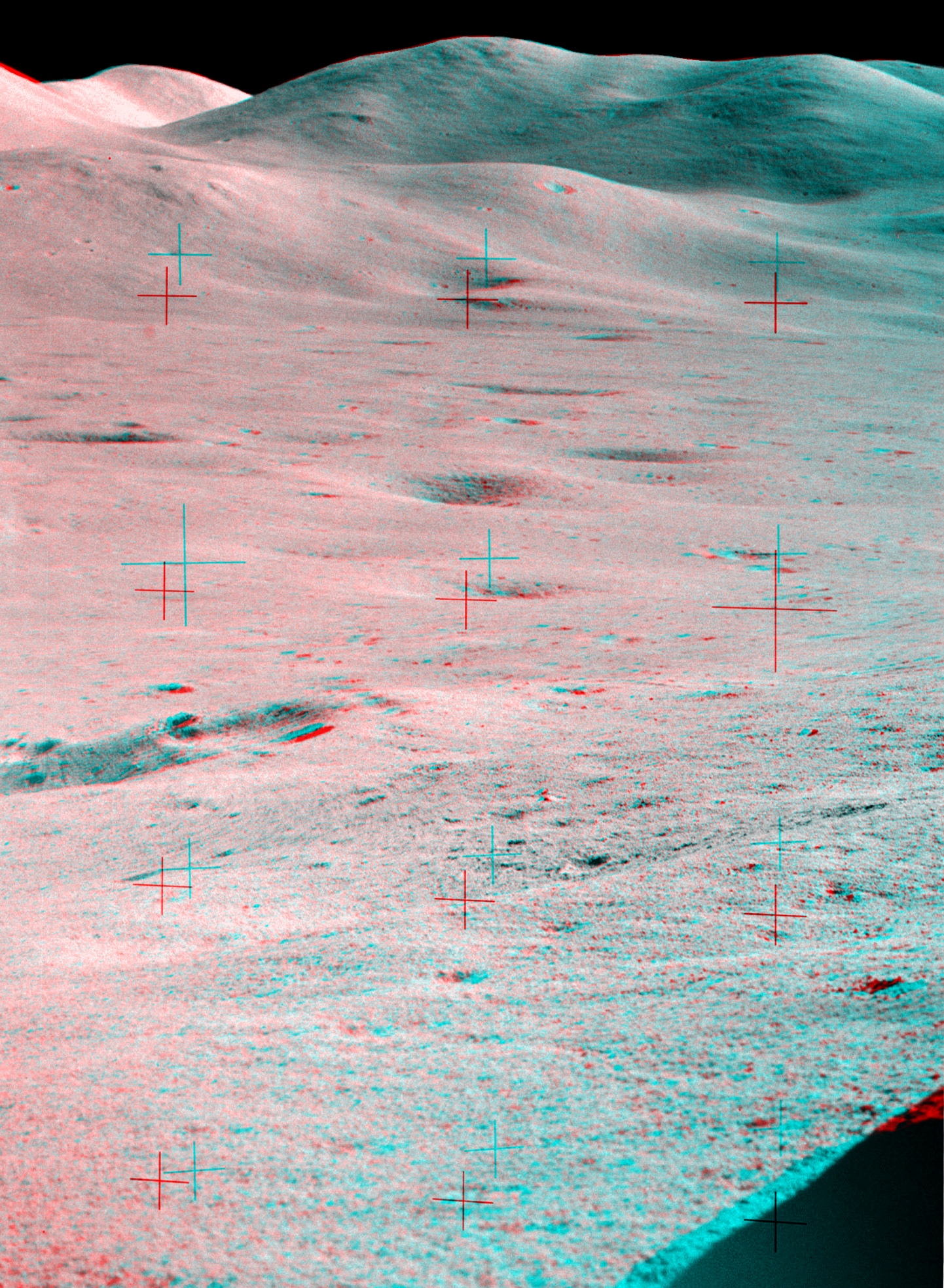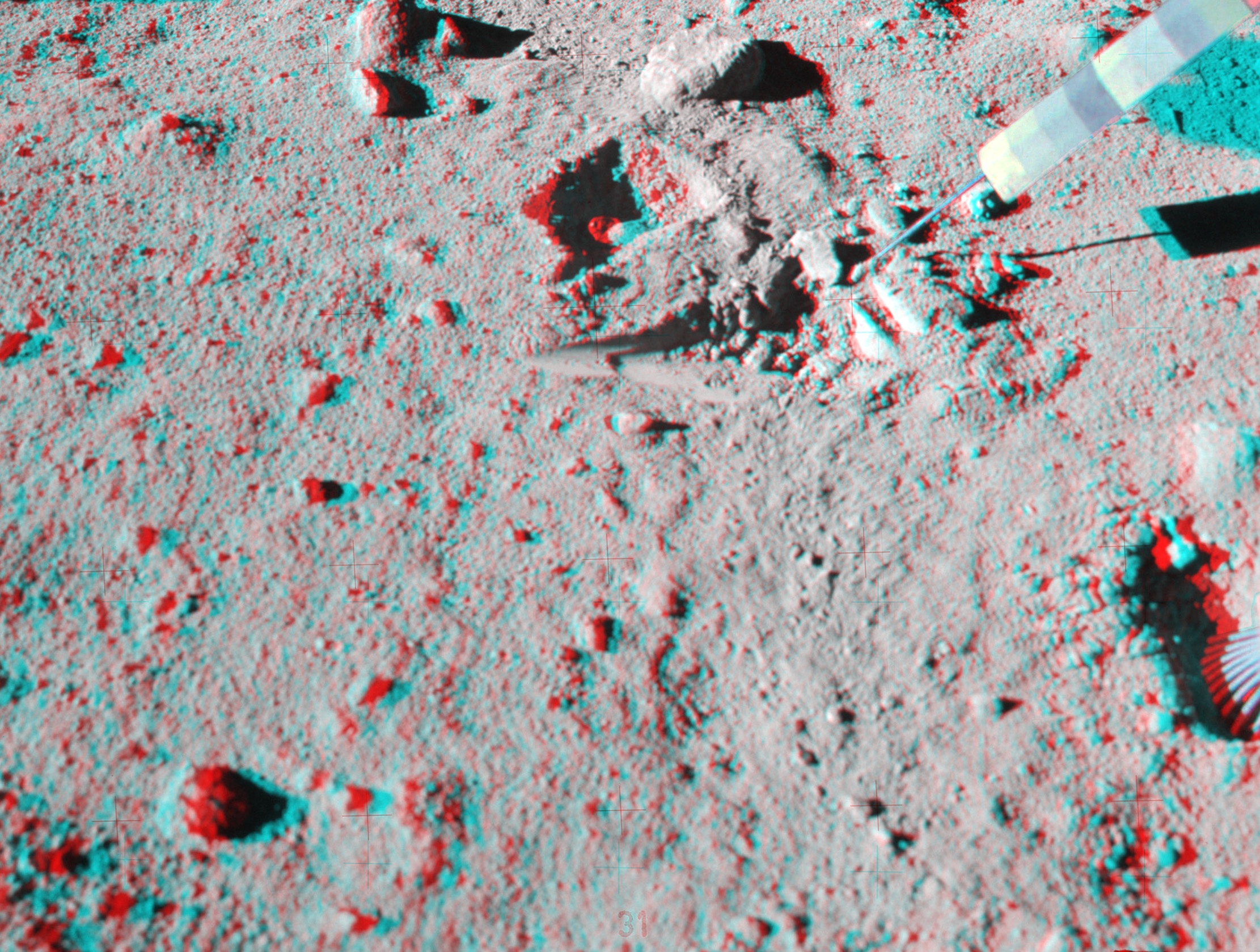 Anaglyphs in the image libraries created from sequential panorama frames by the ALSJ editor exist only because of Yuri Krasilnikov's willingness to teach me the art. Whatever value the anaglyphs have is due to Yuri's insights and guidance. Flaws are my doing. Briefly, panorama stitching software Hugin is used to create both non-stereo pan assemblies and remapped versions of the images. The latter are then made into anaglyphs using GIMP. The individual remapped images are linked from the corresponding Library entries for the original frames. The remapped images can be used to create stereo views using other methods.