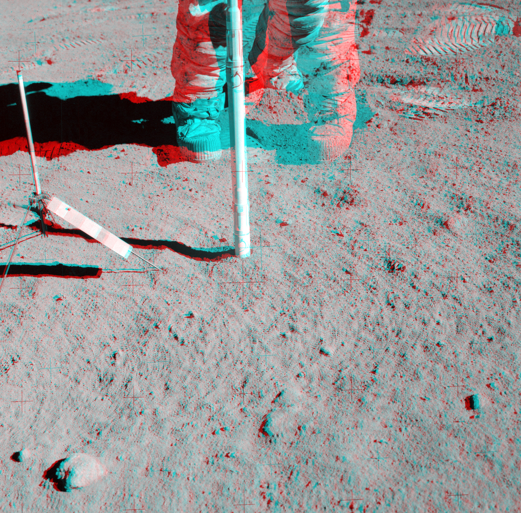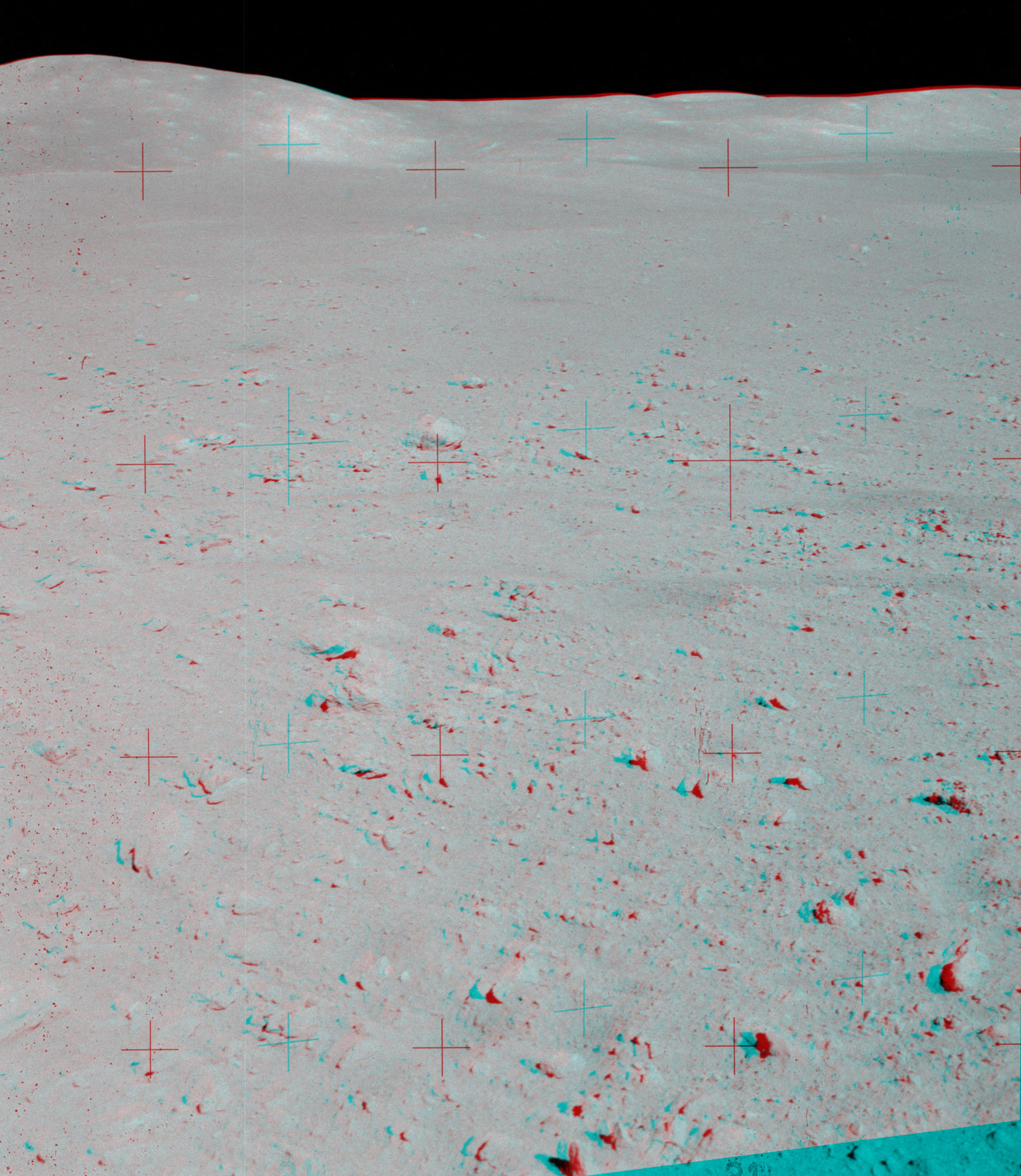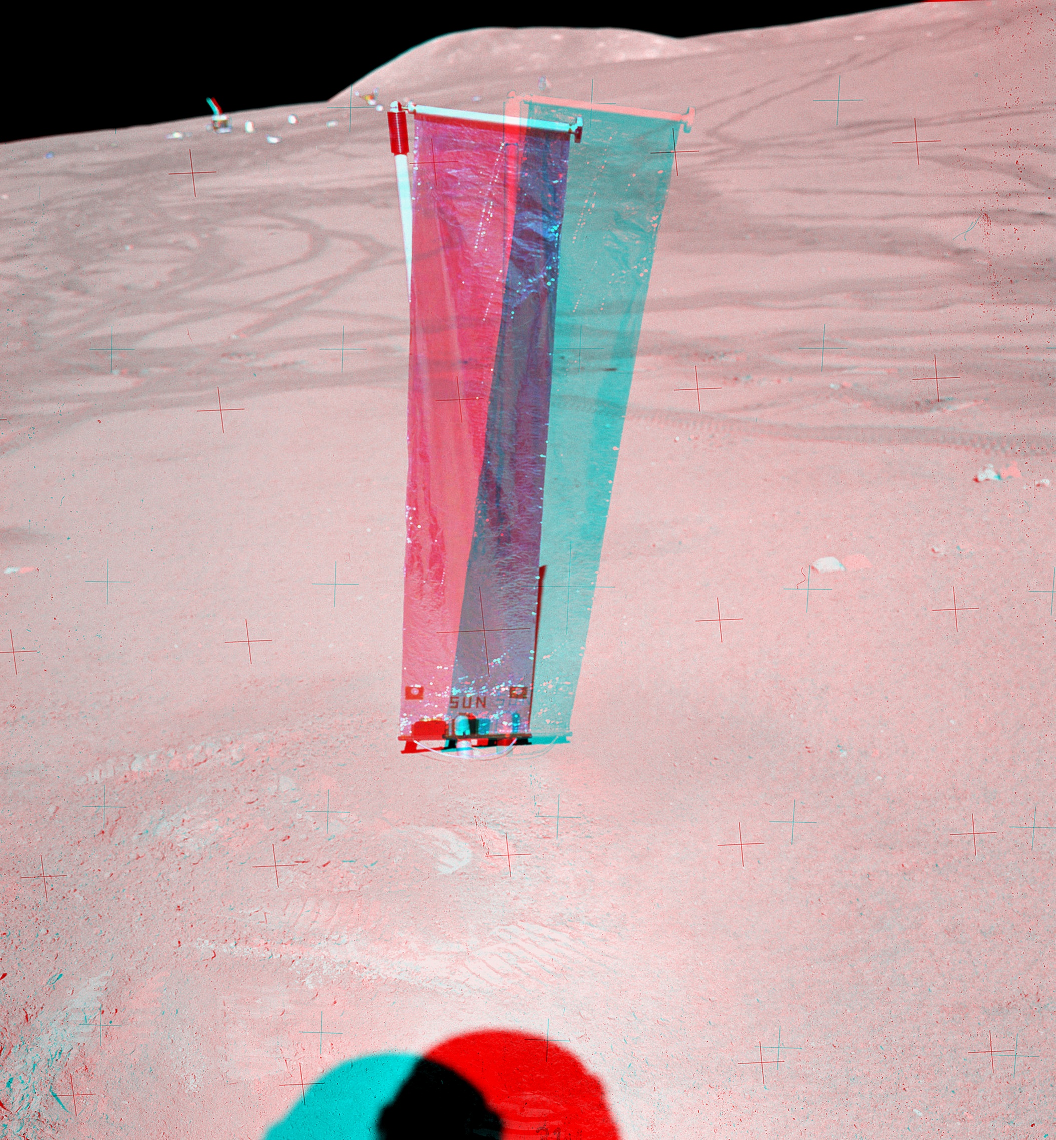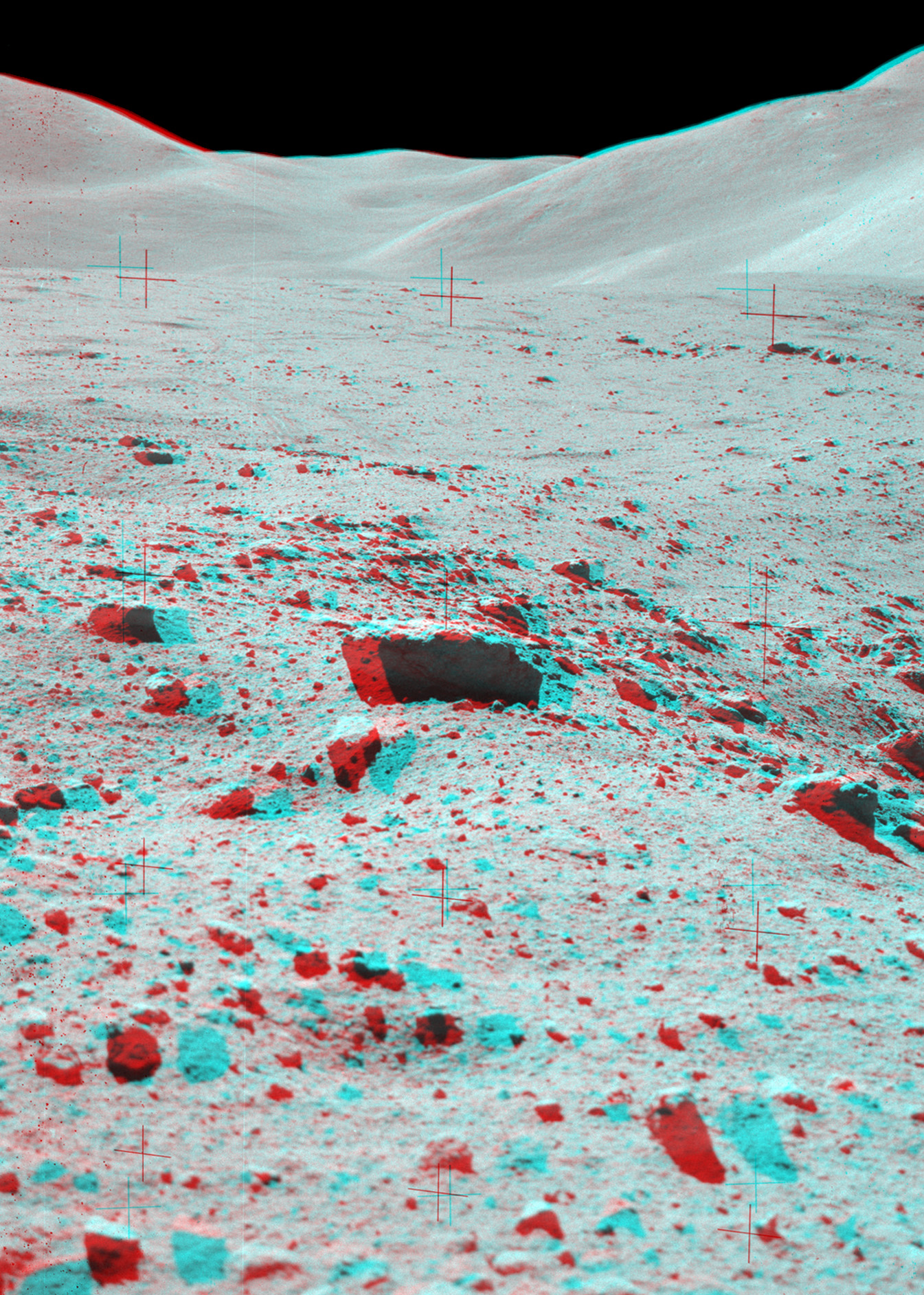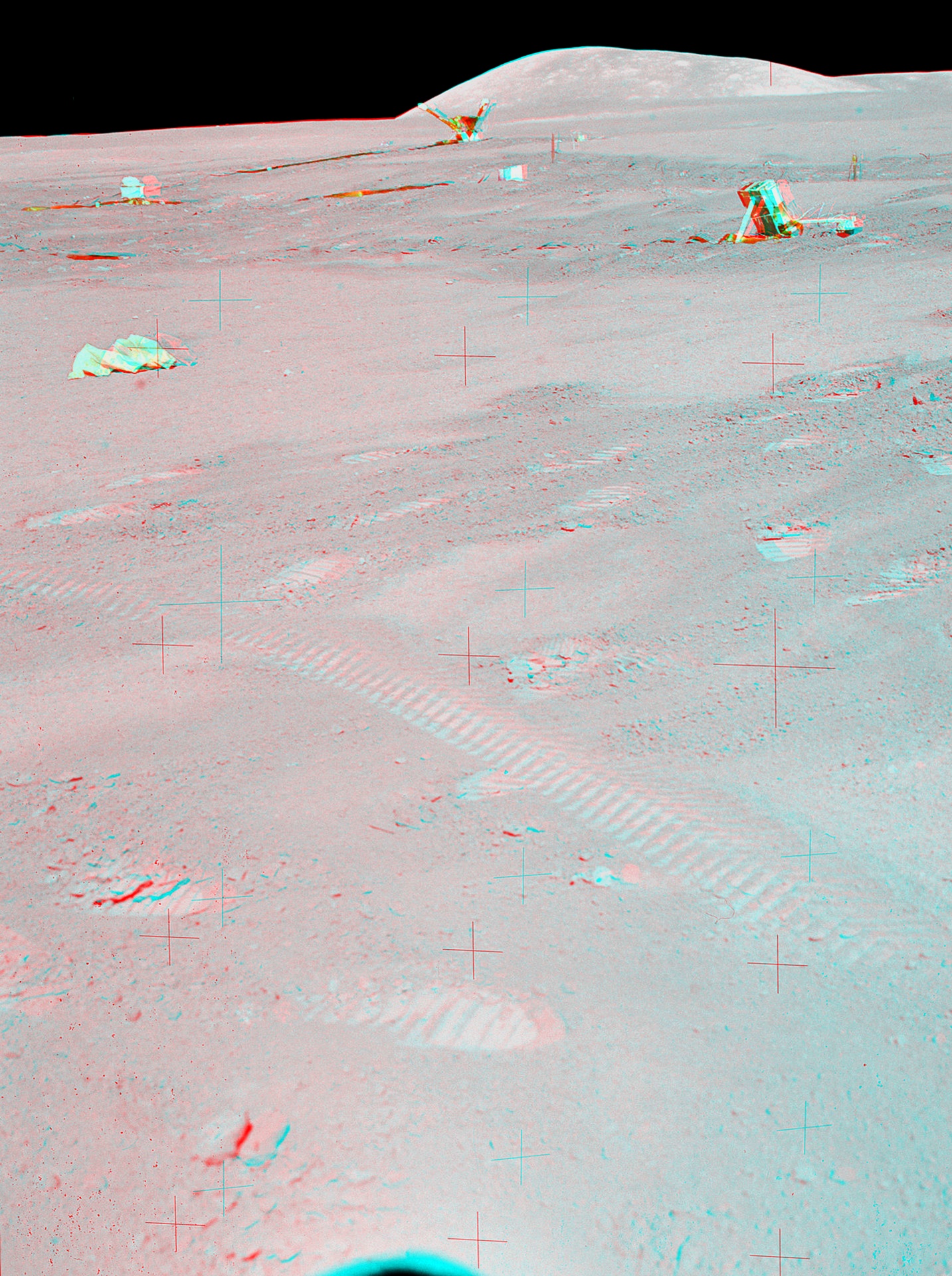 Anaglyphs in the image libraries created from sequential panorama frames by the ALSJ editor exist only because of Yuri Krasilnikov's willingness to teach me the art. Whatever value the anaglyphs have is due to Yuri's insights and guidance. Flaws are my doing. Briefly, panorama stitching software Hugin is used to create both non-stereo pan assemblies and remapped versions of the images. The latter are then made into anaglyphs using GIMP. The individual remapped images are linked from the corresponding Library entries for the original frames. The remapped images can be used to create stereo views using other methods.