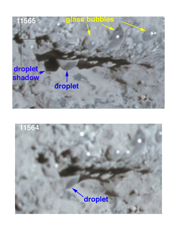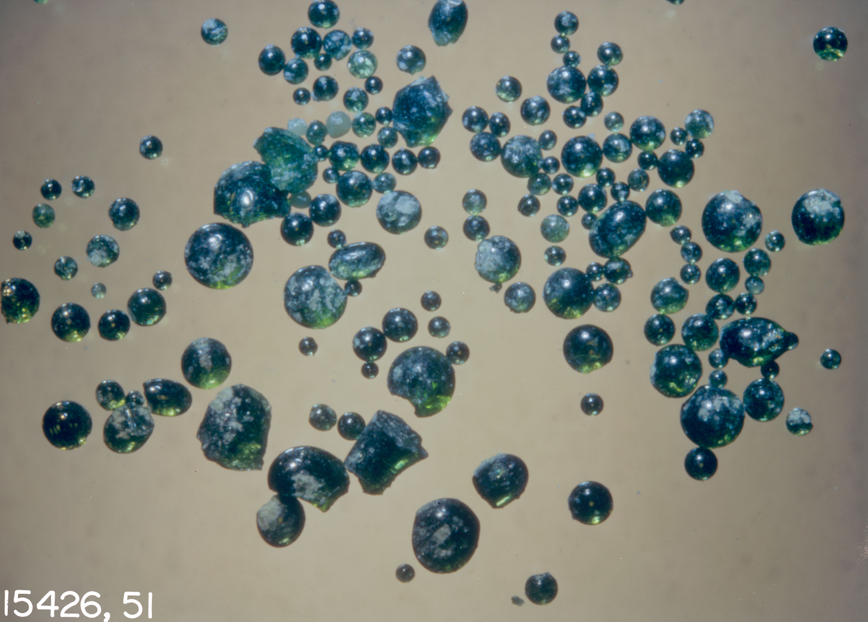 Some of the green glass beads found in soils Dave and Jim collected at stops on Mt. Hadley Delta, particularly at Spur Crater. See a discussion following the sequence starting at 145:37:46.S71-43390 (9 Mb or 0.5 Mb)