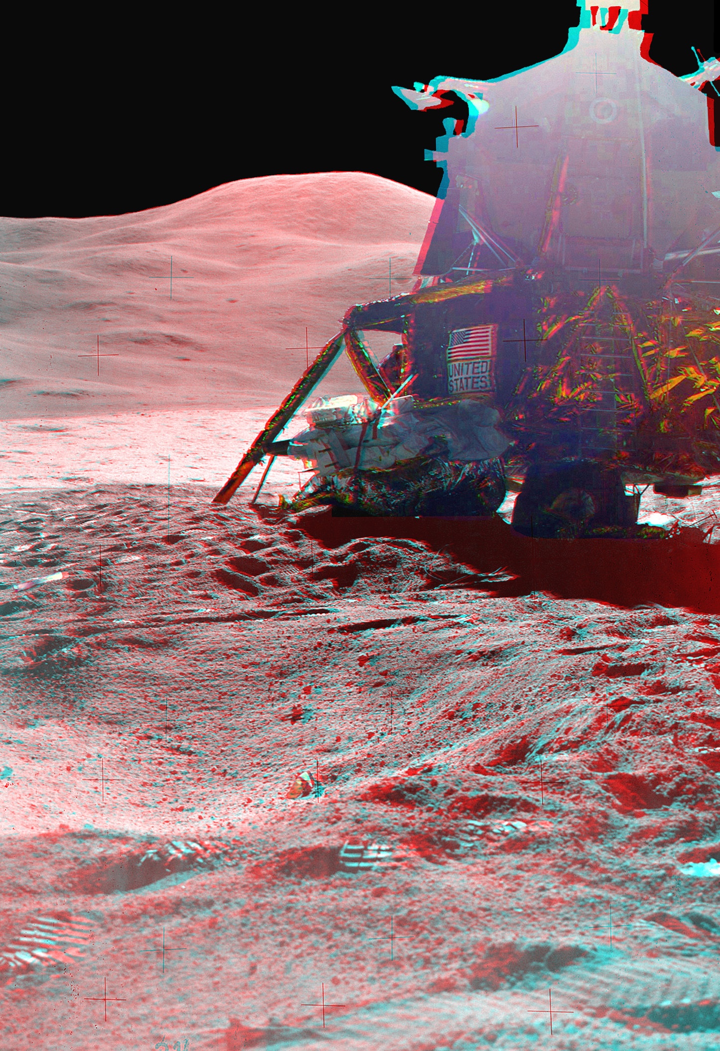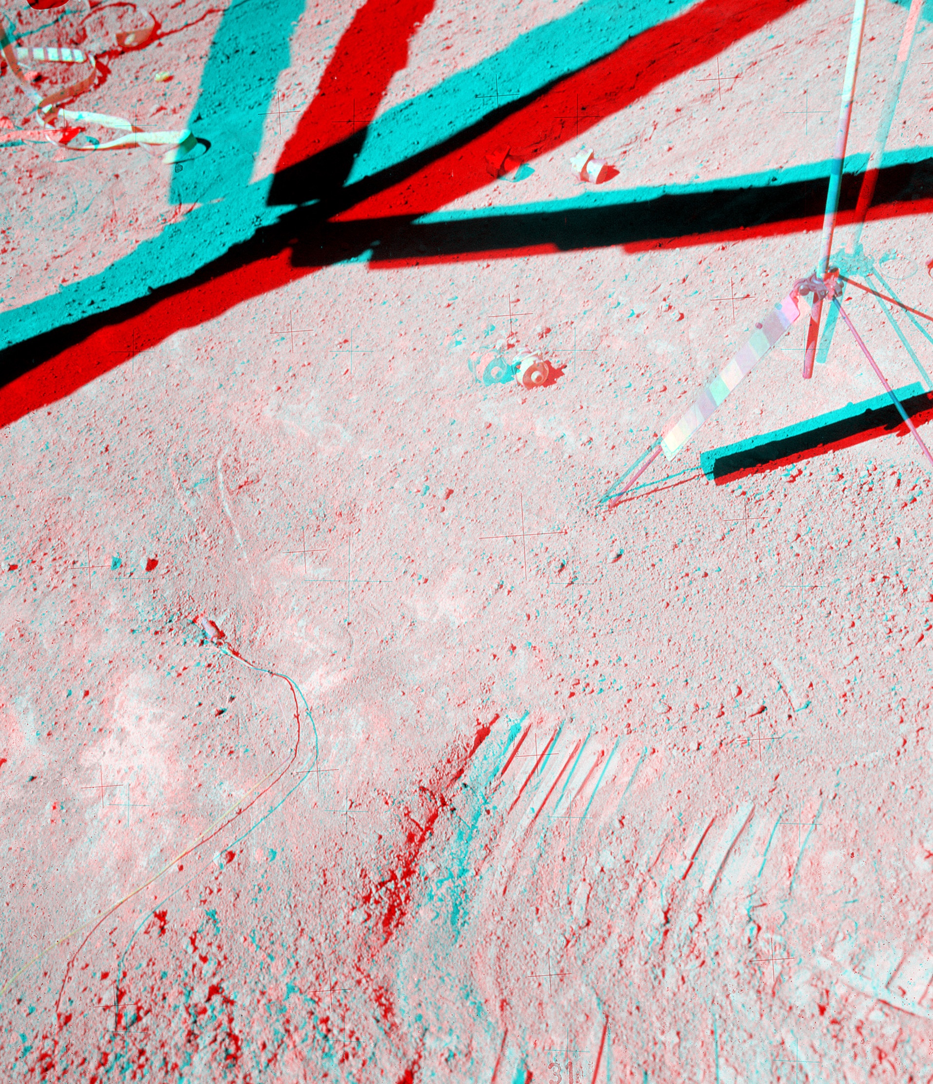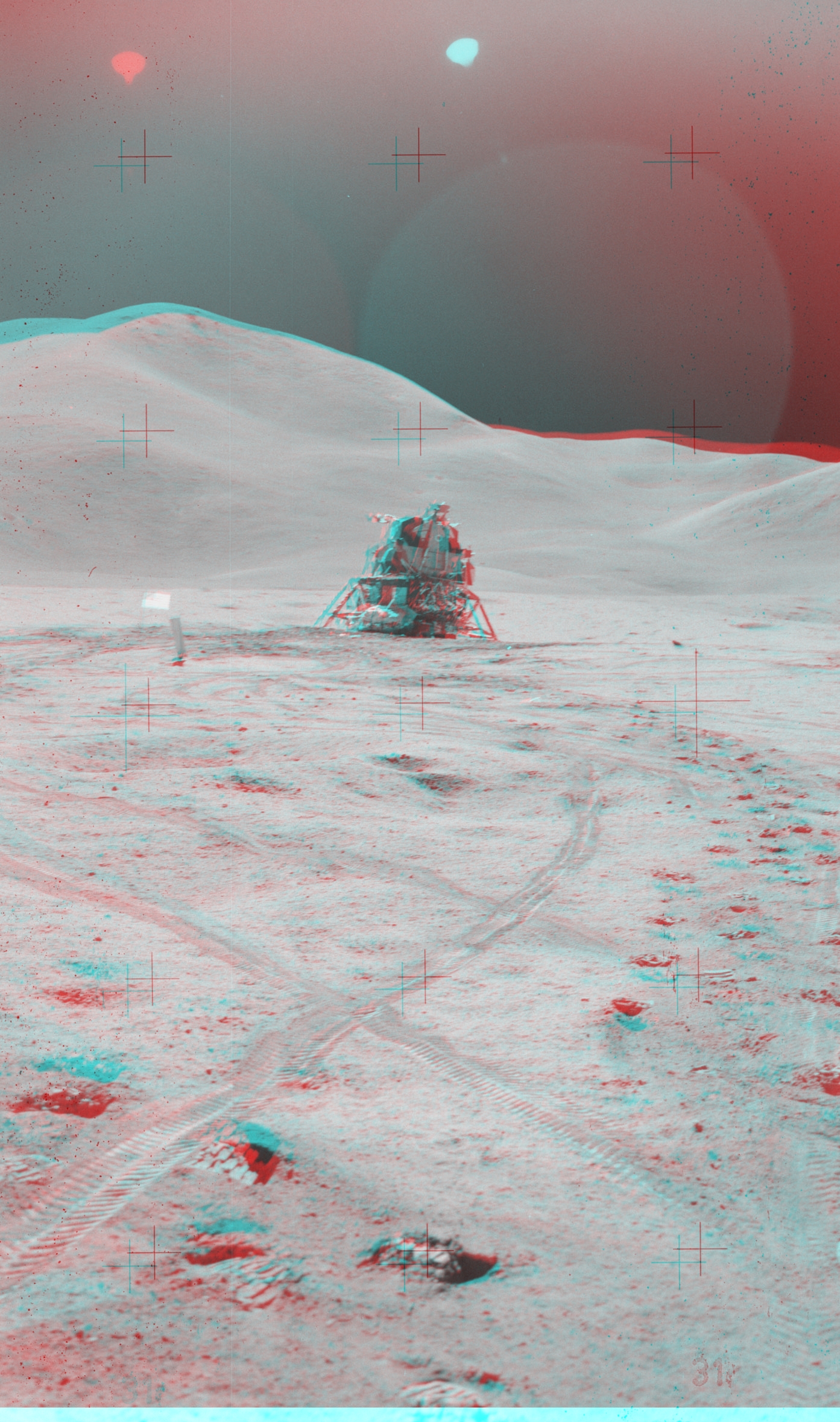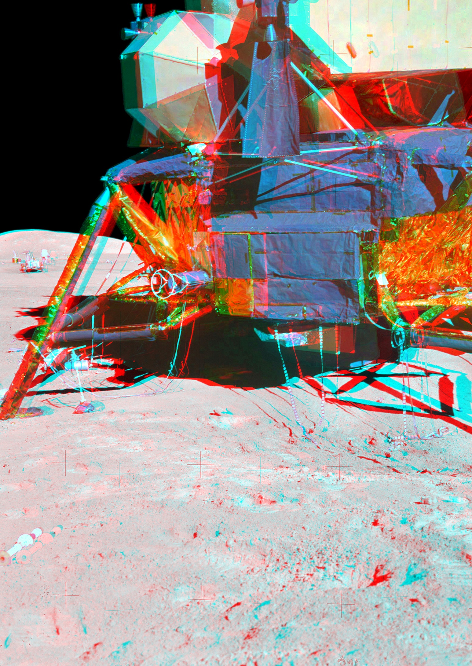 Red-Blue Anaglyph of the ALSEP, LM, LRV (0.3 Mb