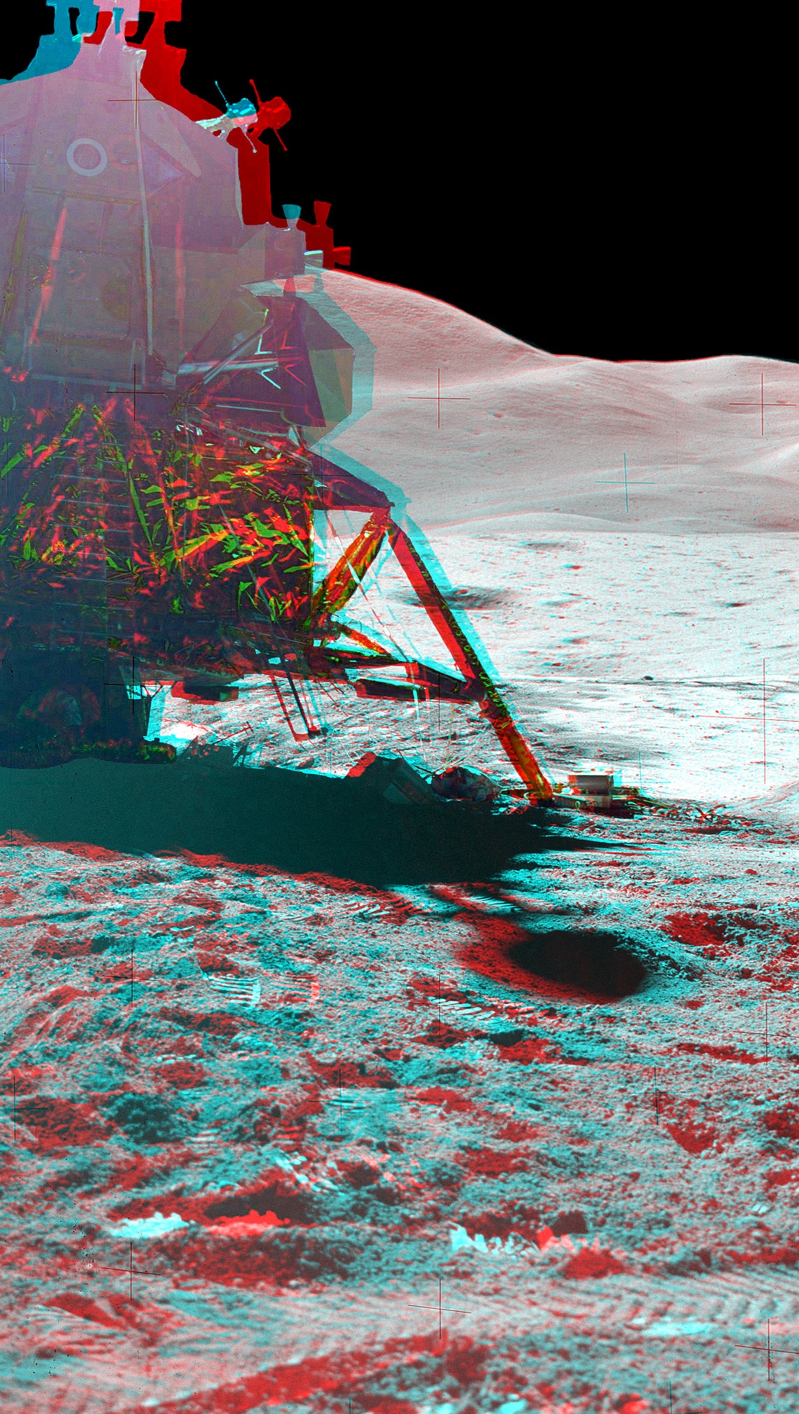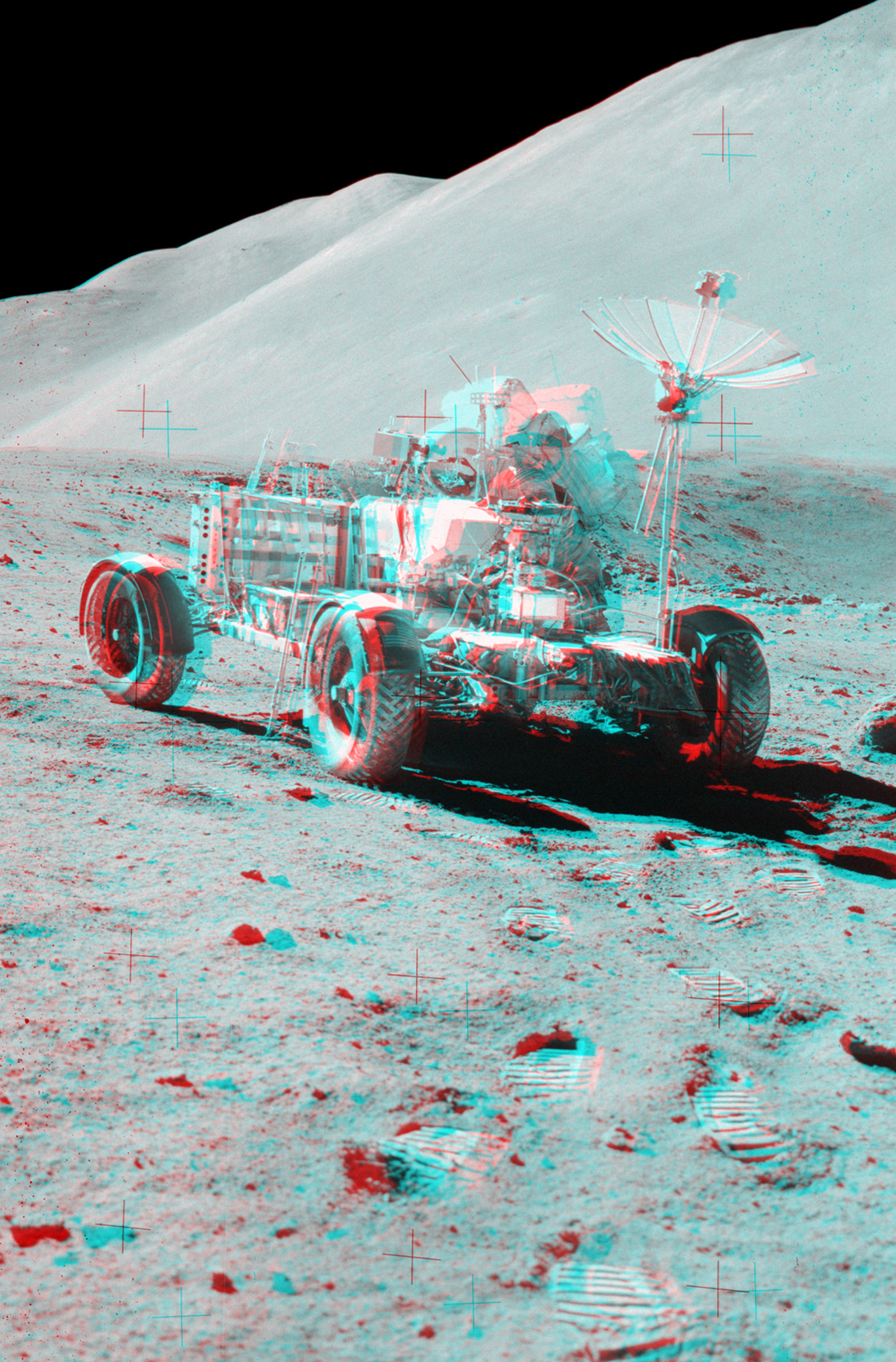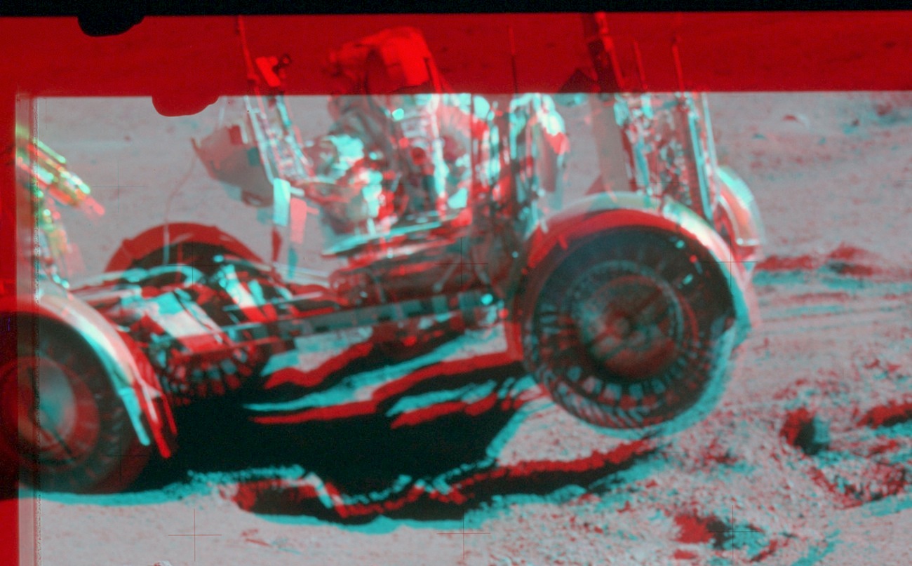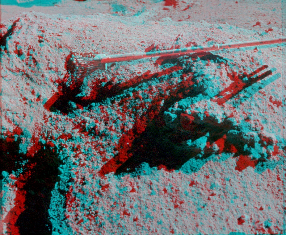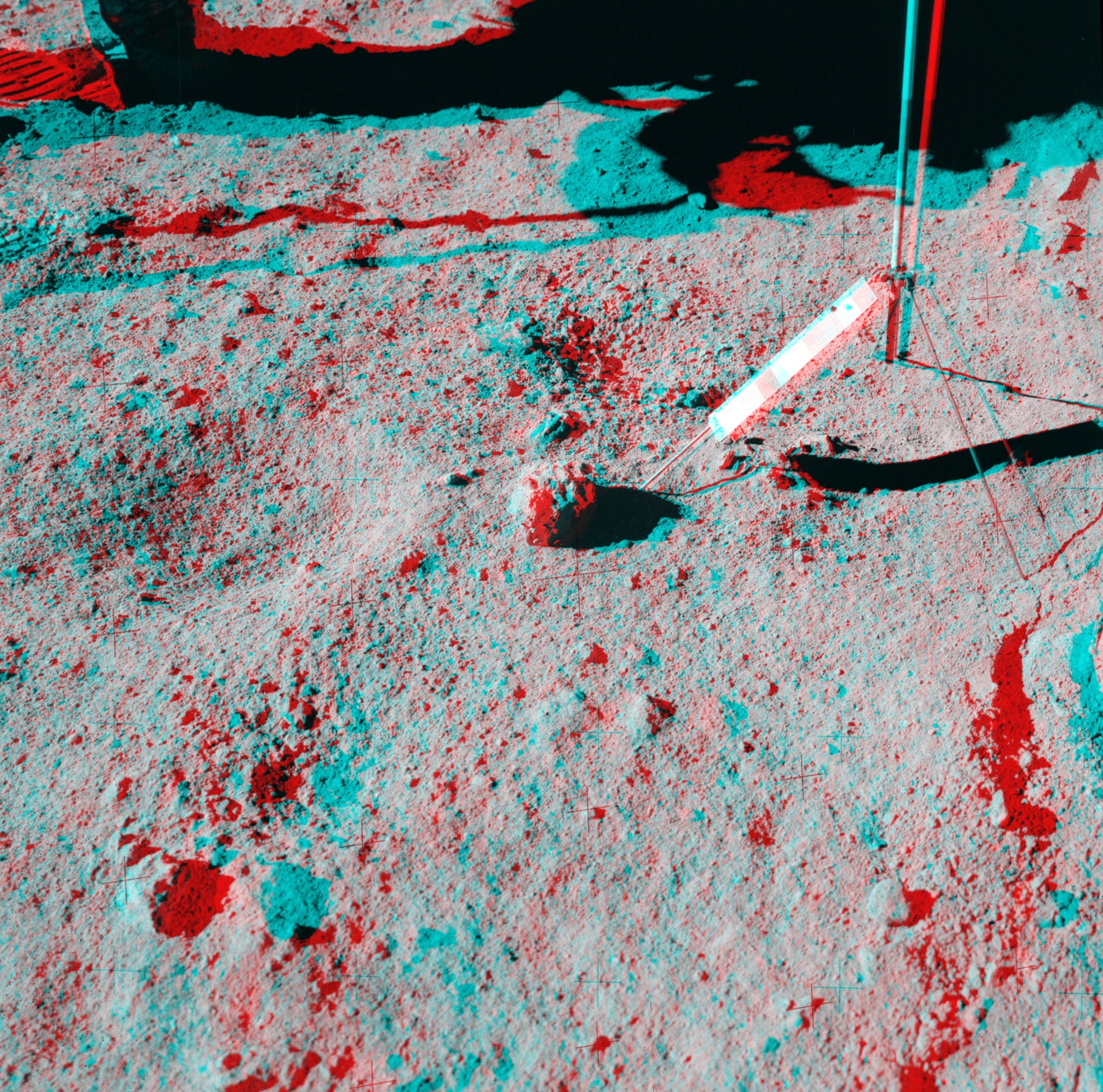 Red-Blue Anaglyph of the ALSEP, LM, LRV (0.3 Mb