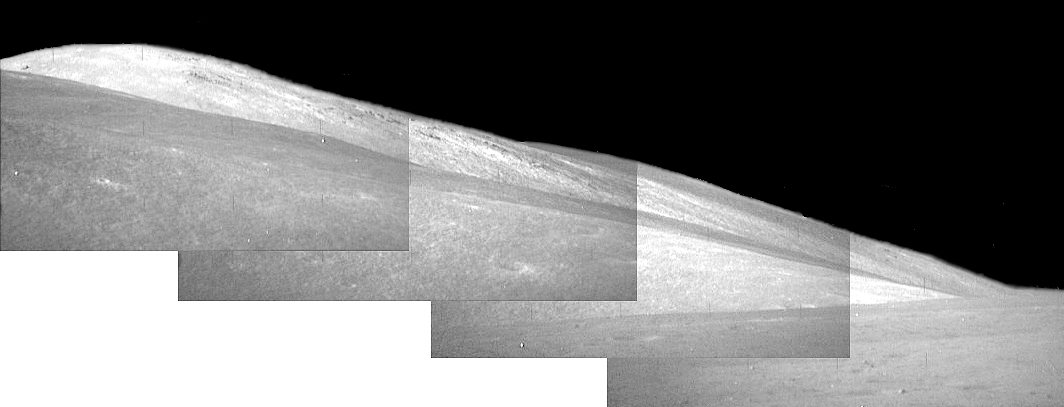 Silver Spur - named for Caltech geologist Lee Silver - is immediately east of Mt. Hadley Delta and shows striking evidence of layering. The frames are AS15-84-11250 to 11253. Assembly by Dave Byrne.106:58:27 SEVA Color Pan ( 147k )See, also, a full-resolution assembly ( 3 Mb ) with perspective correction; and a labeled comparison( 0.2 Mb ) between B&W pan frame AS15-85-11371 and a portion of Mapping Camera frame AS15-M-0414, taken at about the same time.