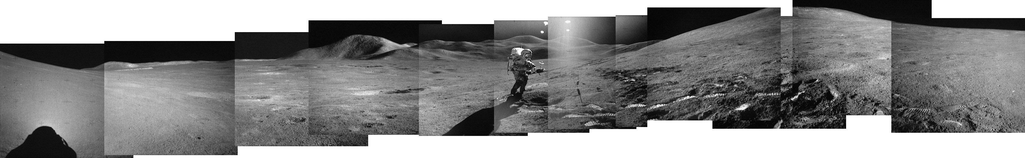 Jim had trouble keep his position on the steep slope while taking the pan. The frames are AS15-85- 11422 to 11438. Assembled by Dave Byrne.123:17:15 Second Station 2 Pan ( 364k )The portion showing the view up the rille has been assembled by Erik van Meijgaarden ( 984k ). The portion showing Dave Scott examining the glass-coated Station 2 boulder has been assembled by David Harland ( 103k ) and Erik van Meijgaarden ( 991k ).