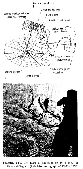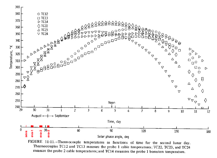 Thermocouple temperatures on the heatflow probe cables on the second lunar day. Although these are measures of the surface temperature, differences between the various thermocouples are due to differences in orientation, dust covering, shadowing, etc. I have indicated the blocks of solar elevation that correspond to the EVAs, which occurred on the previous lunar day.Figure 12-3 ( 71k )