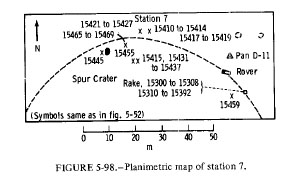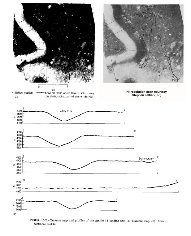 Traverse paths and rille profiles. Photograph courtesy NASA and the Lunar and Planetary Institute. Hi-resolution scan by Stephen Tellier (LPI).Figure 5-3 ( 93k or 1056k )