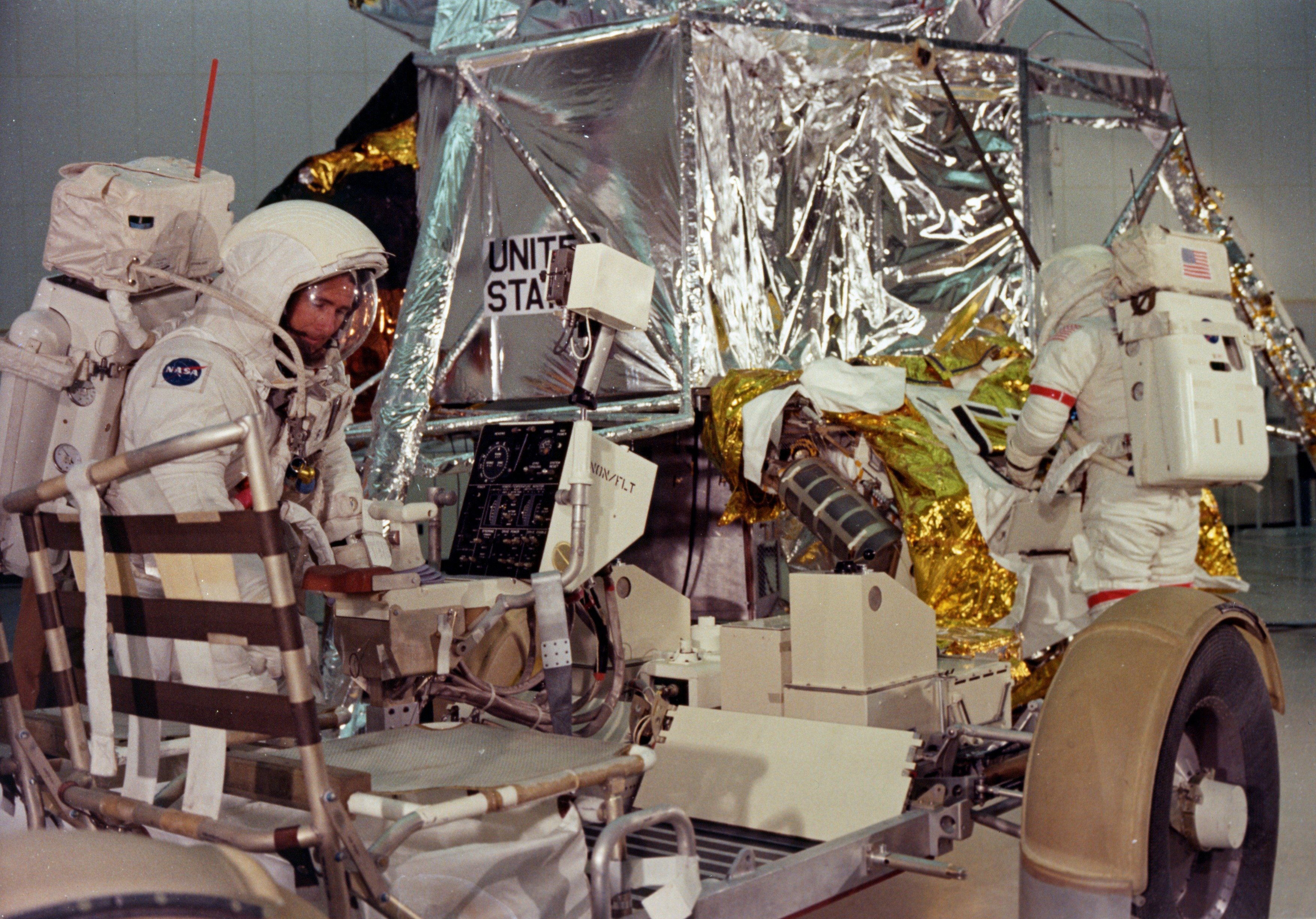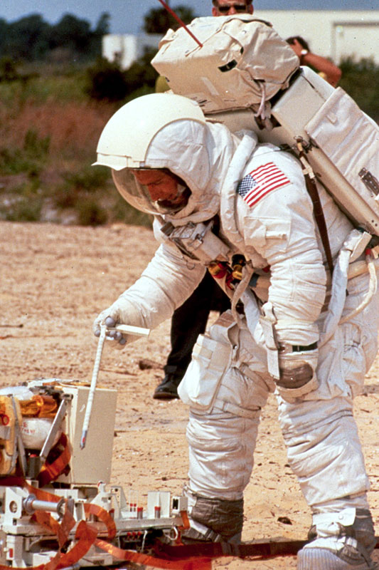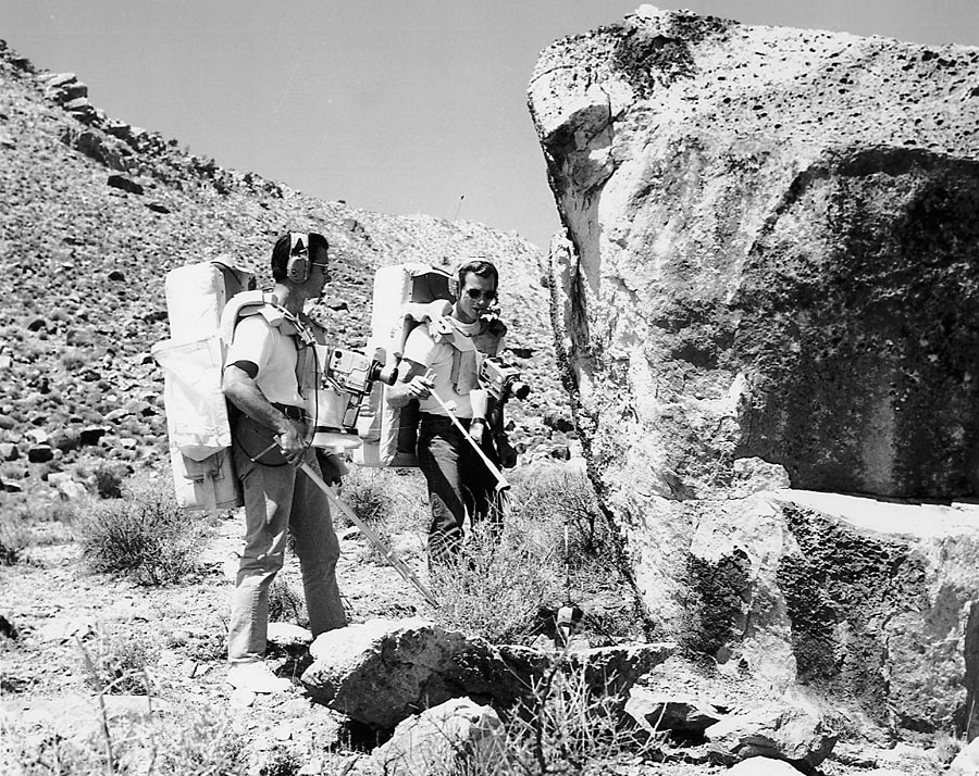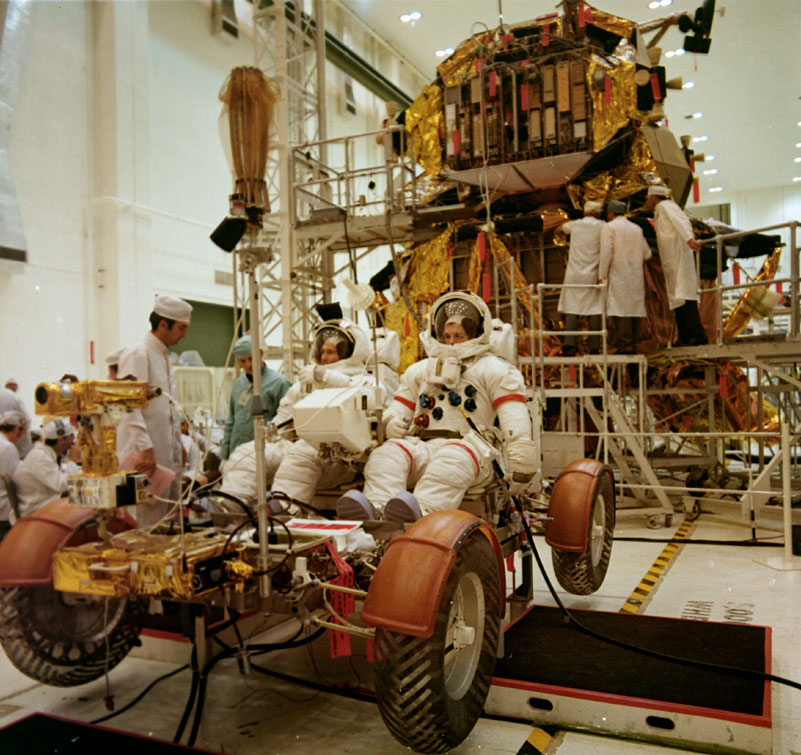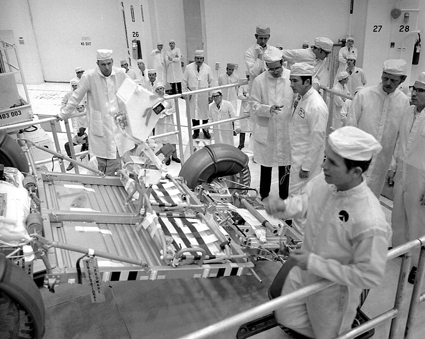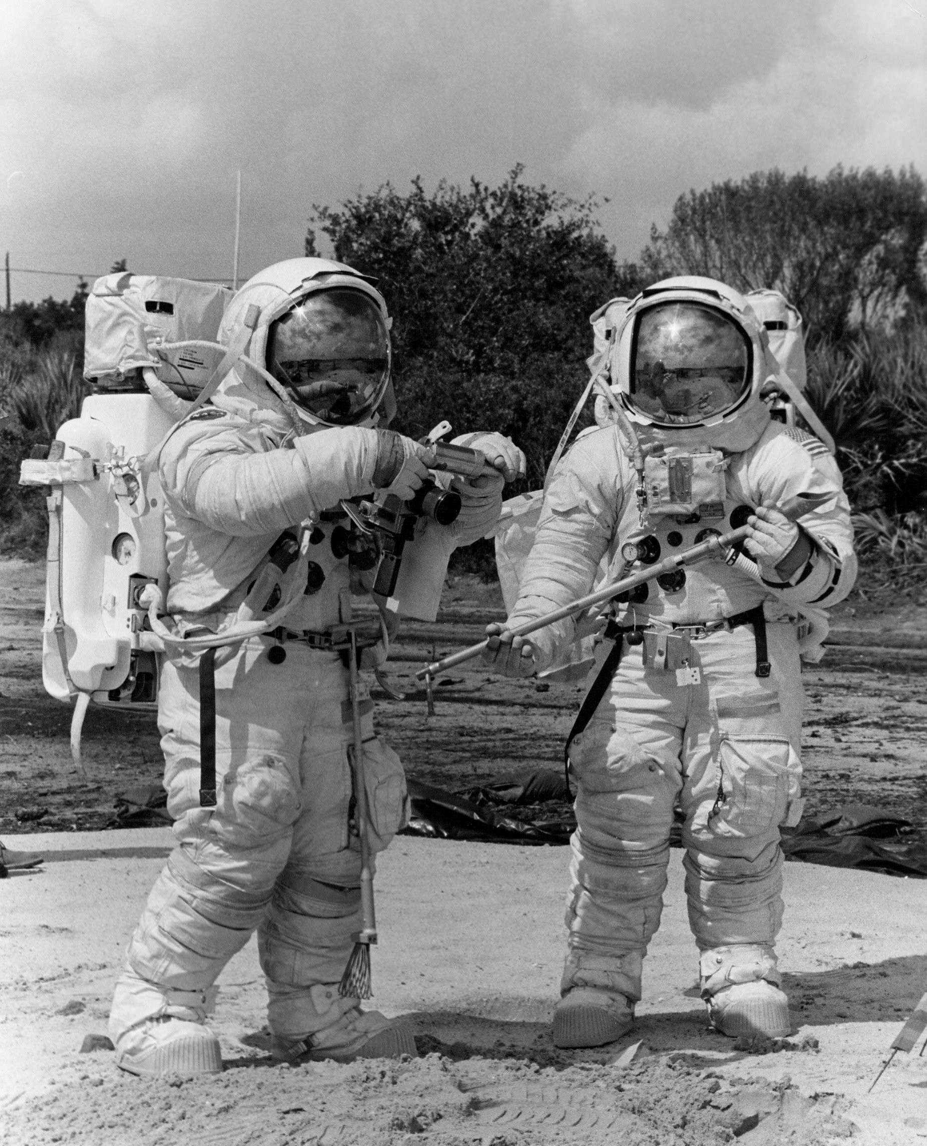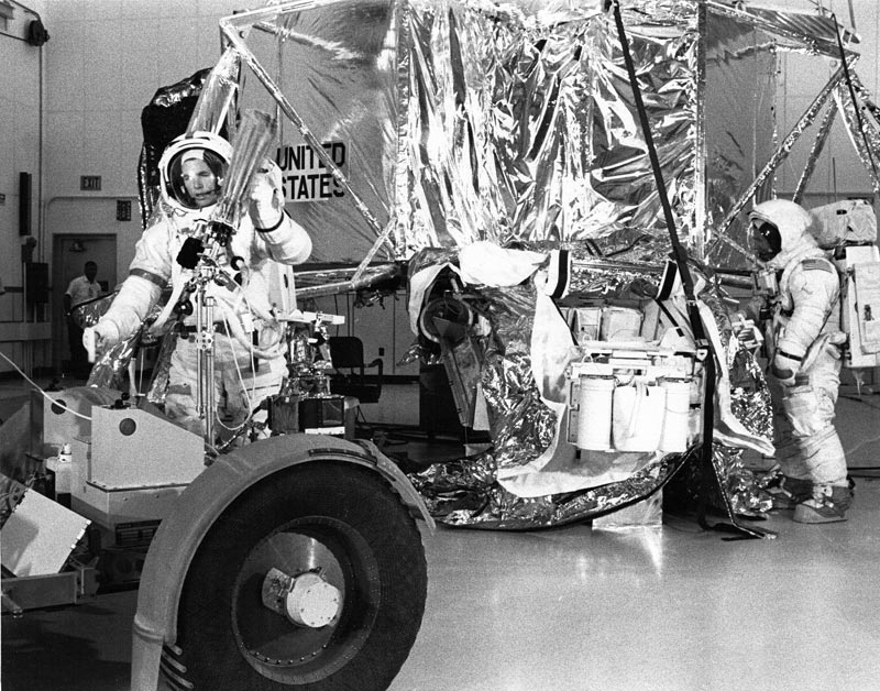 Dave Scott and Joe Allen examines sample 15415 in the Lunar Receiving Lab after the flight. Scan courtesy Mike Gentry and Susan Erskin, NASA Johnson.S71-44206 ( 53k )