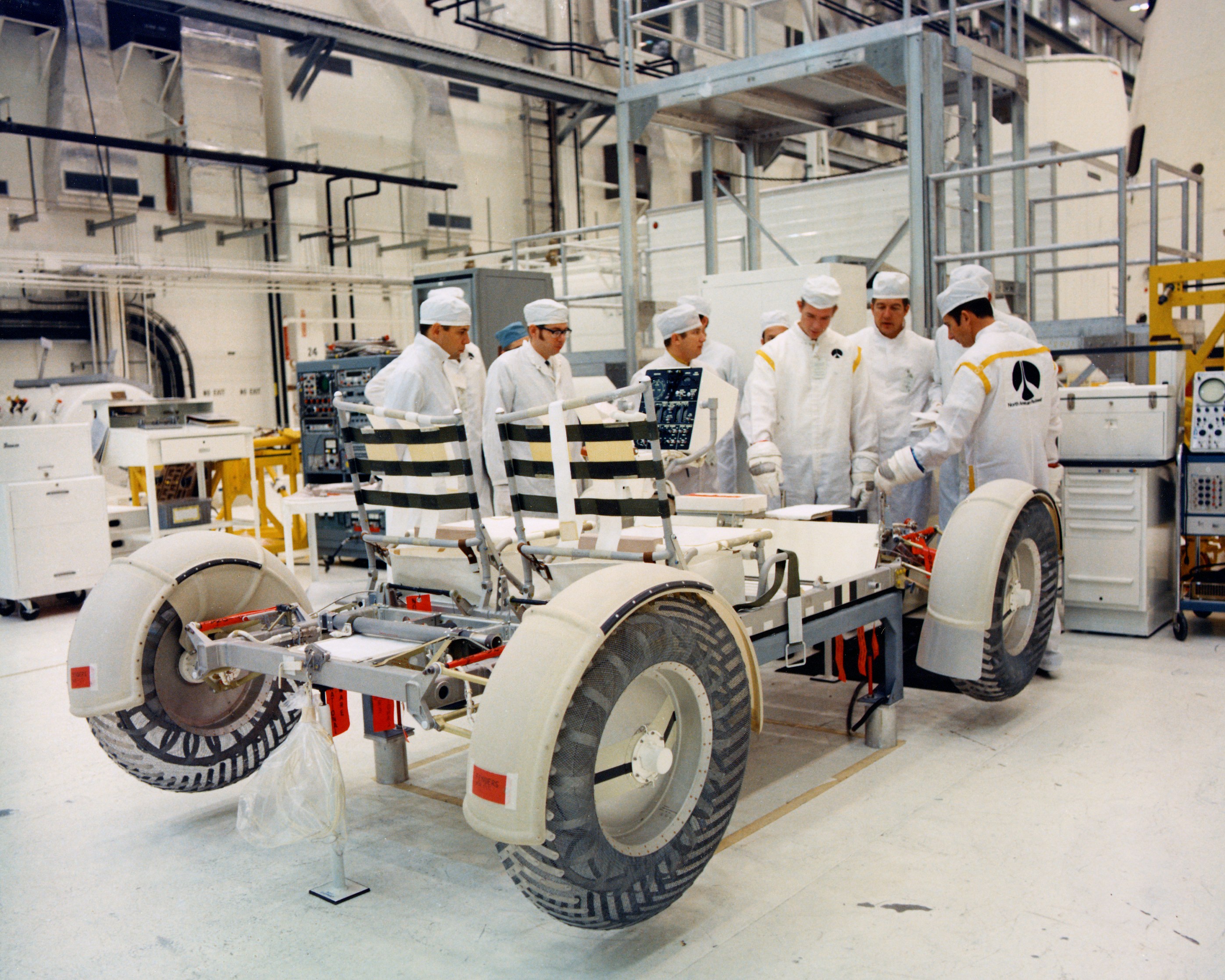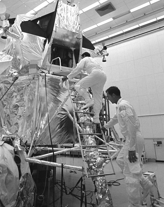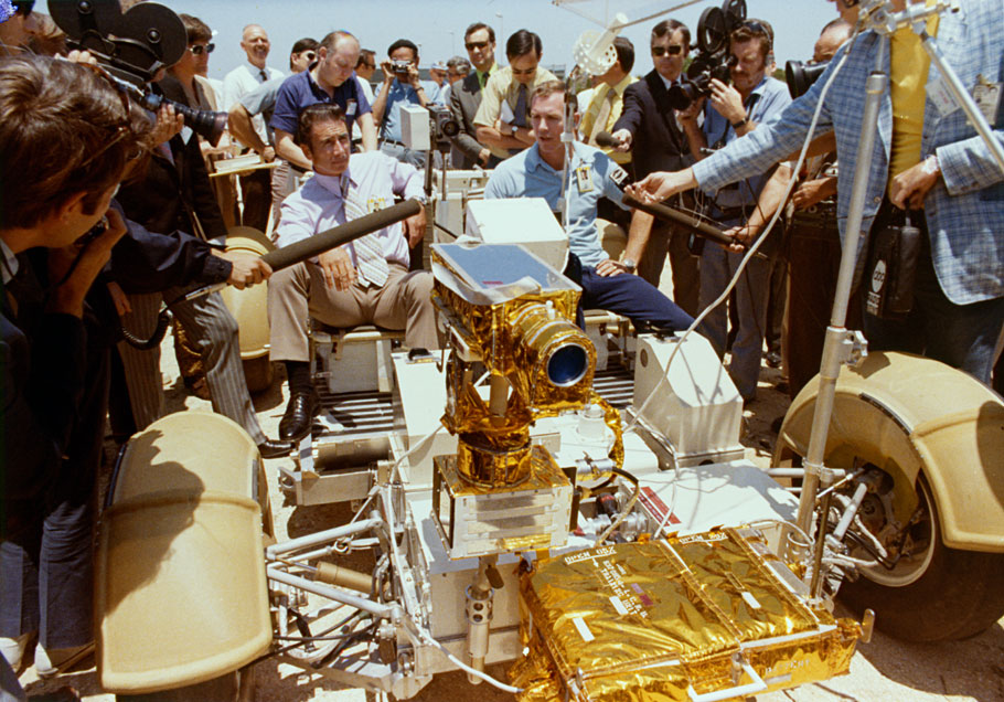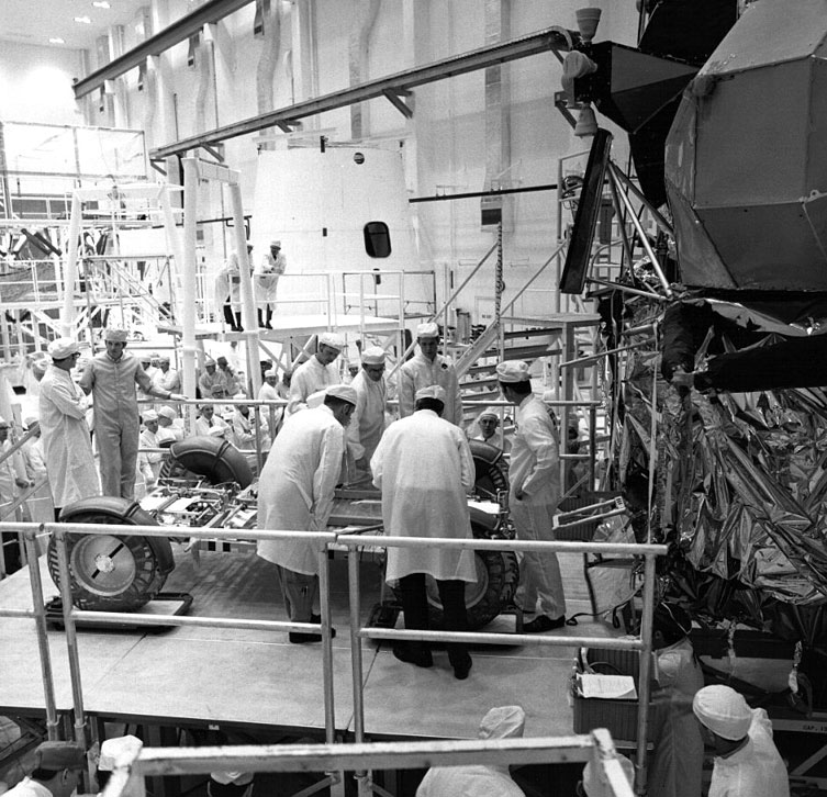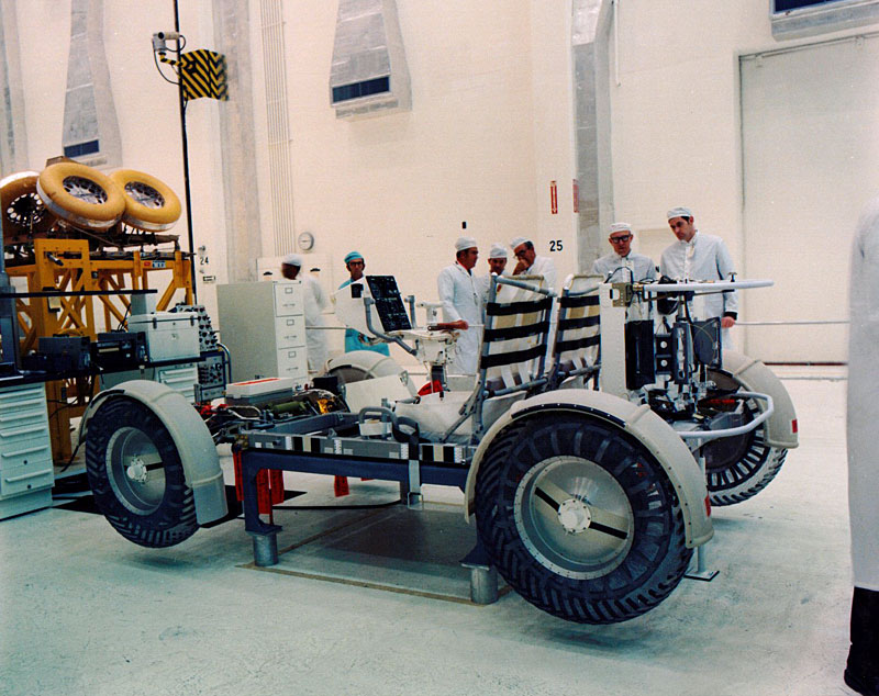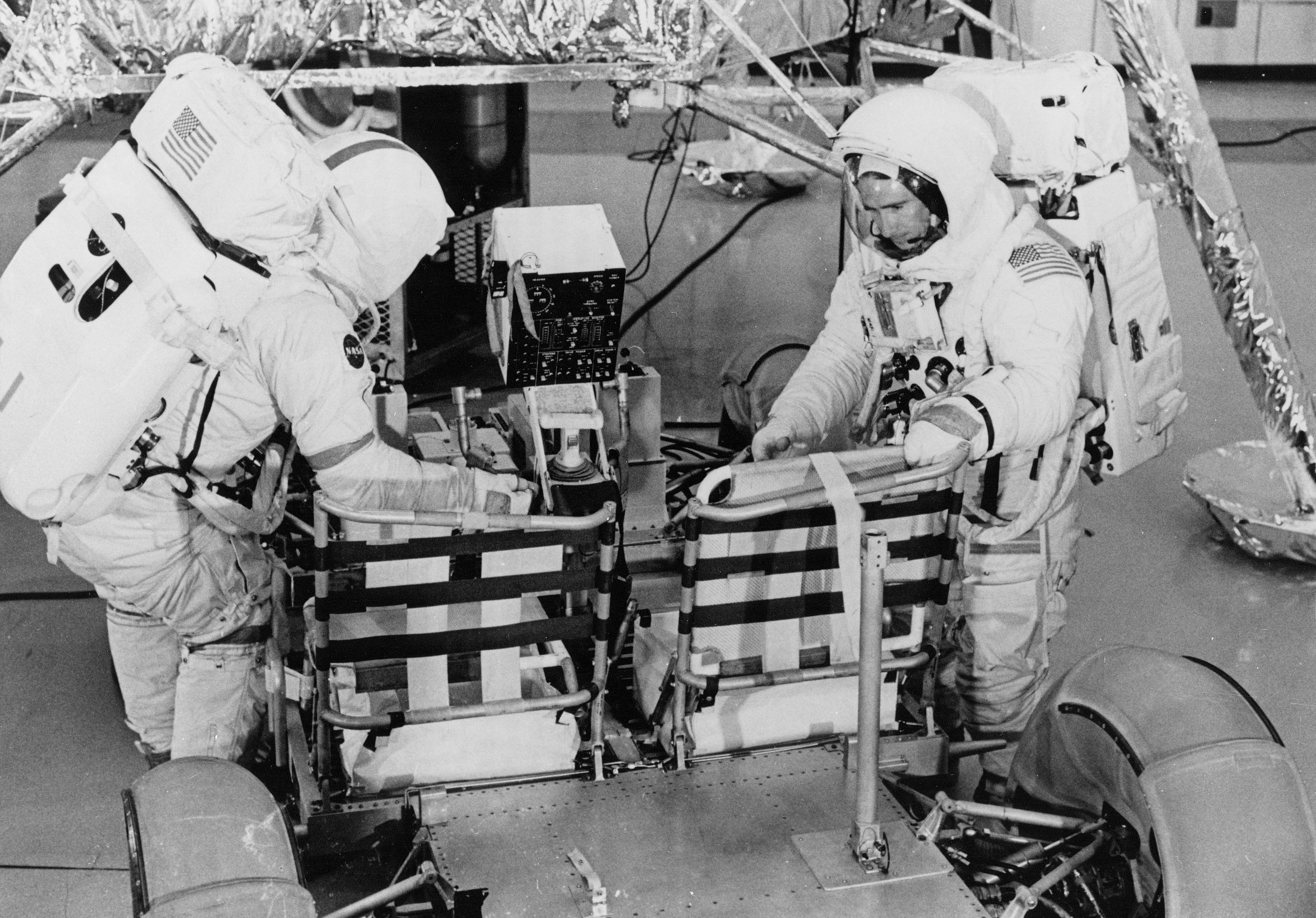 Dave Scott and Joe Allen examines sample 15415 in the Lunar Receiving Lab after the flight. Scan courtesy Mike Gentry and Susan Erskin, NASA Johnson.S71-44206 ( 53k )