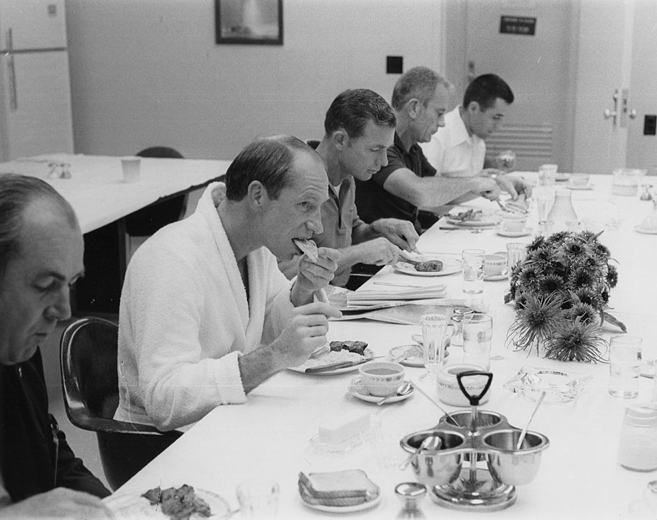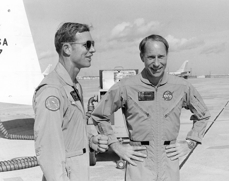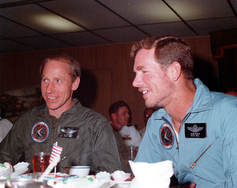 Al Worden (left) and Dave Scott at dinner aboard the Okinawa. 7 August 1971. Scan by J.L. Pickering.71-H-1271 ( 119k )