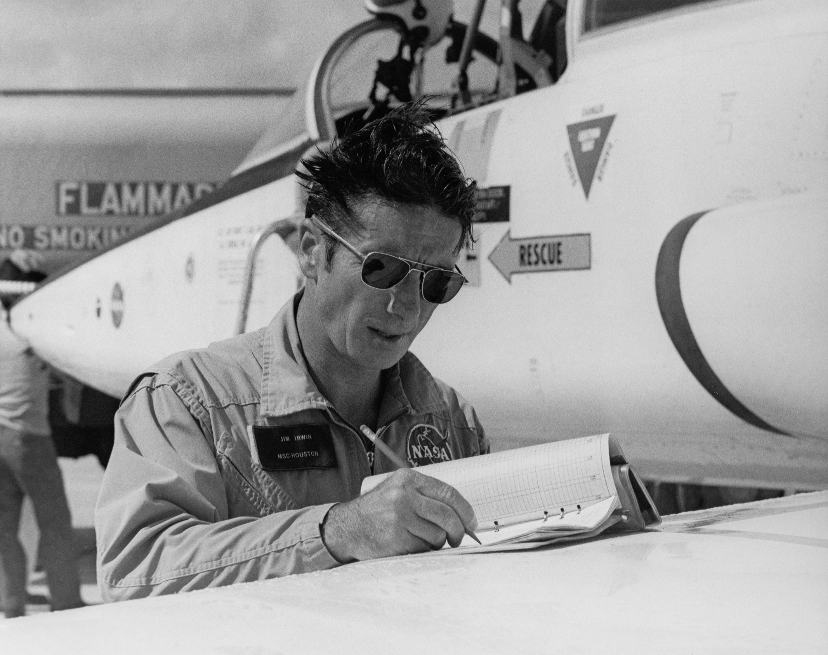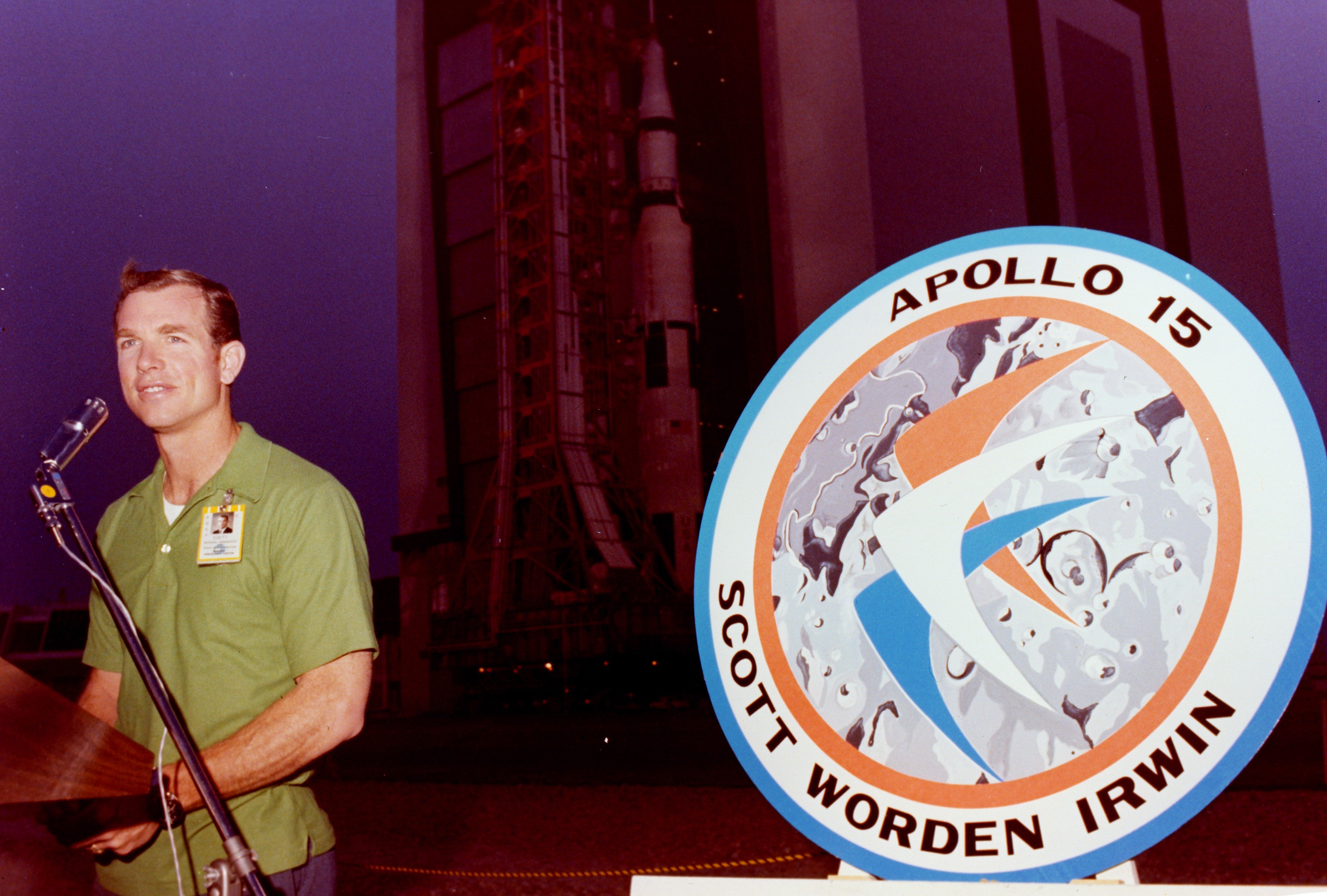Jim Irwin, flanked by Scott (left) and Worden (right), makes a few remarks after welcoming ceremony at Ellington Air Force Base. 12 August 1971. Scan by J.L. Pickering.71-HC-1046 ( 112k )
