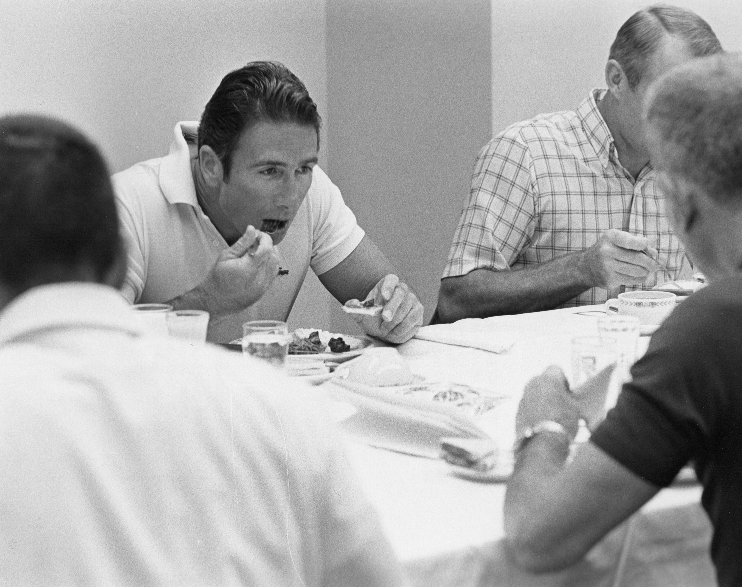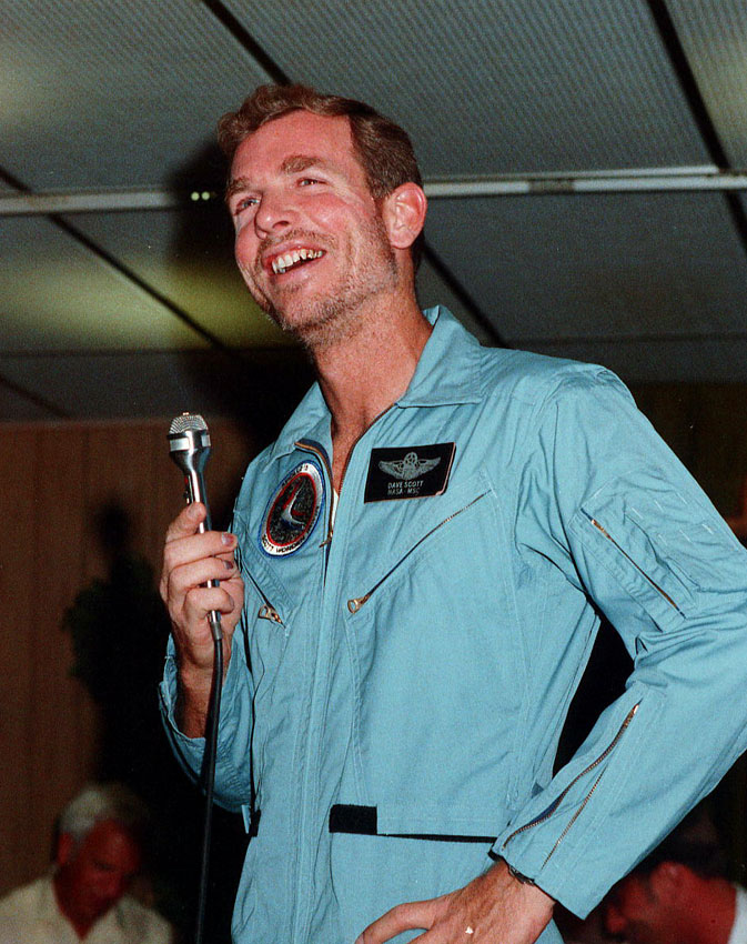 Dave Scott makes some pre-dinner remarks. Notice the damaged to his fingernails from wearing the EVA gloves. 7 August 1971. Scan by J.L. Pickering.S71-42196 ( 167k )