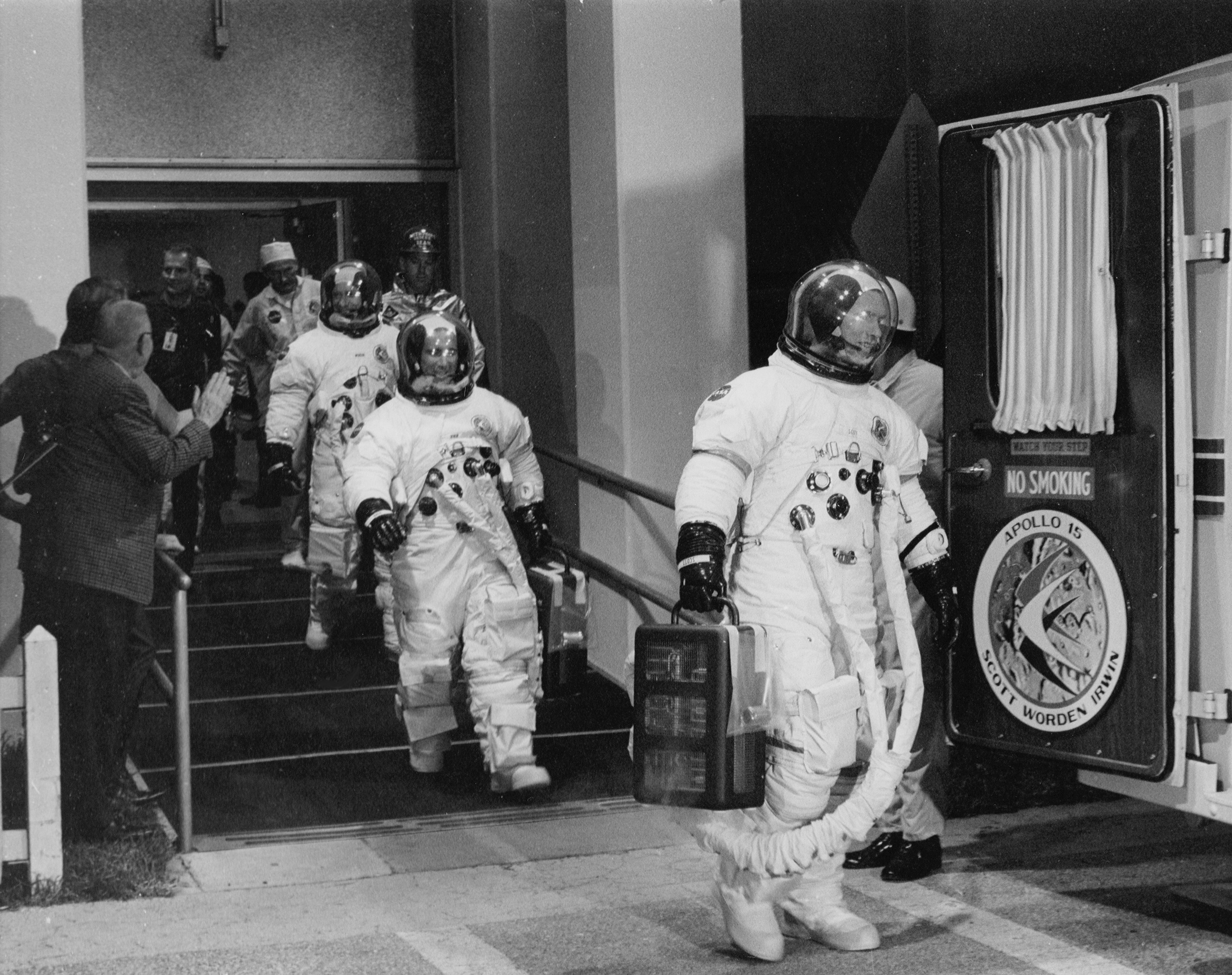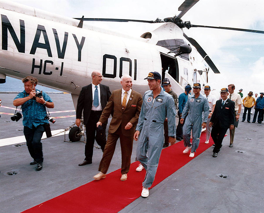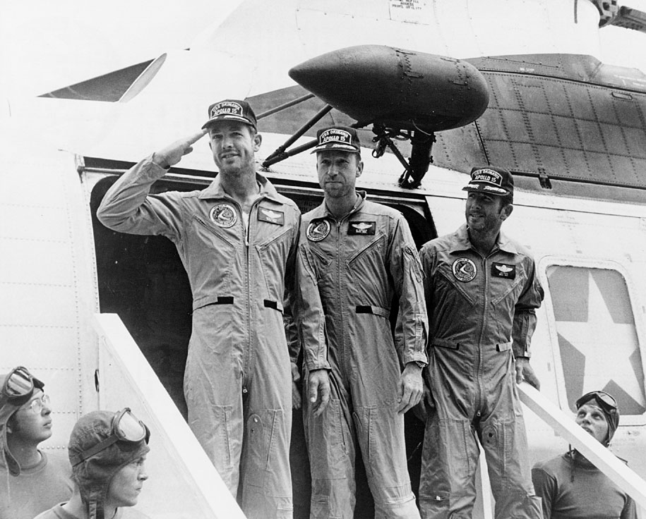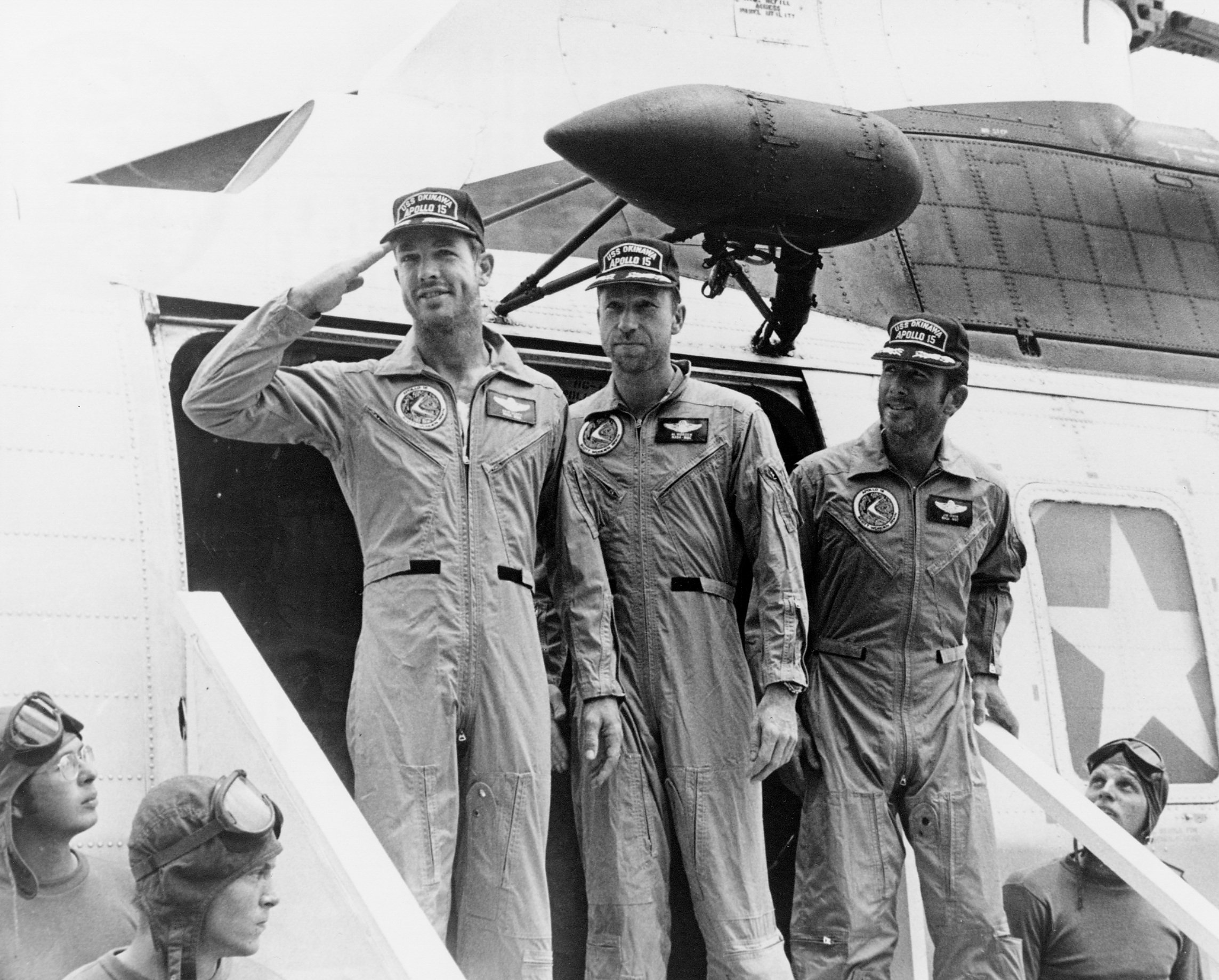 Dave Scott (left), Al Worden, and Jim Irwin exit the recovery helicopter aboard U.S.S. Okinawa. 7 August 1971. Scan by Kipp Teague.71-H-1238 ( 150k or 645k )