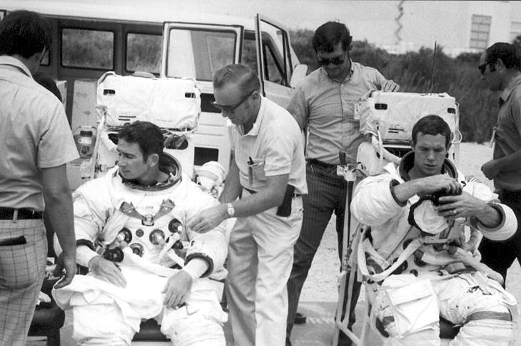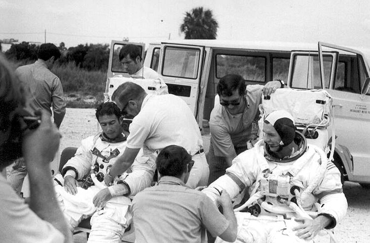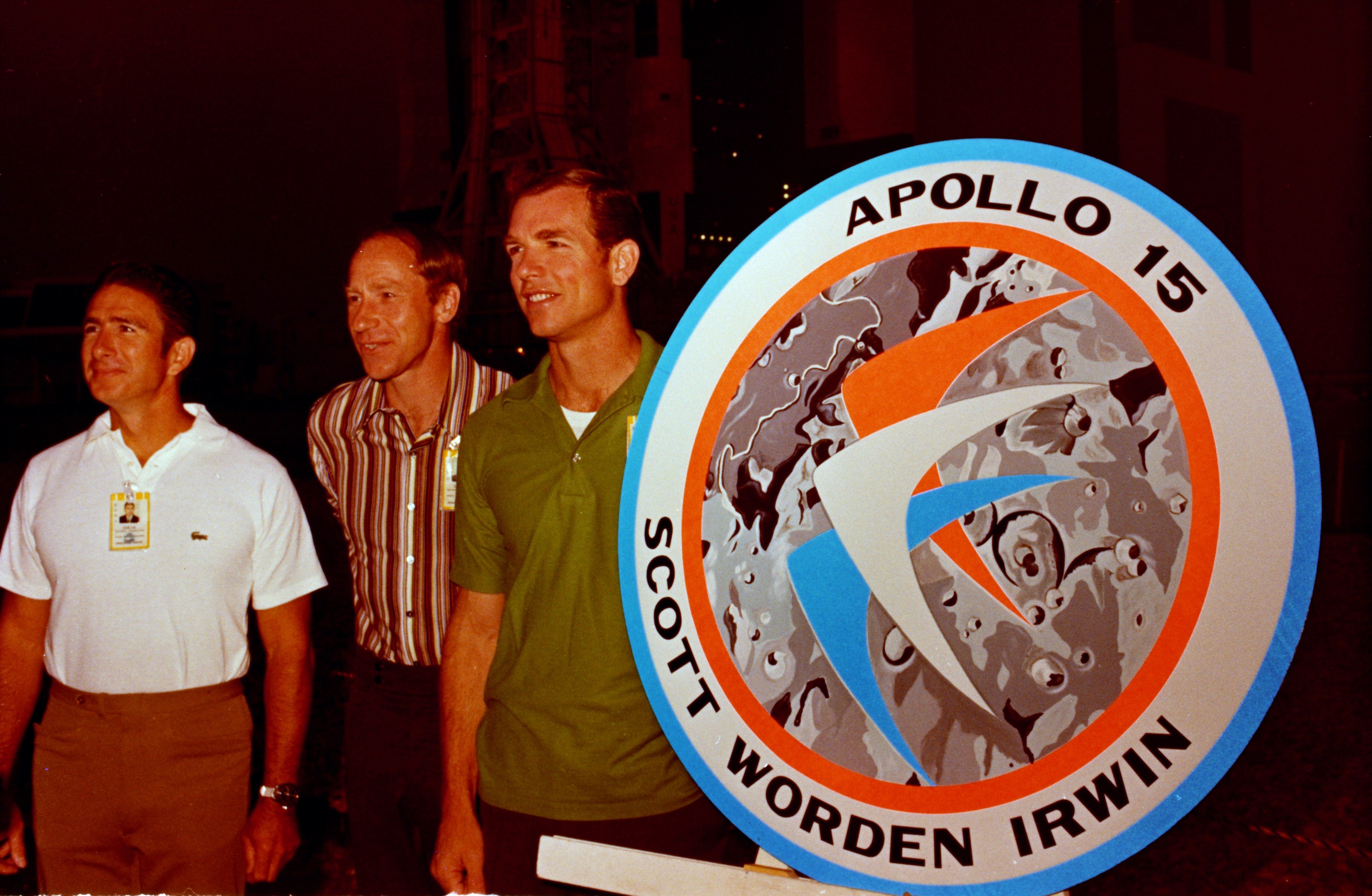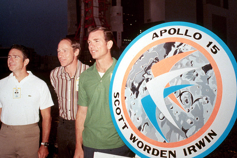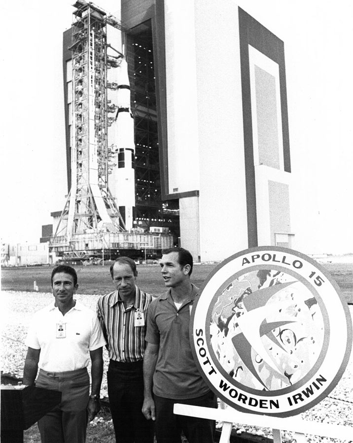 Dave Scott (left), Al Worden, and Jim Irwin exit the recovery helicopter aboard U.S.S. Okinawa. 7 August 1971. Scan by Kipp Teague.71-H-1238 ( 150k or 645k )
