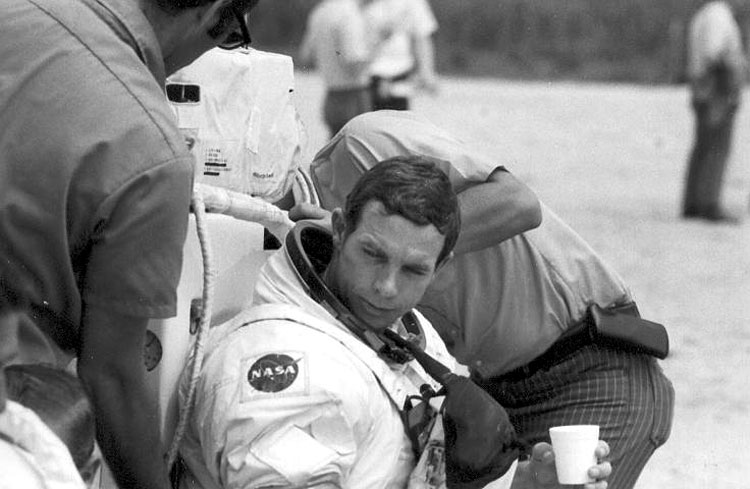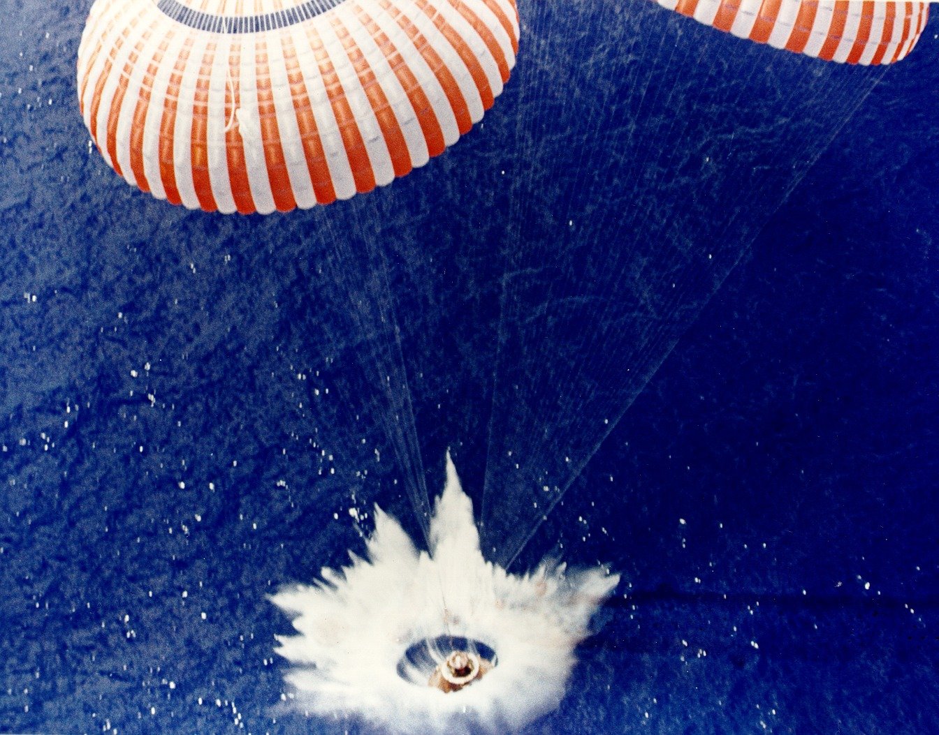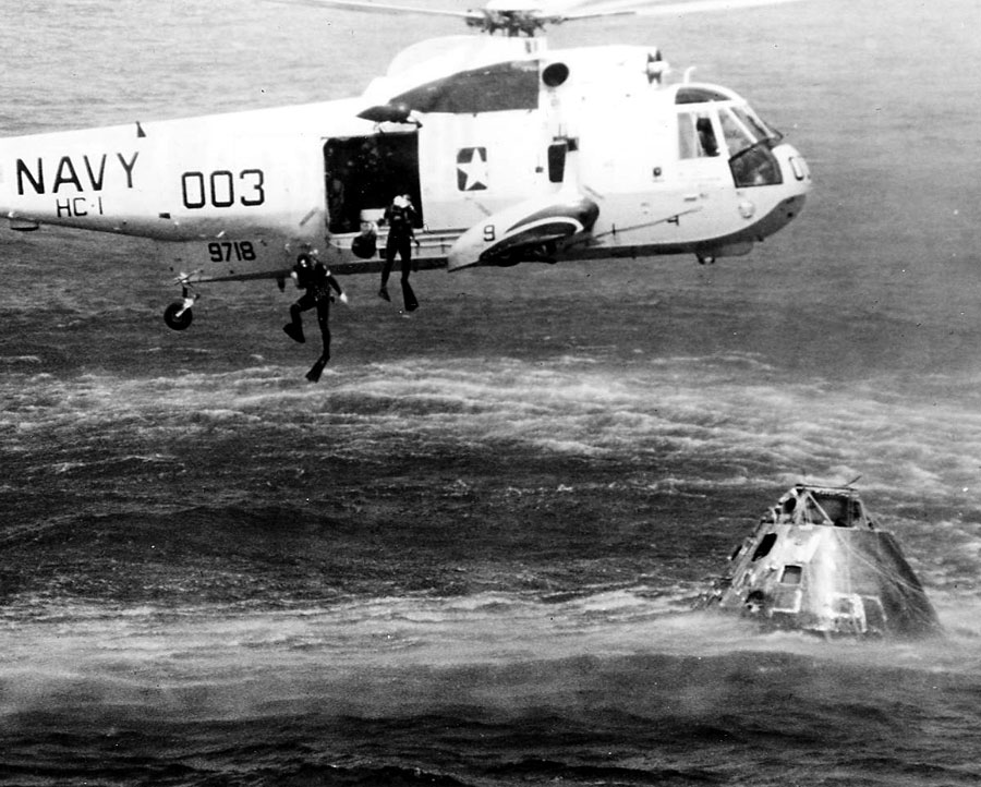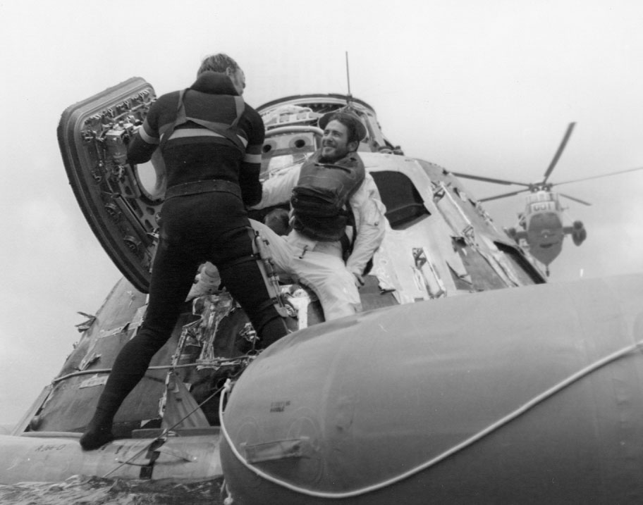 Dave Scott geets a Navy diver who has just opened the Command Module hatch. 7 August 1971. Scan by Kipp Teague.71-H-1243 ( 79k or 382k )