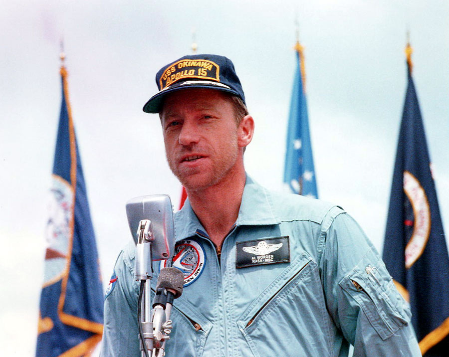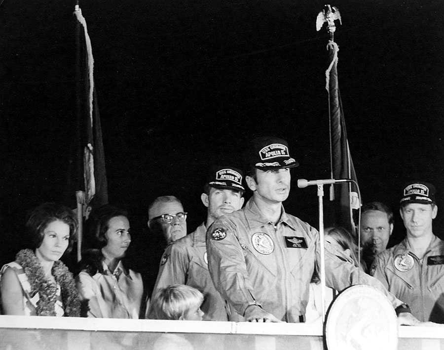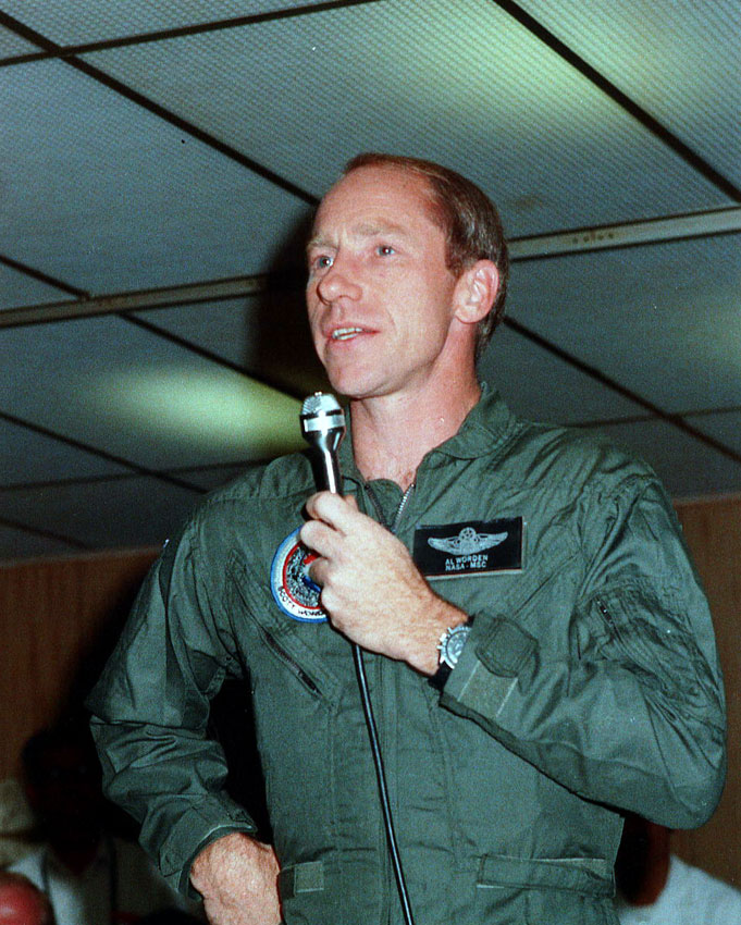 Al Worden addresses recovery personnel and dignataries onboard the Okinawa.. 7 August 1971. Scan by J.L. Pickering.S71-42264 ( 116k )