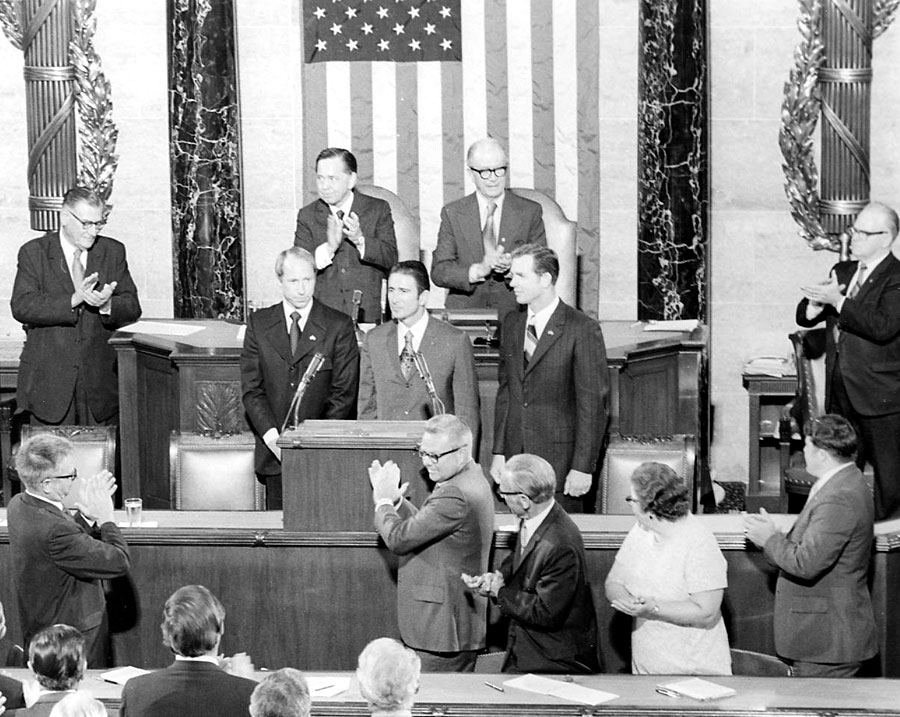 Worden (left), Irwin, and Scott receive a standing ovation at a joint session of Congress. 12 August 1971. Scan by J.L. Pickering.71-H-1472 ( 172k )