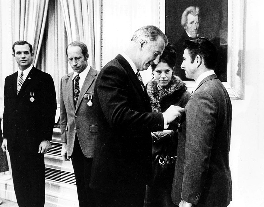 Dave Scott (left), Al Worden, and Jim Irwin receive NASA Distinguished Service Medal from Vice President Spiro T. Agnew. 8 December 1971. Scan by J.L. Pickering.S71-42955 ( 4360k or 264k )