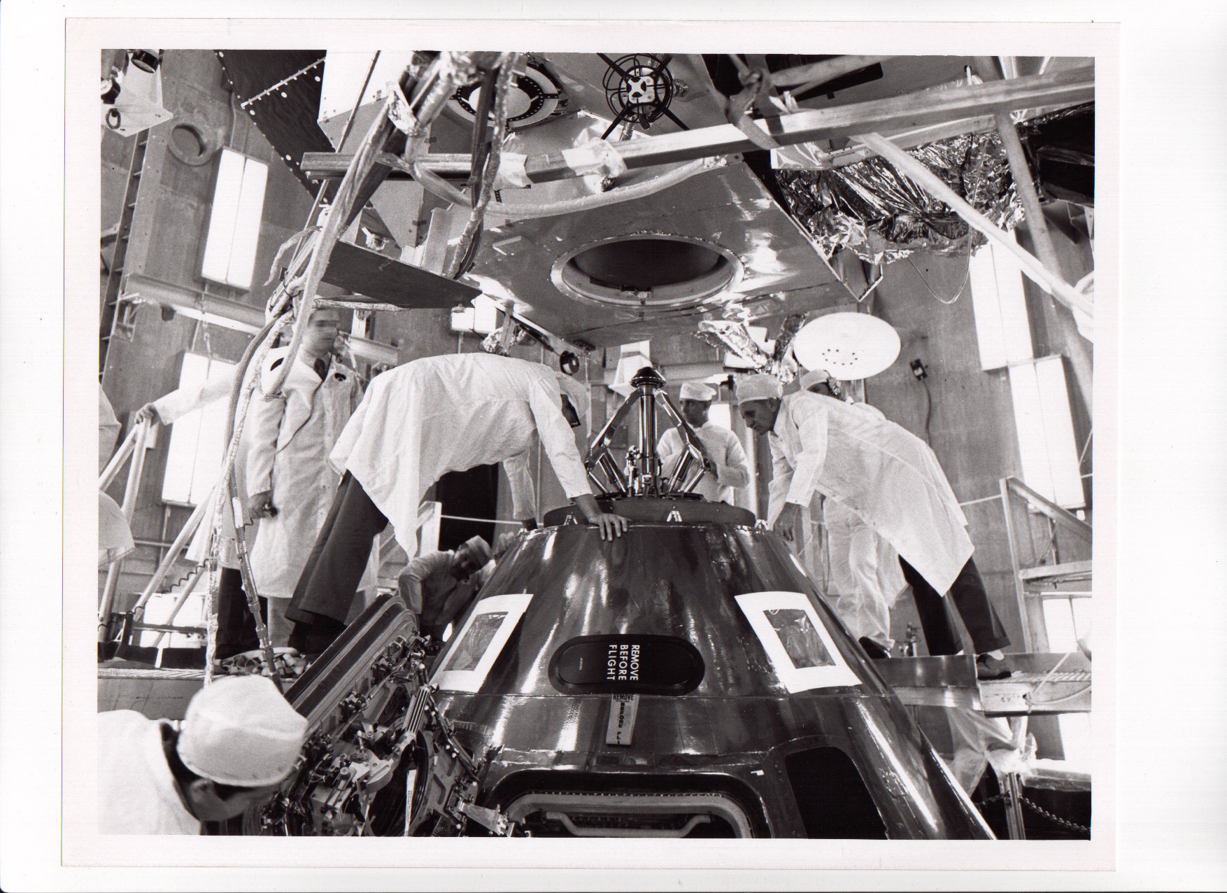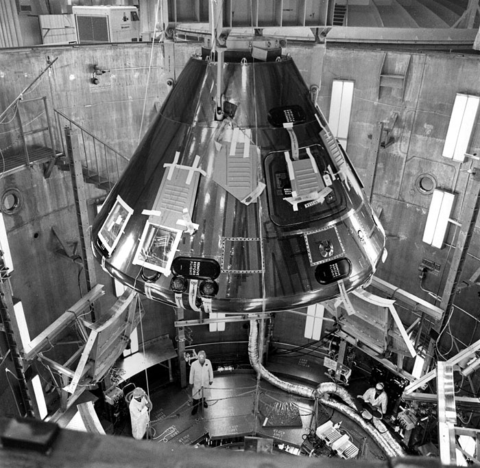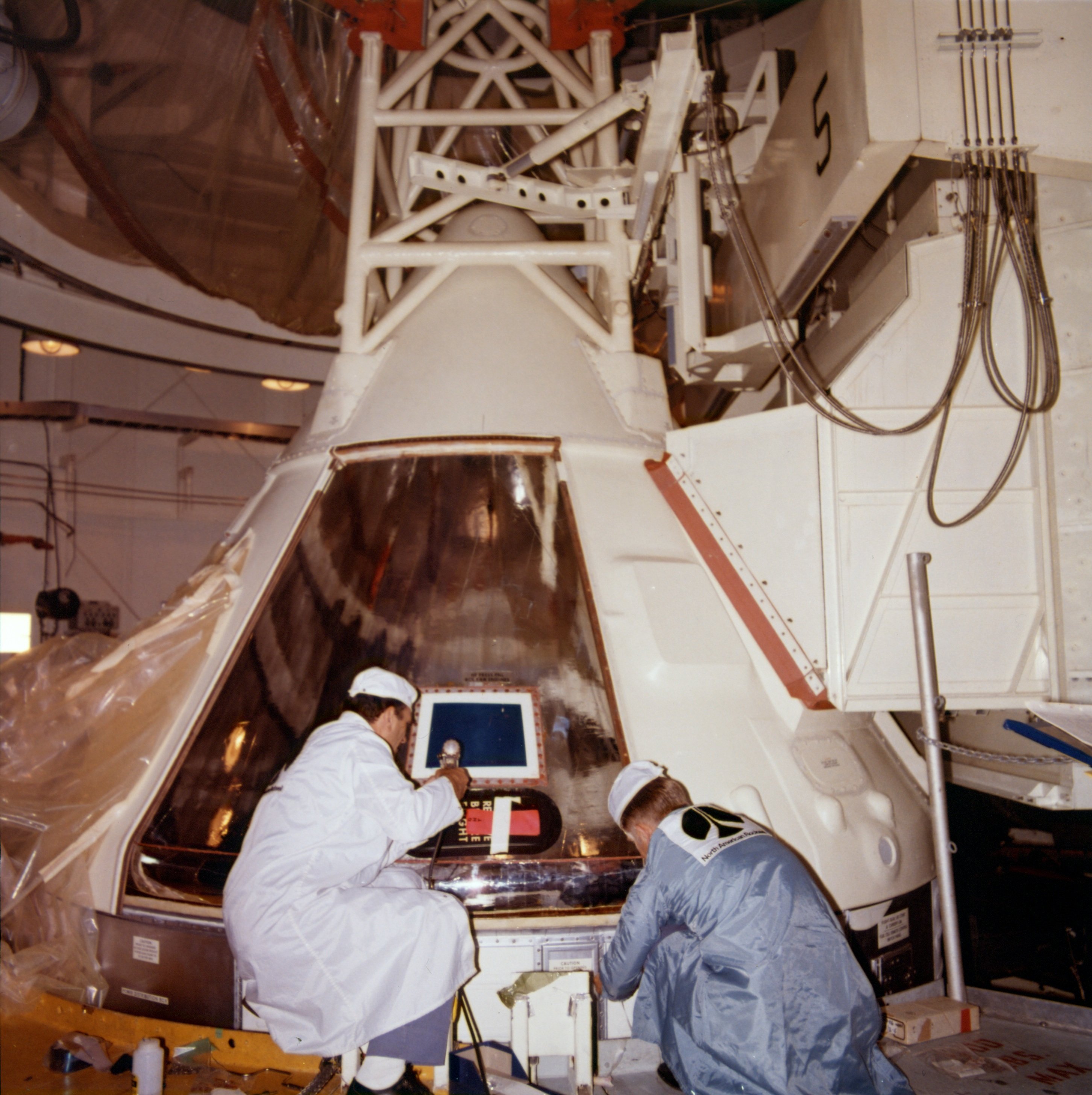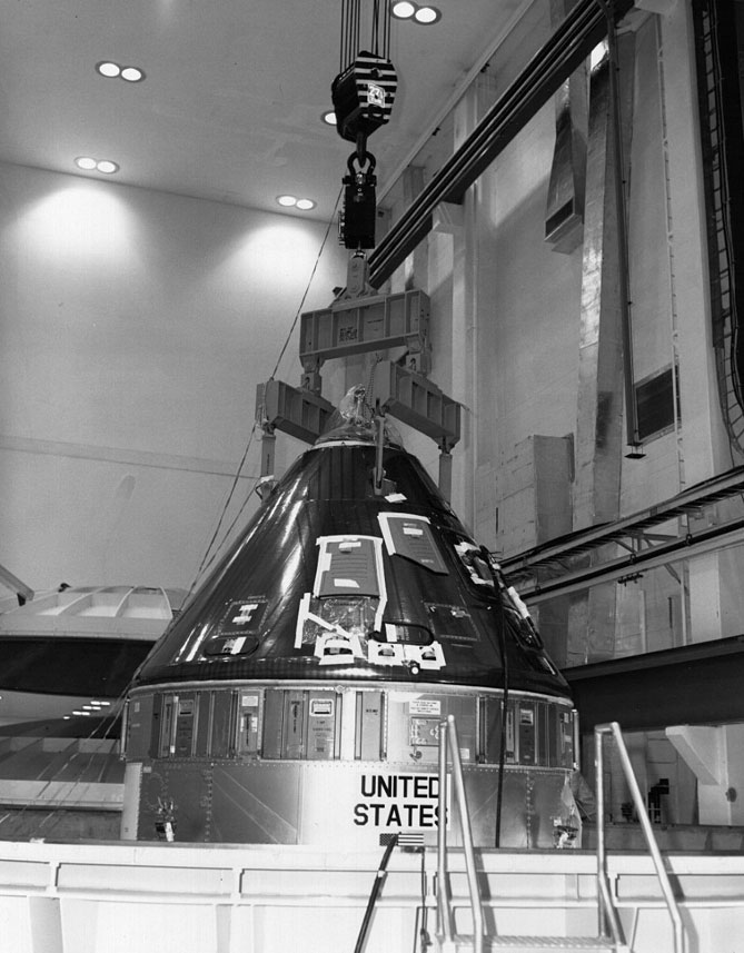 Command Module below decks in the U.S.S. Okinawa. Scan by J.L. Pickering.S71-42195 ( 175k )