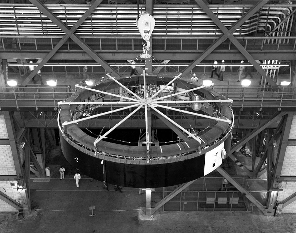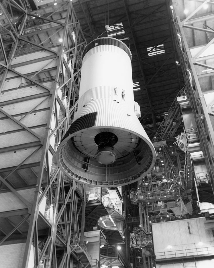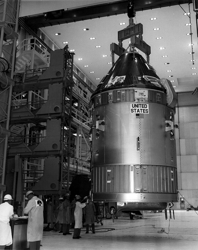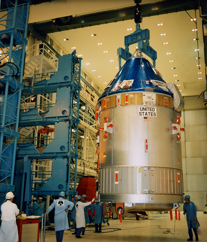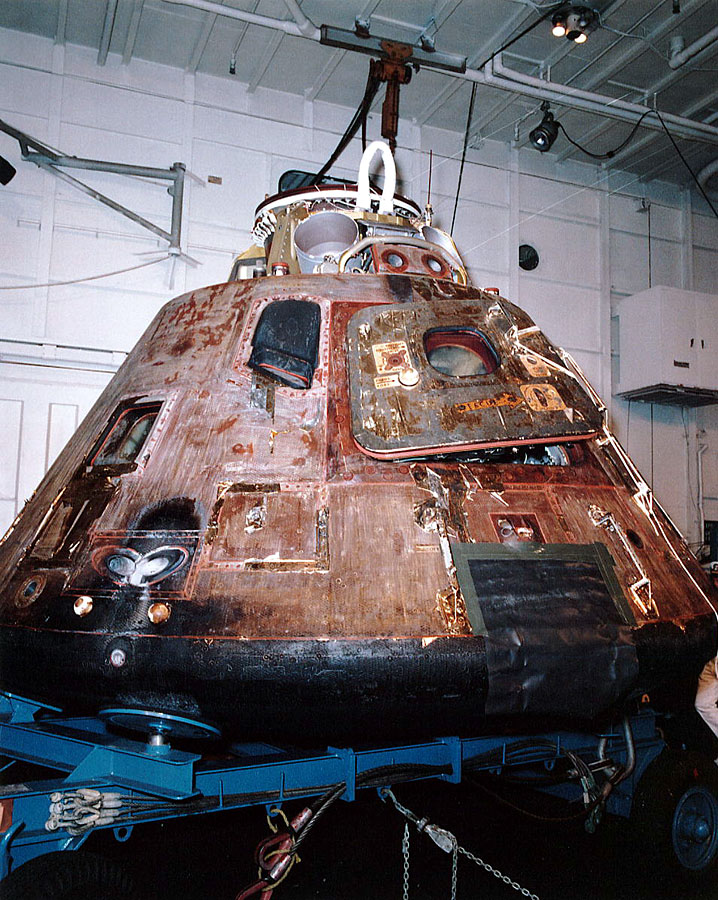 Command Module below decks in the U.S.S. Okinawa. Scan by J.L. Pickering.S71-42195 ( 175k )