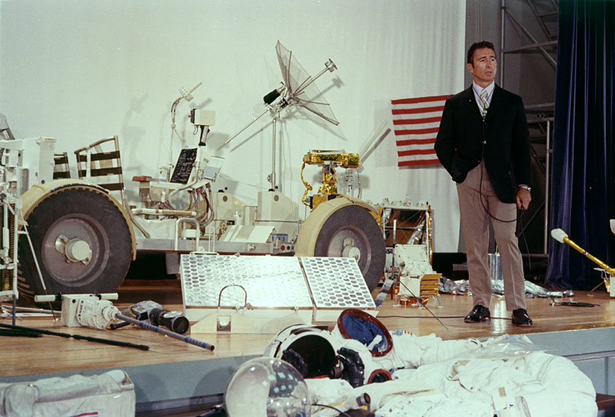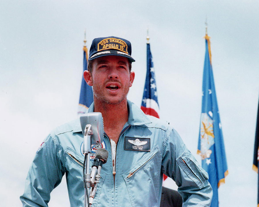 Dave Scott addresses recovery personnel and dignataries onboard the Okinawa.. 7 August 1971. Scan by J.L. Pickering.S71-43427 ( 164k )