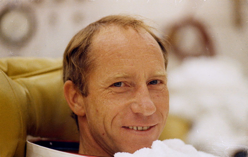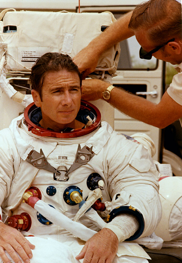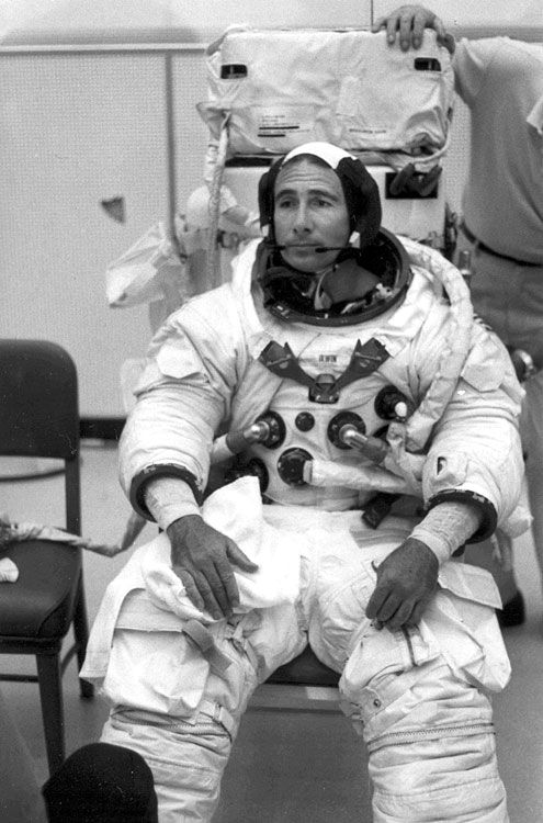 A Navy diver helps a smiling Jim Irwin out of the Command Module into the raft. 7 August 1971. Scan by Kipp Teague.S71-42065 ( 161k )