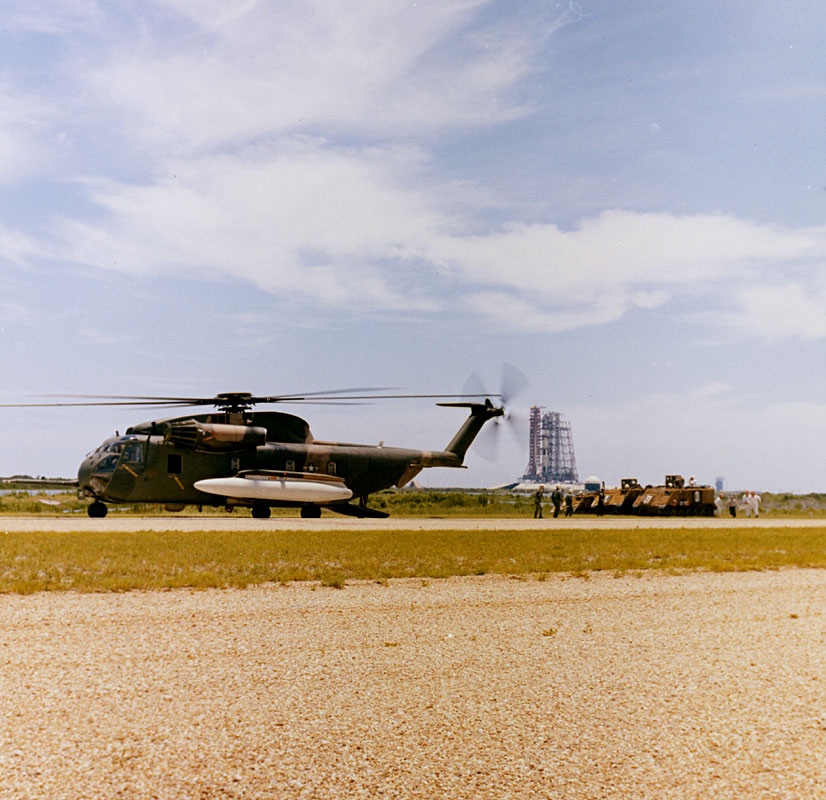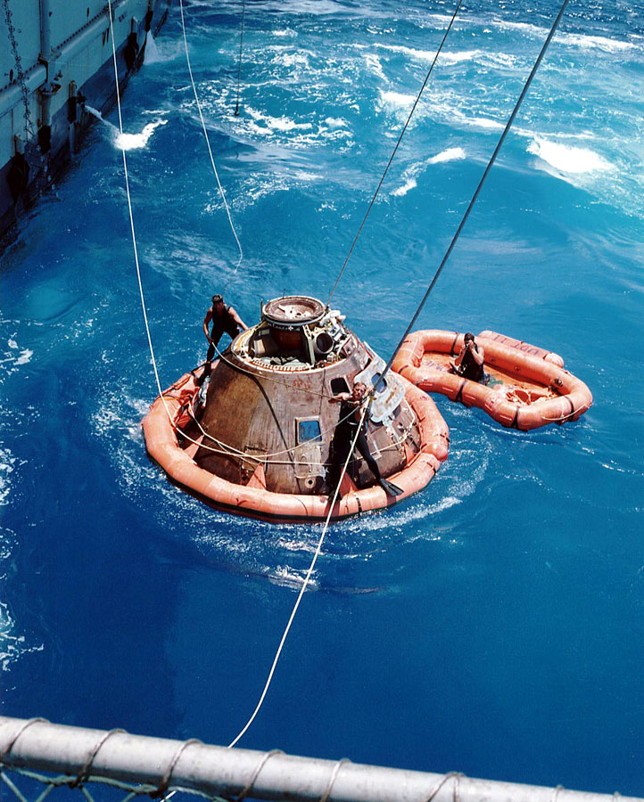 Recovery personnel prepare to hoist the Command Module aboard the U.S.S. Okinawa. 7 August 1971. Scan by J.L. Pickering.S71-42032 ( 229k )