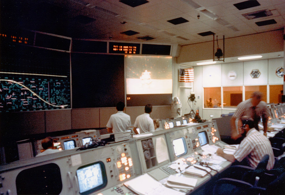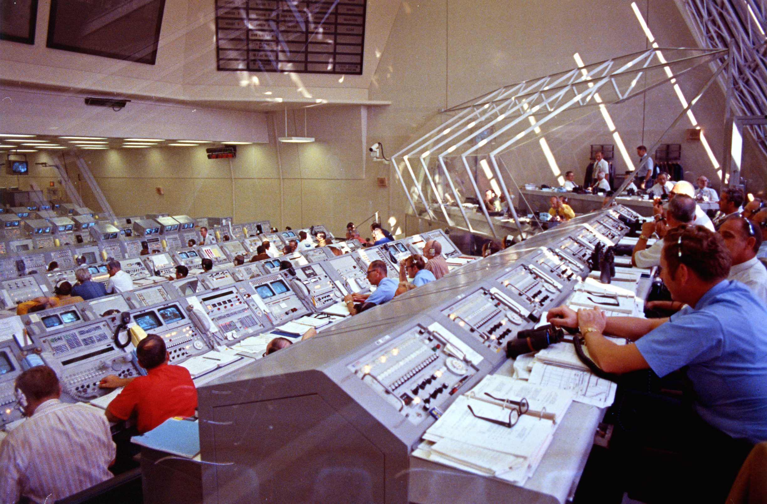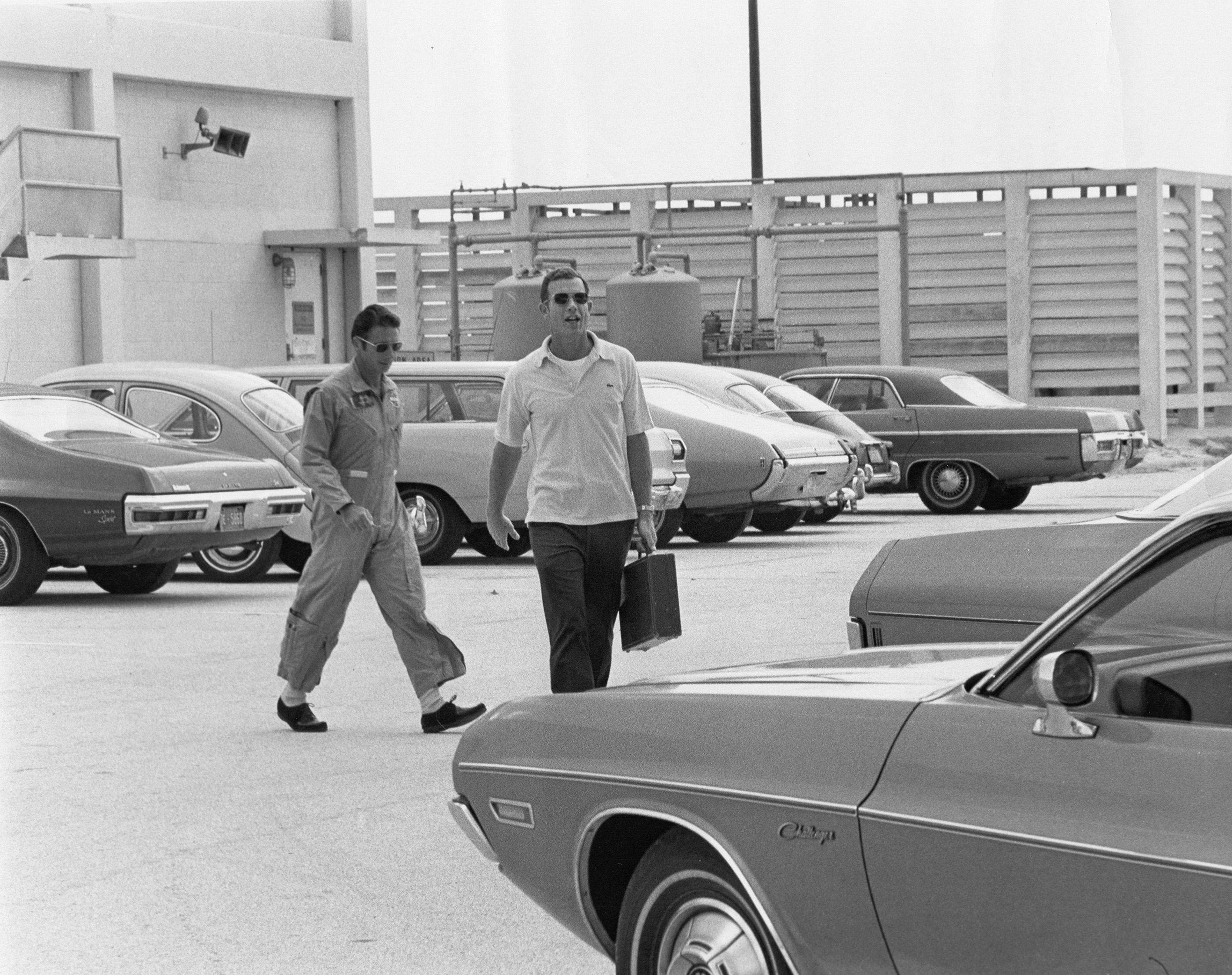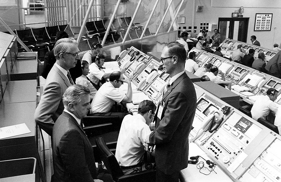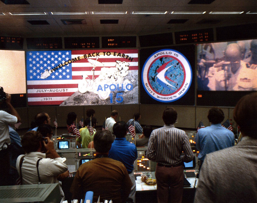 Control Room personnel in Houston watch welcoming ceremonies taking place on the Okinawa. 7 August 1971. Scan by J.L. Pickering.S71-42024 ( 202k )