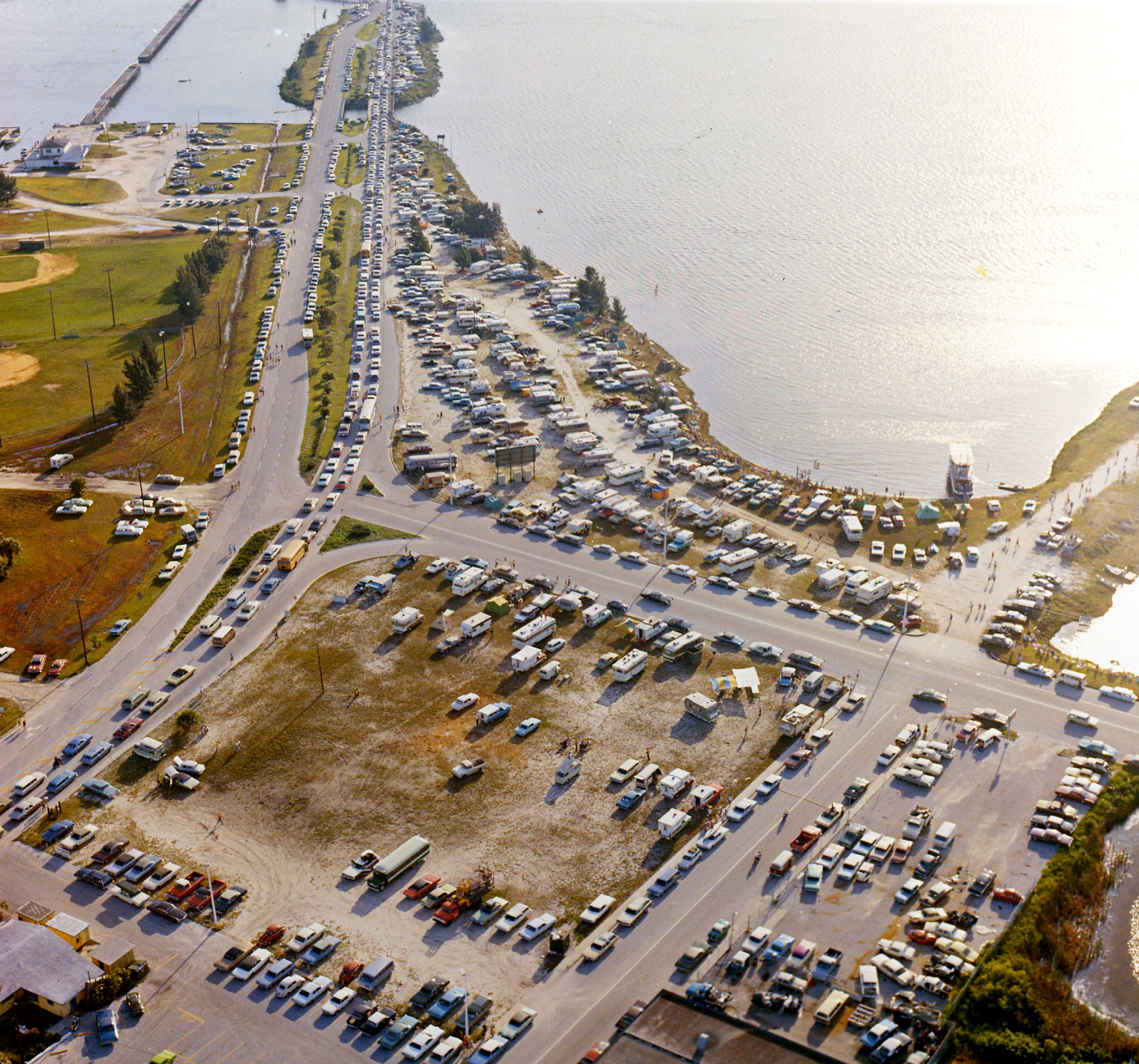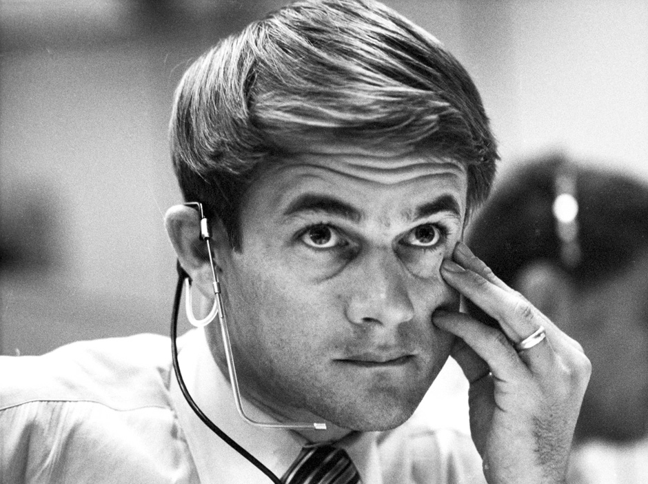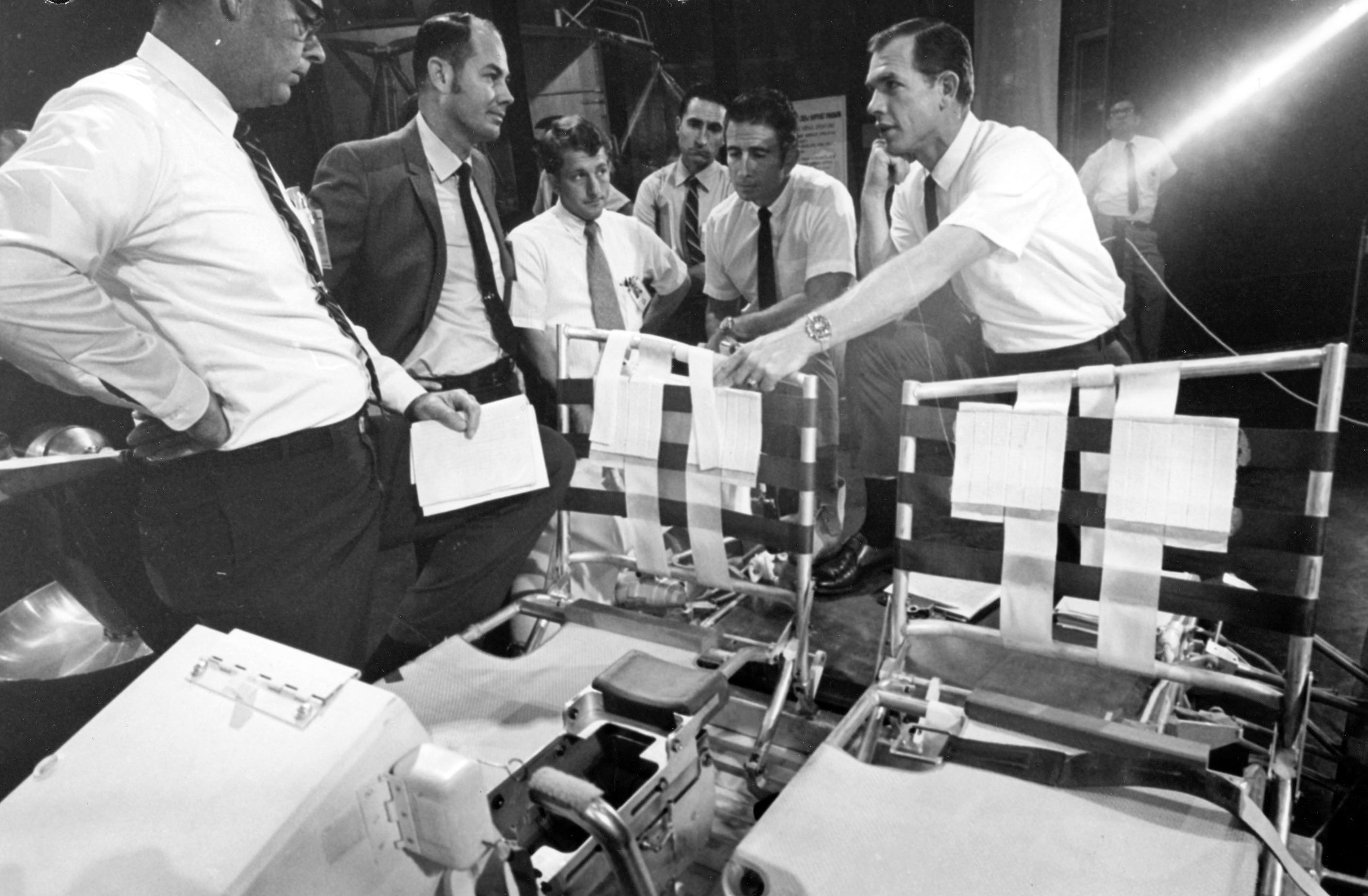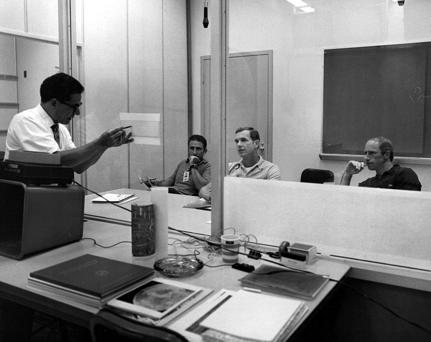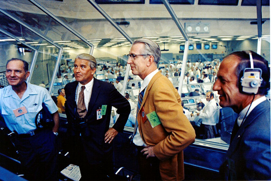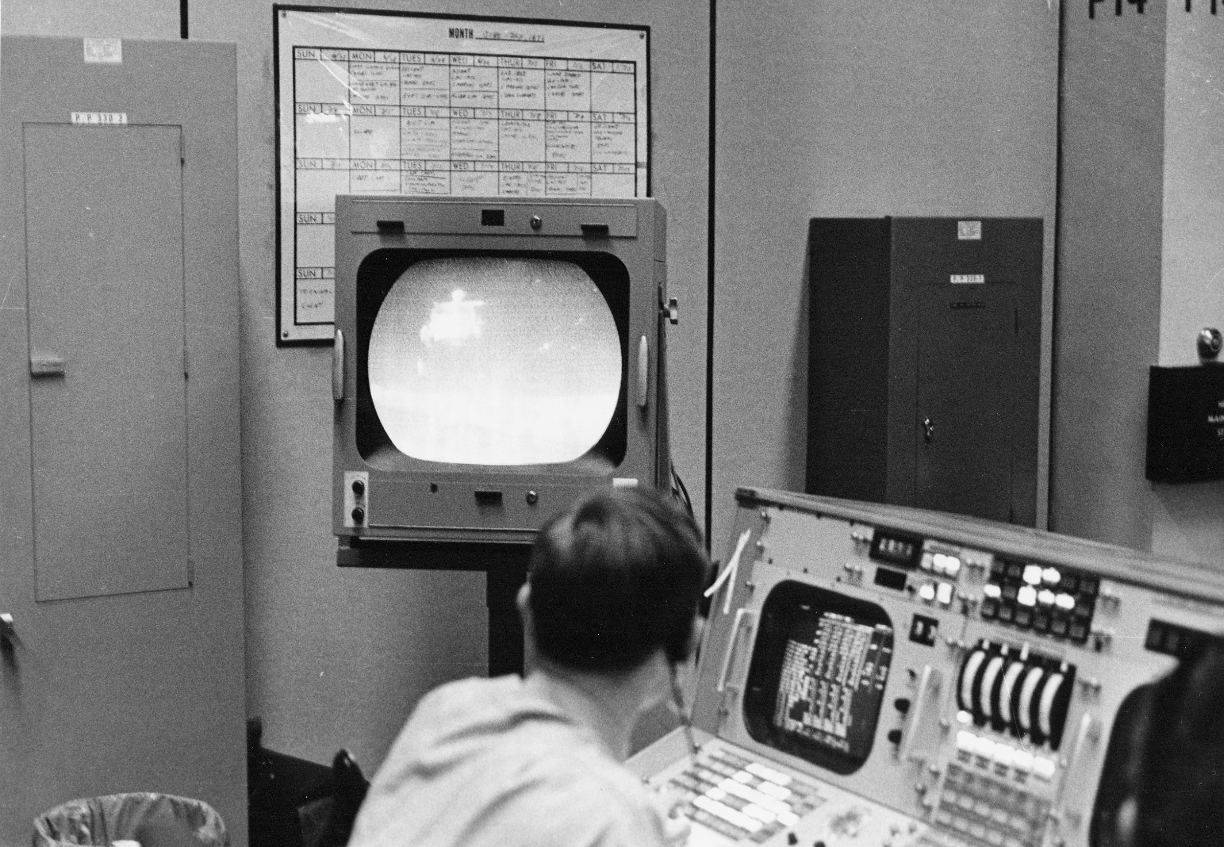 Control Room personnel in Houston watch welcoming ceremonies taking place on the Okinawa. 7 August 1971. Scan by J.L. Pickering.S71-42024 ( 202k )