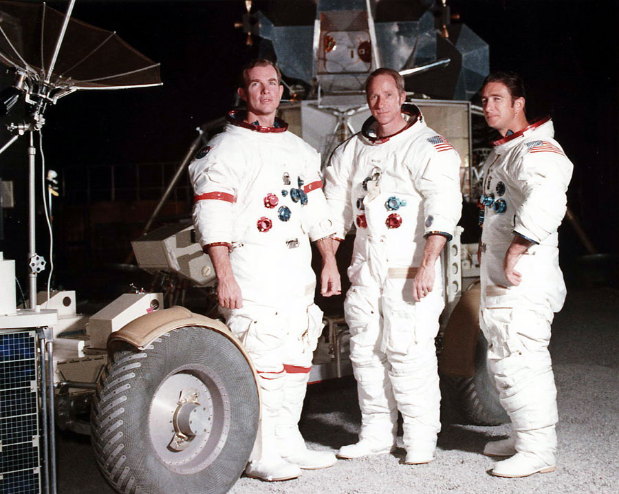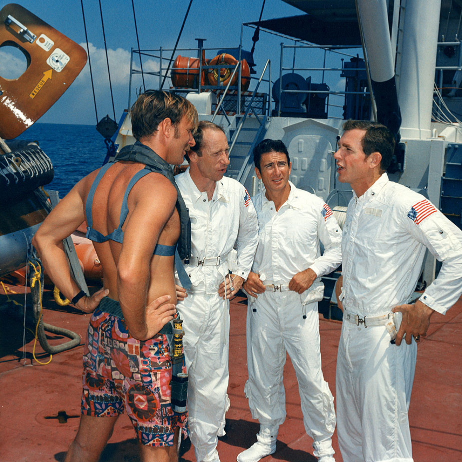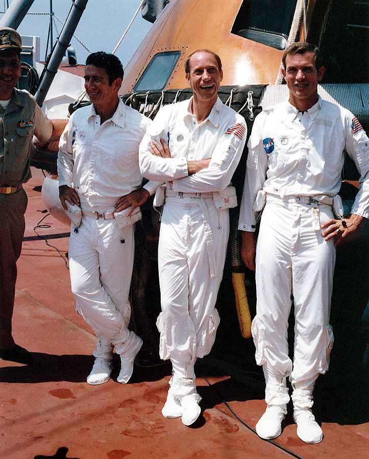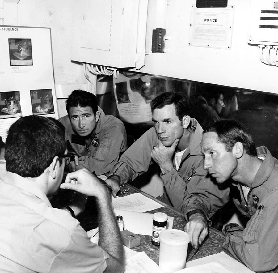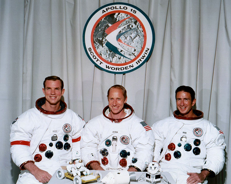 Dave Scott (left), Al Worden, and Jim Irwin aboard the U.S.S. Okinawa after recovery. 7 August 1971. Scan by Kipp Teague.S71-42090 ( 167k )