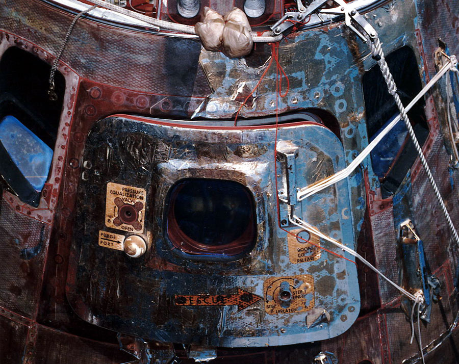 Close-up of the Command Module hatch aboard the U.S.S. Okinawa. Scan by J.L. Pickering.S71-42037 ( 221k )