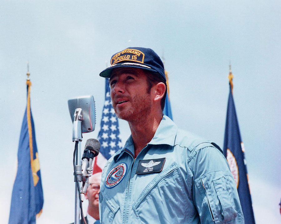 Jim Irwin addresses recovery personnel and dignataries onboard the Okinawa. He has not yet had a chance to shave. 7 August 1971. Scan by J.L. Pickering.S71-42261 ( 135k )