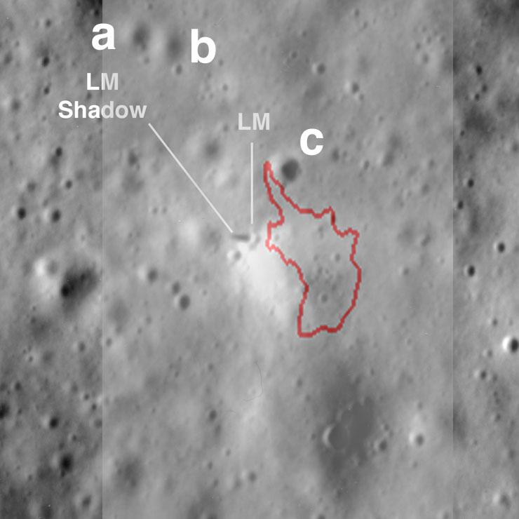 As can be seen from the shadows in the craters, this image was taken with the Sun low in the west. Researchers at the Japan Aerospace Exploration Agency (JAXA) present a version ( 33k ) with a realtively bright area near the known location of the LM outlined in red. The LM landed on the northwest rim of a shallow crater. A comparison ( 152k ) between a detail from Apollo 15 Pan Camera frame 9377 and the Selene/Kaguya image shows that, in the Apollo image, the western portion of the crater interior is bright while in the Selene/Kaguya image, the eastern portion is bright. It seems likely that this difference is due to illumination from the east in the case of the Apollo image and from the west in the case of the Selene/Kaguya image. In both images, the sunlit portion of the crater interior is brighter than other shallow craters in the area, suggesting that the surface layer throughout the crater was brightened by the LM engine exhaust and that the apparent degree of brightening depends on sun angle.Pre-Flight Site Sketch ( 216k )