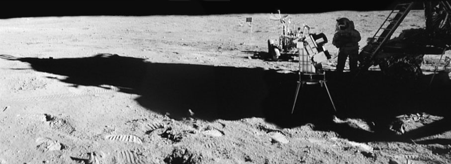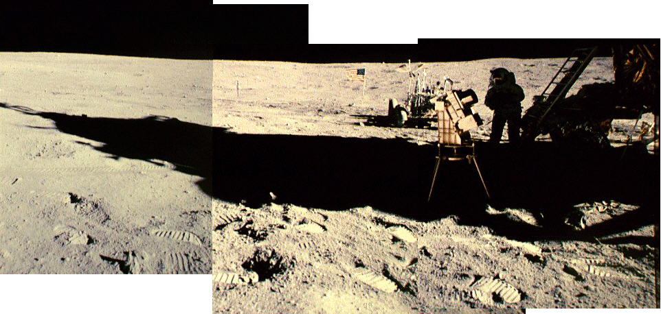 [I have been unable to find these cosmic ray procedures in the checklists.]125:20:42 Young: Okay. That's what it is. Fantastic. (Pause) Okay. It's set away from the Sun on the minus-Y (south footpad).[Fendell stops the pan to look at the U.S. Flag and then pans up and slightly left to find the Rover high-gain antenna.]