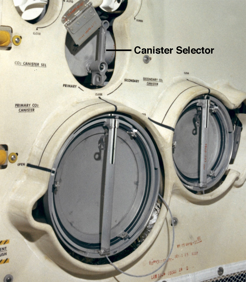 [Had they landed on time and done the first EVA before having a rest period, they would have waited until EVA-2 wake-up to replace the ECS primary cartridge with a fresh one stowed behind the ascent engine cover. (See a detail from an Apollo 16 LM-close-out picture. Because of the landing delay and the decision to postpone EVA-1 till after the first rest period, it is now time to make the rpelacement. They will bring up another primary canister before the end of the EVA and will make another change after EVA-2 wake-up.]117:13:24 Young: You want to switch the LiOH canisters and jettison the used ones.