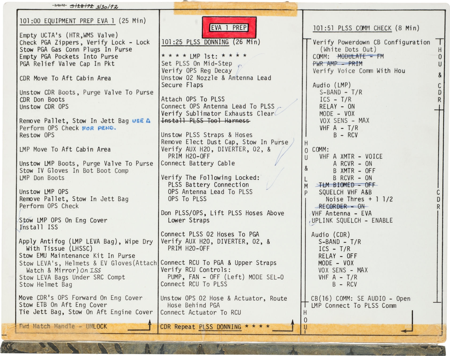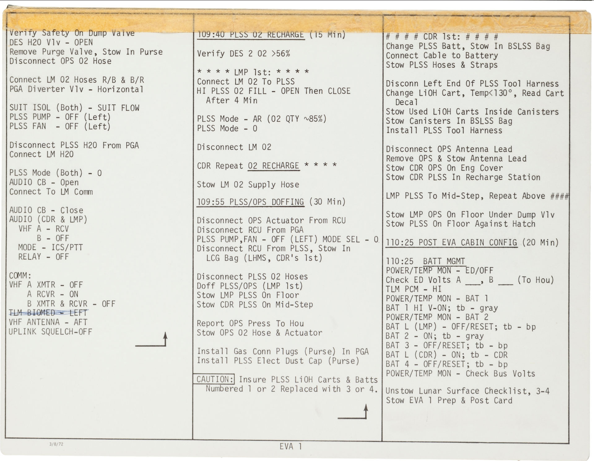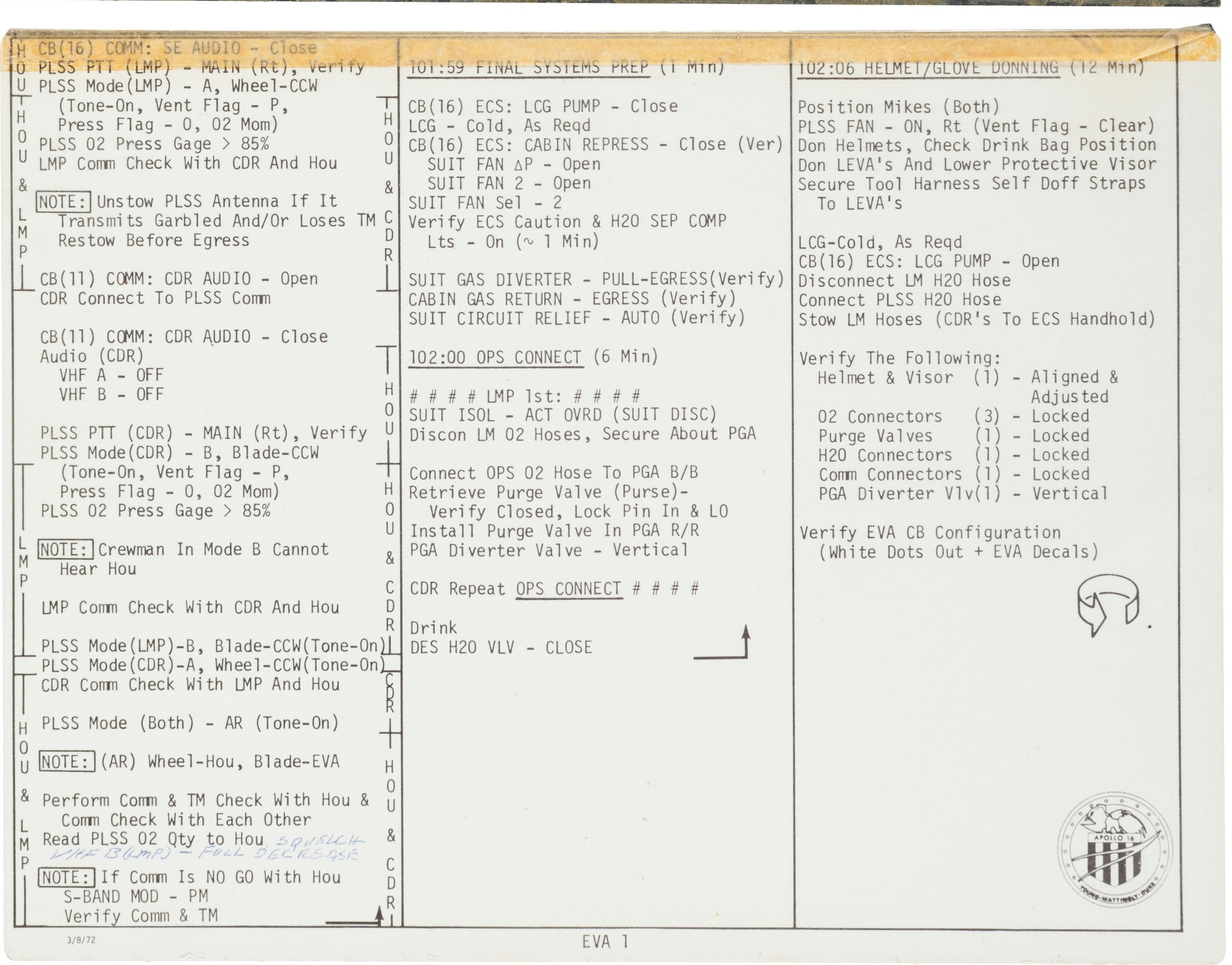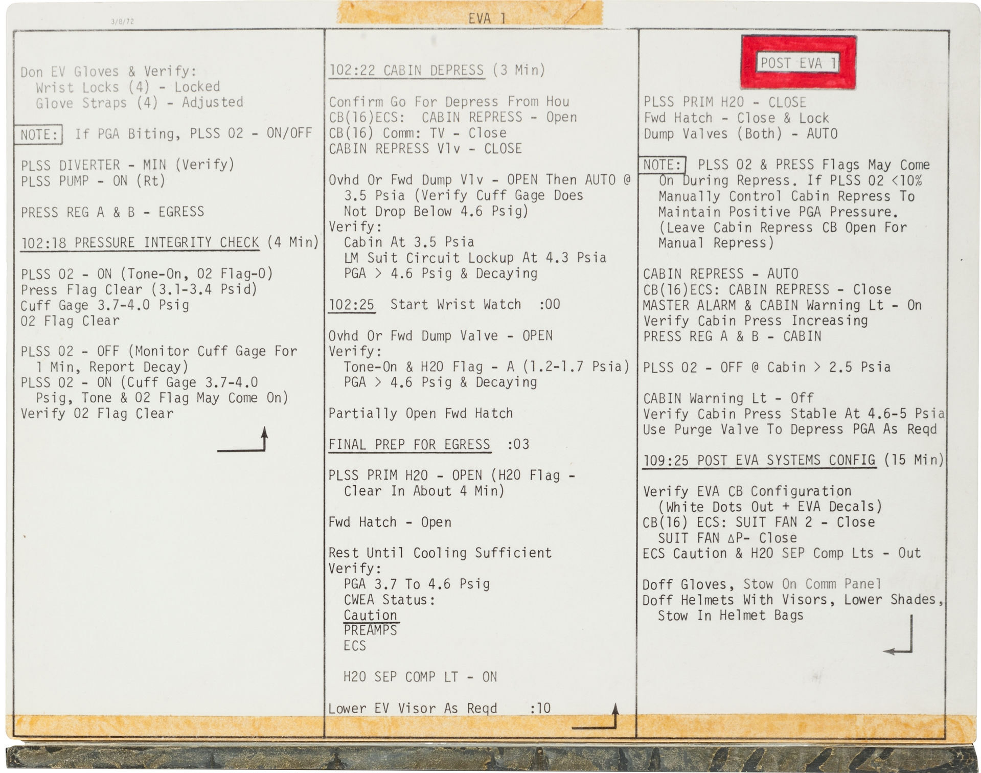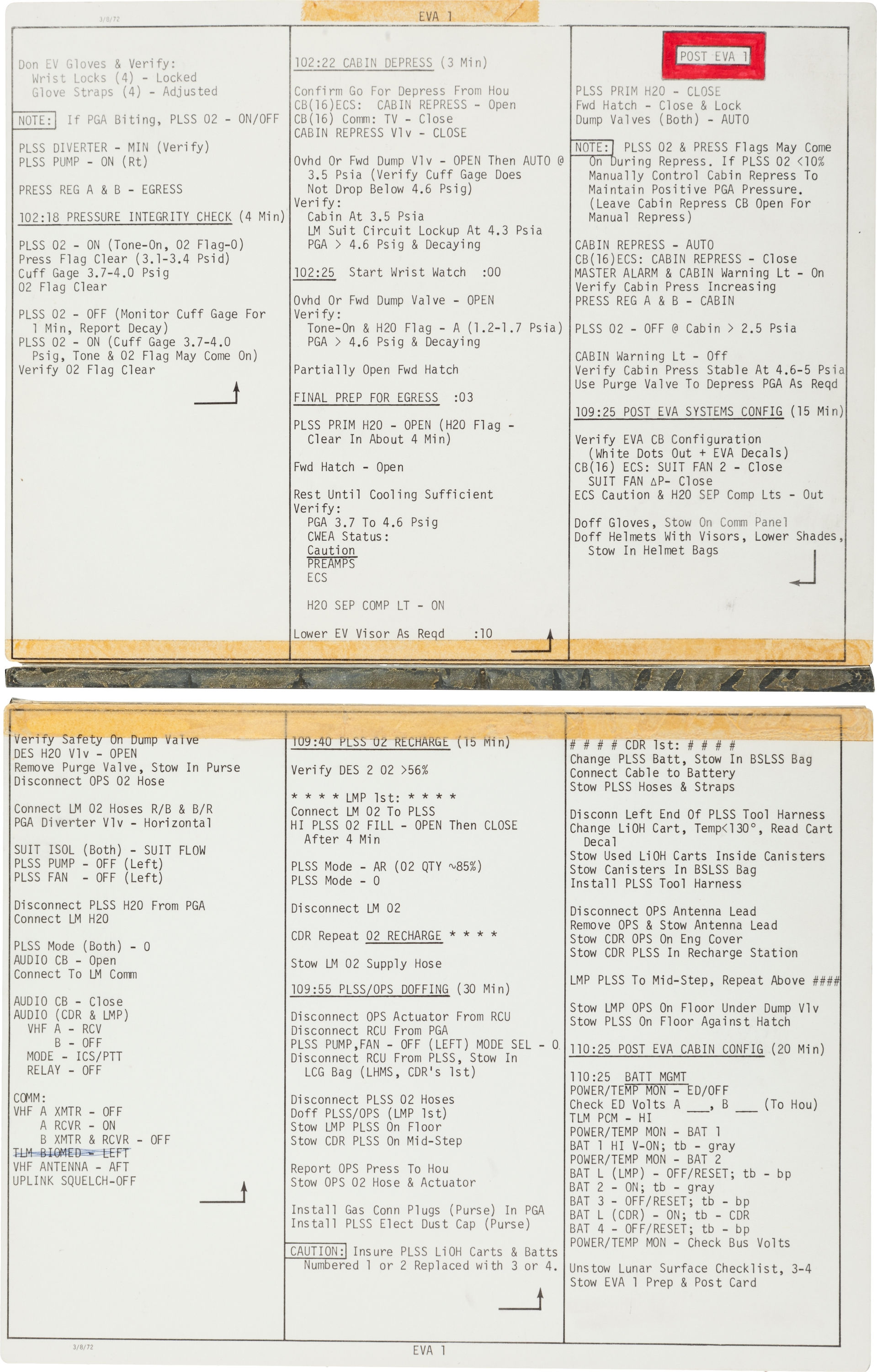 [Rather than use the Lunar Surface Checklist in book form, they have mounted two large cue cards on the instrument panel that has the steps listed on both sides. By using the cards, they won't have to turn pages as often. The second card includes post-EVA procedures. They have a pair of cards for each of the EVAs and one for the contingency of a One-Man EVA in the case that one of the PLSSs is inoperable.]117:14:19 Young: Plug in your water, Charlie.