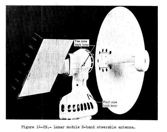 [Duke - "I remember taking a picture of that antenna (AS16-113- 18336, 18337, and 18338). When we first docked with the Lunar Module following trans-lunar insertion, there was a lot of white stuff floating into space. It turned out that it was some paint peeling off. So, when we looked up to take a picture of the antenna, I saw this paint that was curled up. It looked like the sun had hit it, you know? It was peeling off. So that came out in the picture. I don't remember whether this latching mechanism showed up or not."][Figure 14-29 from the Mission Report shows the steerable antenna and latch that failed to release in lunar orbit prior to the landing. See the discussion prior to PDI.]