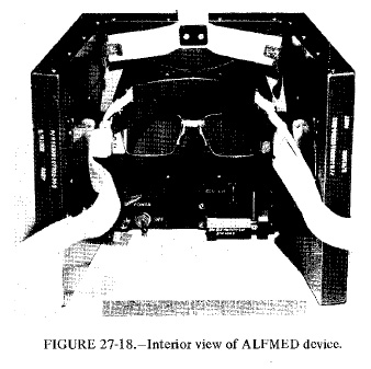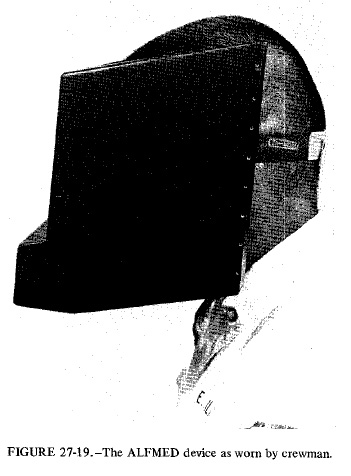 [Here, Charlie is referring to flashes of light that were reported by all of the crews starting with Apollo 11. When they had their eyes closed, the astronauts saw occasional flashes of light (a few per minute) which, it was quickly realized, were probably caused by cosmic rays entering their eyes. The ALFMED (Apollo Light-Flash Moving-Emulsion Detector) was flown on Apollo 16 to determine the precise mechanism involved. The device is shown in Figures 27-17, 27-18, and 27-19 from the Apollo 16 Preliminary Science Report and contained sets of photographic plates which were used to determine the characteristics of the cosmic ray particles that excited flashes what were verbally reported by an astronaut while wearing the device. Charlie wore the ALFMED for one hour on the Translunar portion of the mission and, as well, for an hour during the TransEarth coast. During those same times, John wore eye shades and reported any flashes he saw. The subject wearing an ALFMED in Figure 27-19 may be E. (Buzz) Aldrin, who left NASA in July 1971.]116:17:28 England: Okay, did you notice any change in frequency?[Journal Contributor David Woods calls our attention to the following from Apollo 11 CMP Michael Collins' superb Carrying the Fire: "(I) did not notice any in flight...but now I can make my imagination work either for or against the idea and conjure up a darkness which is either absolute or penetrated occasionally by a tiny white streak crossing my retina. Unable to make an honest contribution, I stay out of the conversation."]