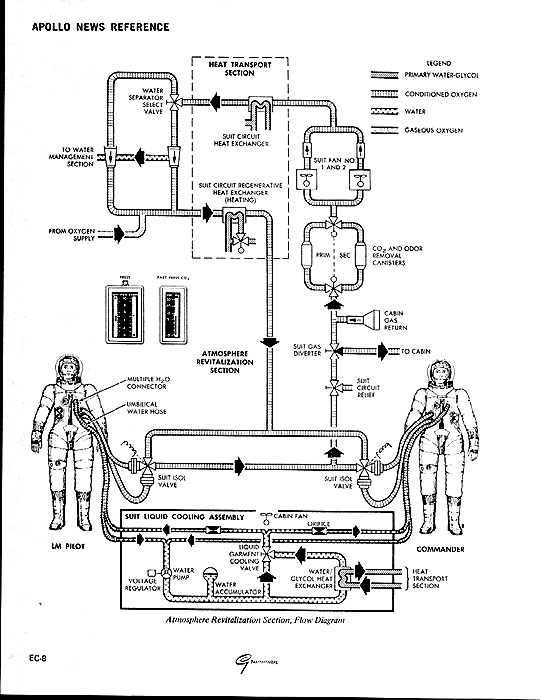 [By putting the PLSS diverter valve in the horizontal position, they will get some oxygen flow into the suit torso once they get connected to the ECS.]150:08:20 Duke: (Grunting) I go to Suit Flow in the (garbled)