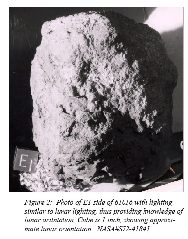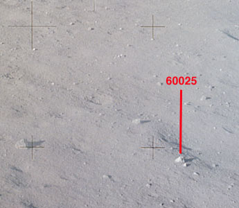 [Charlie picks up sample 60025, the 1.8-kg rock John collected a few minutes earlier, and examines it. In the background, John goes to the UV camera.]143:23:03 Young: Okay, Houston; going to Reset. It worked. (Long Pause)[Readers should note that zero azimuth on the UV camera is west, rather than north. Consequently, the new azimuth is just slightly west of south.]