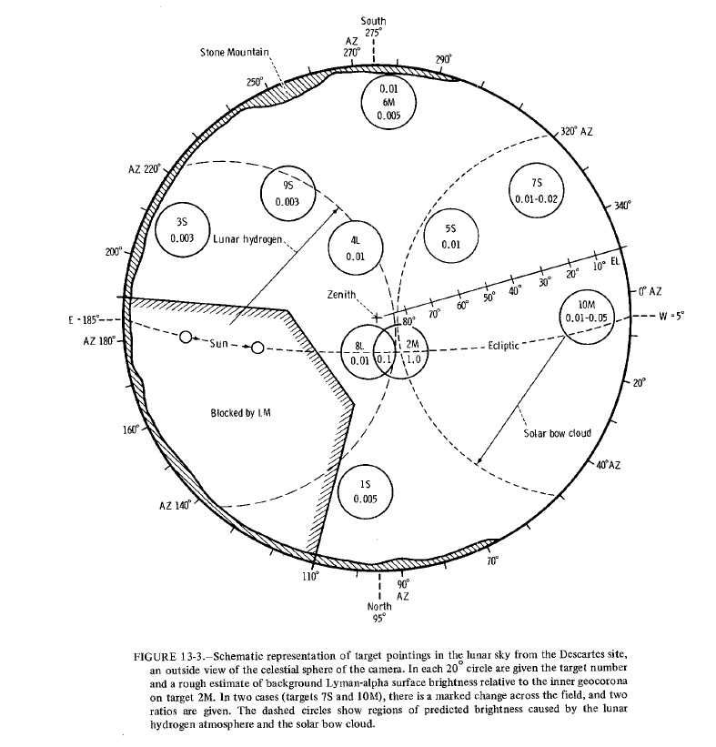 [Before the flight, some of the geologists believed that Stone Mountain was a volcanic construct and, here, the UV camera is being pointed in the general direction of the Mountain to look for telltale emissions. As indicated in Figure 13-3 in the Preliminary Science Report, the field-of-view is about 20 degrees across.]143:24:04 Young: Okay; fine. (Pause) That's set, and she's working.[Charlie puts the rock back in the LMP seat pan and closes the seat. He then adjusts the 16-mm camera.]