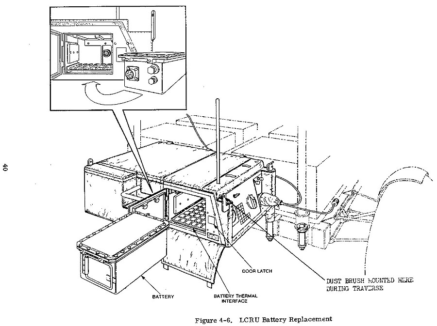[John reported the battery temperature at 165:42:13. Near the UV camera, John bobs to one knee twice, undoubtedly to retrieve something.]166:01:16 Duke: Okay, Tony. I'm going to put you on (pause) (LCRU Mode Switch) position 1 (as per LMP-29).