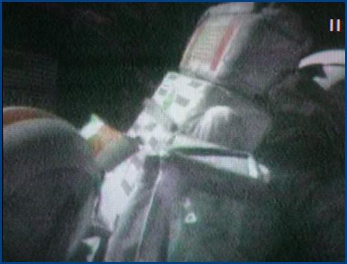 [After getting the strap threaded through a fabric loop near the bottom on the PLSS-ward side of the SCB, John kneels so he can press the Velcro patch on the end of the strap to the corresponding patch sewn on the bottom of Charlie's PLSS. This may be the best record of an SCB attachment in the Apollo video record. John stands, flips the top of the SCB closed, and then steps forward to press the latch closed.]166:00:11 Young: Okay, Charlie. Let me close your top there. Okay?